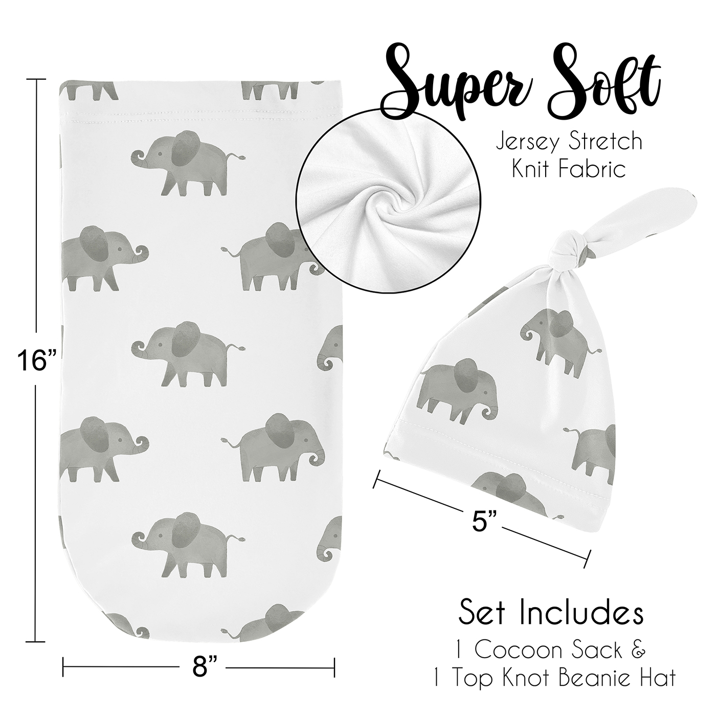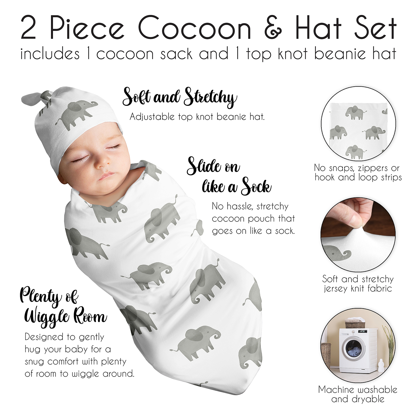 Sweet Jojo Designs cocoon swaddles are designed to gently hug baby for a snuggly comfort. These little sleep sacks let your infant's arms, hips and legs feel snuggled up in a stylish pouch. Made from soft and stretchy jersey knit cotton to provide warmth and security by gently hugging your newborn. Set includes a sleep sack and a matching top knot beanie hat that makes them the perfect outfit to keep your little bundle of joy feel cozy and comfortable.