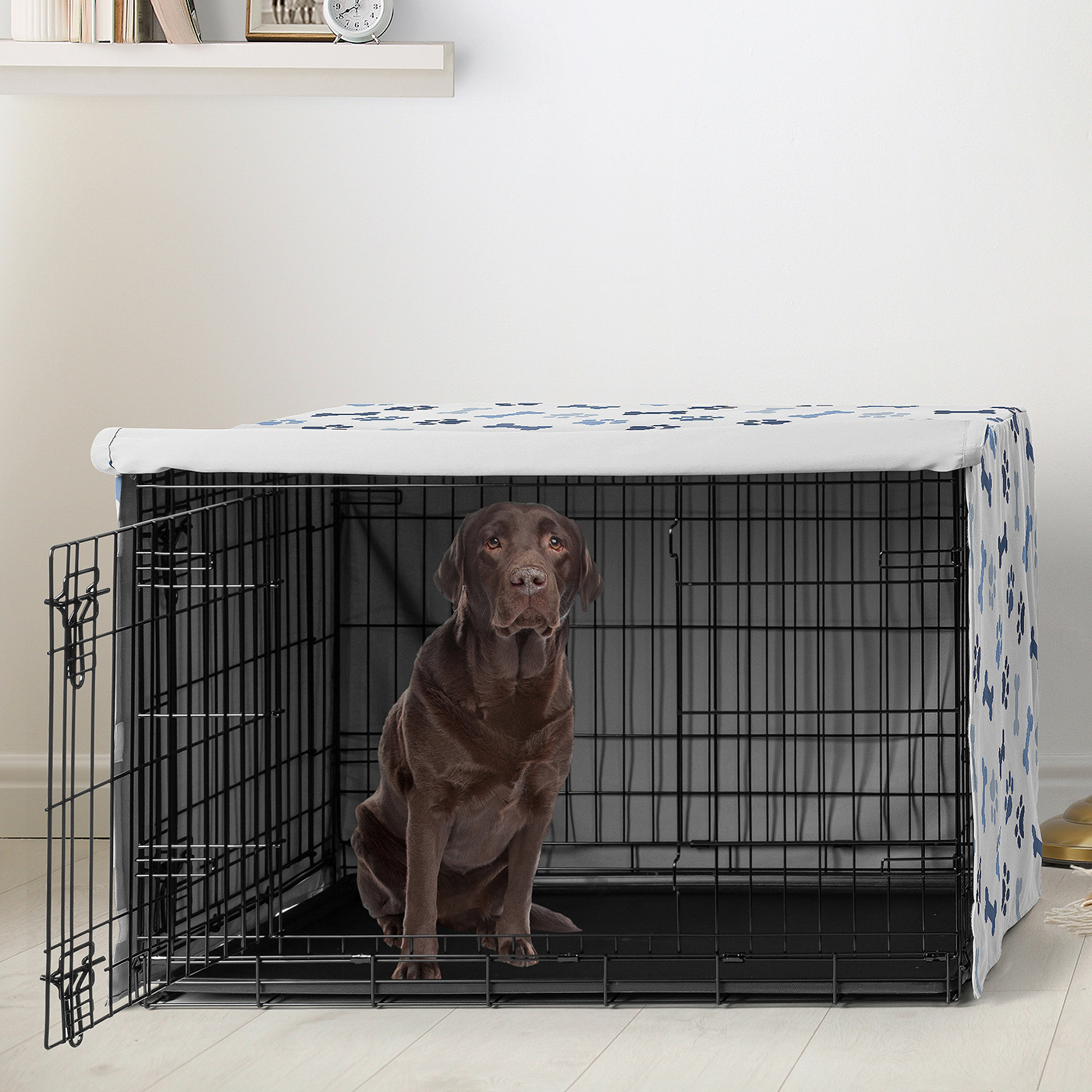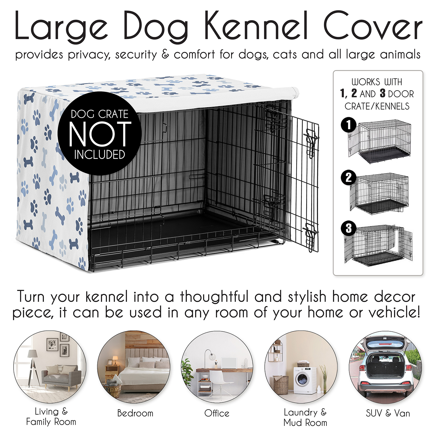 42in. DOG CRATE COVER INCLUDES: (1) 42in. x 28.5in. x 30in. Kennel Cover ONLY. Designed in the USA by lovers of both pets and home decor! Machine washable, tumble dry low. This vibrant dog kennel cover for boy pets would pair perfectly with coordinating bedding sets and match with the Modern, Cartoon, Doggy, Puppy, Neutral, Blue Bones and Paw Print Collection accessories to complete your bedroom look. Use it in your bedroom, kitchen or living room for the perfect decor addition.MODERN PET-FRIENDLY DECOR: This medium/large dog crate cover boasts an exclusive design featuring slate and navy blue puppy bone modern neutral paw prints. Machine washable. Tumble dry low. DOG KENNEL COVER ONLY – DOG CAGE/CRATE/KENNEL NOT INCLUDED.CARTOON PUPPY BONE DESIGN: This durable and stylish dog crate cover is the best way to create a comfortable and cozy space for your four legged friend with a protective fabric that securely covers the top of your pets cage for a dark and tranquil crate at all times. Give your puppy a space where they can rest and relax after a long day of playing or secure flaps with our hook and loop closure design to allow your pet to enter and exit as they please. DESIGNED IN THE USA: By real pet owners who understand the need for comfort, practicality, and style. Include your furry little one in your home room decoration! This kennel crate cover adds style and function to any home while creating a cozy, secure space for your pets. Each crate cover reflects a love for dogs while providing a practical, stylish solution for crate-trained pets.MATCHING DECOR & ACCESORIES: Match your favorite Sweet Jojo Designs home decor with our kennel covers for dogs to coordinate perfectly and create a cohesive look and adds a personalized touch to your space! Complete any room in your home with our coordinating room decor such as window treatment panels, throw pillows, bedding sets, hampers, wall decor, sheet sets, shower curtains, memo boards and more. Item# Crate-42-Paw-Bone-NV-PRT