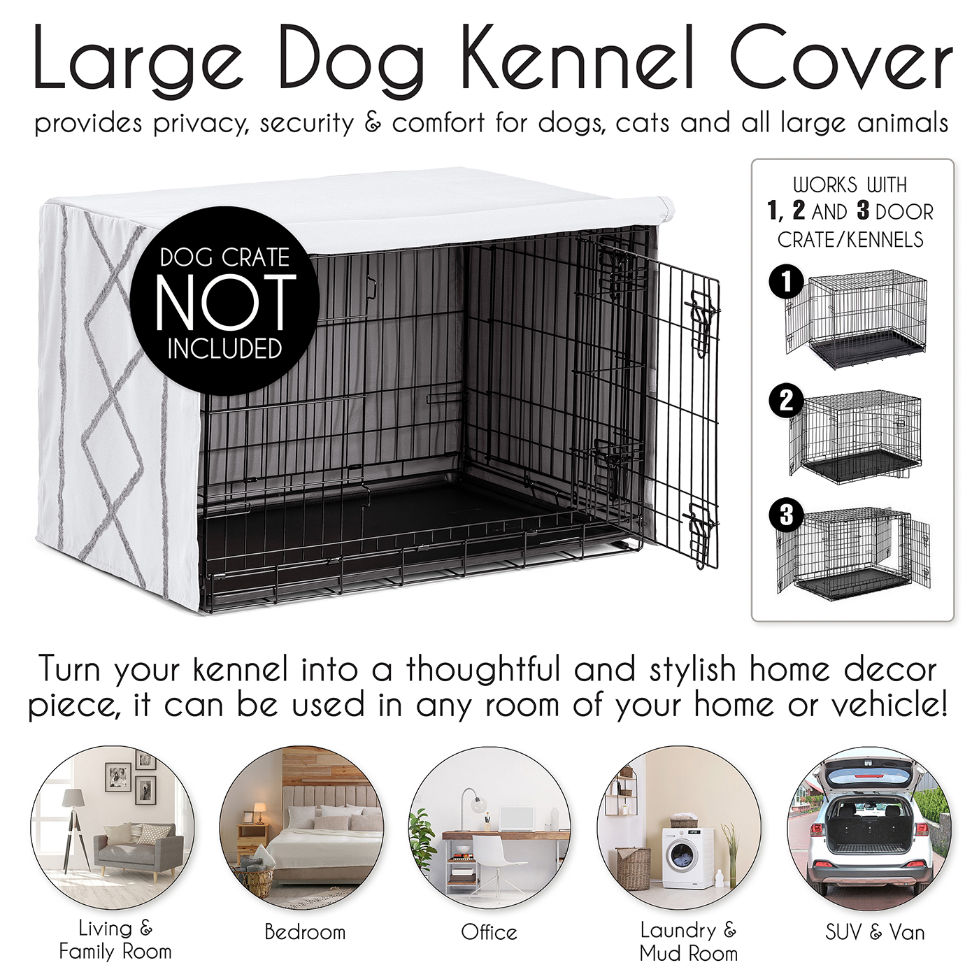48in. DOG CRATE COVER INCLUDES: (1) 48in. x 30.5in. x 32.5in. Kennel Cover ONLY. Designed in the USA by lovers of both pets and home decor! Machine washable, tumble dry low. This vibrant dog kennel cover for girls pets would pair perfectly with coordinating bedding sets and match with the Modern, Designer, Elegant Boho Fringe White and Grey Collection accessories to complete your bedroom look. Use it in your bedroom, kitchen, living room or office for the perfect decor addition.MODERN PET-FRIENDLY DECOR: This large dog crate cover boasts an elegant design featuring white and grey bohemian macrame fringe and tufted trimmings. Machine washable. Tumble dry low. DOG KENNEL COVER ONLY – DOG CAGE/CRATE/KENNEL NOT INCLUDED.MINIMALIST DESIGNER DESIGN: This durable and stylish dog crate cover is the best way to create a comfortable and cozy space for your four legged friend with a protective fabric that securely covers the top of your pets cage for a dark and tranquil crate at all times. Give your puppy a space where they can rest and relax after a long day of playing or secure flaps with our hook and loop closure design to allow your pet to enter and exit as they please. DESIGNED IN THE USA: By real pet owners who understand the need for comfort, practicality, and style. Include your furry little one in your home room decoration! This kennel crate cover adds style and function to any home while creating a cozy, secure space for your pets. Each crate cover reflects a love for dogs while providing a practical, stylish solution for crate-trained pets.MATCHING DECOR & ACCESORIES: Match your favorite Sweet Jojo Designs home decor with our kennel covers for dogs to coordinate perfectly and create a cohesive look and adds a personalized touch to your space! Complete any room in your home with our coordinating room decor such as window treatment panels, throw pillows, bedding sets, hampers, wall decor, sheet sets, shower curtains, memo boards and more. Item# Crate-48-BohoFringe-WH-GREY