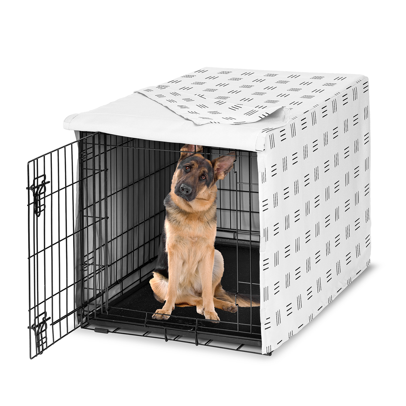 48in. DOG CRATE COVER INCLUDES: (1) 48in. x 30.5in. x 32.5in. Kennel Cover ONLY. Designed in the USA by lovers of both pets and home decor! Machine washable, tumble dry low. This vibrant dog kennel cover pets would pair perfectly with coordinating bedding sets and match with the Modern, Bohemian, Minimalist, Southwest White and Black Hatch Collection accessories to complete your bedroom look. Use it in your bedroom, kitchen, living room or office for the perfect decor addition.MODERN PET-FRIENDLY DECOR: This large dog crate cover boasts an exclusive design featuring white and black bohemian, minimalist, southwest, mud cloth, hatch, neutral, boho, mudcloth and triple lines print. Machine washable. Tumble dry low. DOG KENNEL COVER ONLY – DOG CAGE/CRATE/KENNEL NOT INCLUDED.MINIMALIST DESIGNER DESIGN: This durable and stylish dog crate cover is the best way to create a comfortable and cozy space for your four legged friend with a protective fabric that securely covers the top of your pets cage for a dark and tranquil crate at all times. Give your puppy a space where they can rest and relax after a long day of playing or secure flaps with our hook and loop closure design to allow your pet to enter and exit as they please. DESIGNED IN THE USA: By real pet owners who understand the need for comfort, practicality, and style. Include your furry little one in your home room decoration! This kennel crate cover adds style and function to any home while creating a cozy, secure space for your pets. Each crate cover reflects a love for dogs while providing a practical, stylish solution for crate-trained pets.MATCHING DECOR & ACCESORIES: Match your favorite Sweet Jojo Designs home decor with our kennel covers for dogs to coordinate perfectly and create a cohesive look and adds a personalized touch to your space! Complete any room in your home with our coordinating room decor such as window treatment panels, throw pillows, bedding sets, hampers, wall decor, sheet sets, shower curtains, memo boards and more. Item# Crate-48-Hatch-WH-BK
