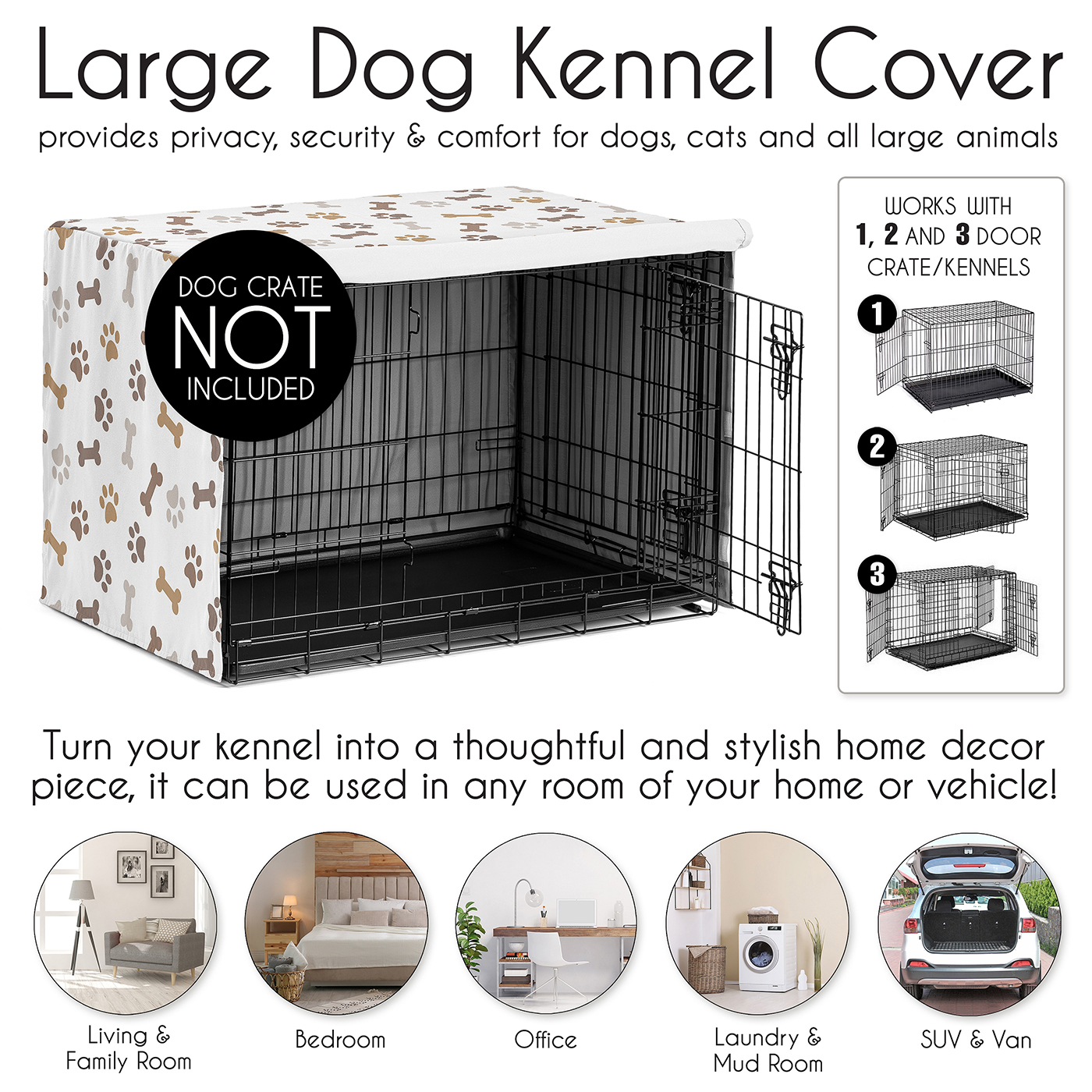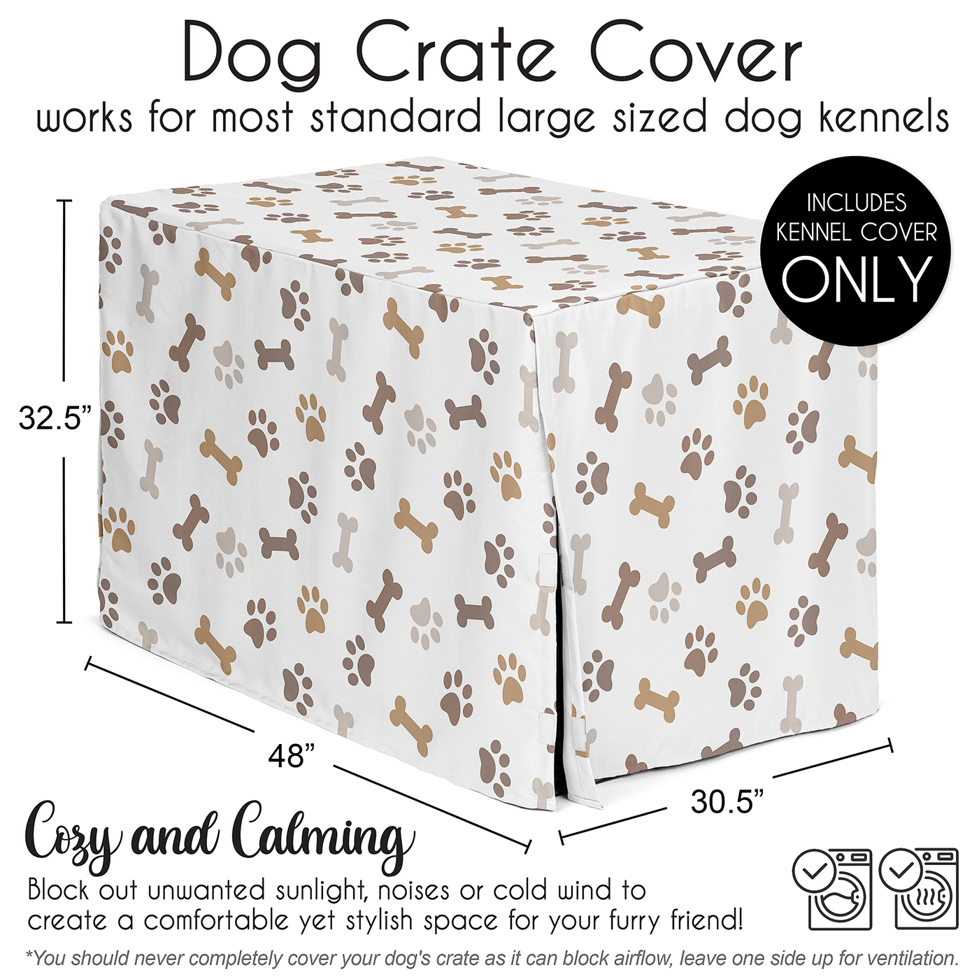 48in. DOG CRATE COVER INCLUDES: (1) 48in. x 30.5in. x 32.5in. Kennel Cover ONLY. Designed in the USA by lovers of both pets and home decor! Machine washable, tumble dry low. This vibrant dog kennel cover pets would pair perfectly with coordinating bedding sets and match with the Modern, Cartoon, Doggy, Puppy, Neutral, Brown Bones and Paw Print Collection accessories to complete your bedroom look. Use it in your bedroom, kitchen, living room or office for the perfect decor addition.MODERN PET-FRIENDLY DECOR: This large dog crate cover boasts an exclusive design featuring slate and brown, taupe and tan puppy bone modern neutral paw prints. Machine washable. Tumble dry low. DOG KENNEL COVER ONLY – DOG CAGE/CRATE/KENNEL NOT INCLUDED.CARTOON PUPPY BONE DESIGN: This durable and stylish dog crate cover is the best way to create a comfortable and cozy space for your four legged friend with a protective fabric that securely covers the top of your pets cage for a dark and tranquil crate at all times. Give your puppy a space where they can rest and relax after a long day of playing or secure flaps with our hook and loop closure design to allow your pet to enter and exit as they please. DESIGNED IN THE USA: By real pet owners who understand the need for comfort, practicality, and style. Include your furry little one in your home room decoration! This kennel crate cover adds style and function to any home while creating a cozy, secure space for your pets. Each crate cover reflects a love for dogs while providing a practical, stylish solution for crate-trained pets.MATCHING DECOR & ACCESORIES: Match your favorite Sweet Jojo Designs home decor with our kennel covers for dogs to coordinate perfectly and create a cohesive look and adds a personalized touch to your space! Complete any room in your home with our coordinating room decor such as window treatment panels, throw pillows, bedding sets, hampers, wall decor, sheet sets, shower curtains, memo boards and more. Item# Crate-48-Paw-Bone-BR-PRT