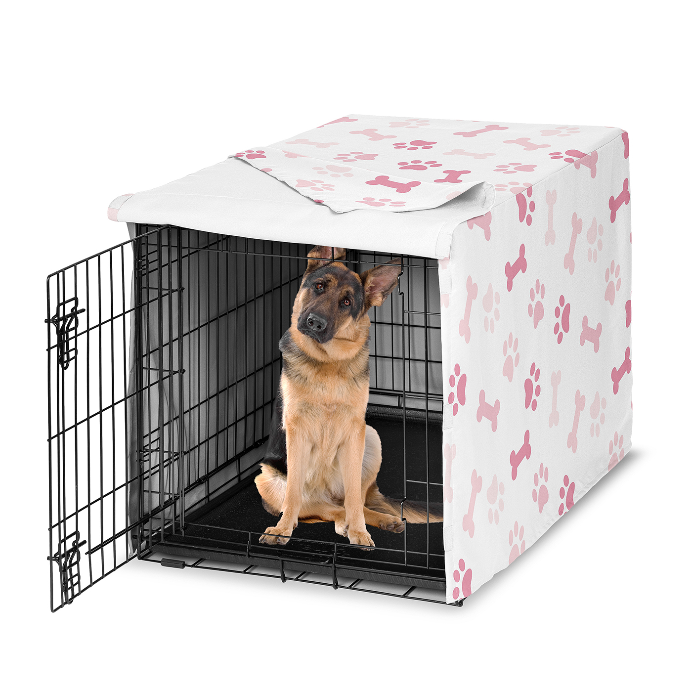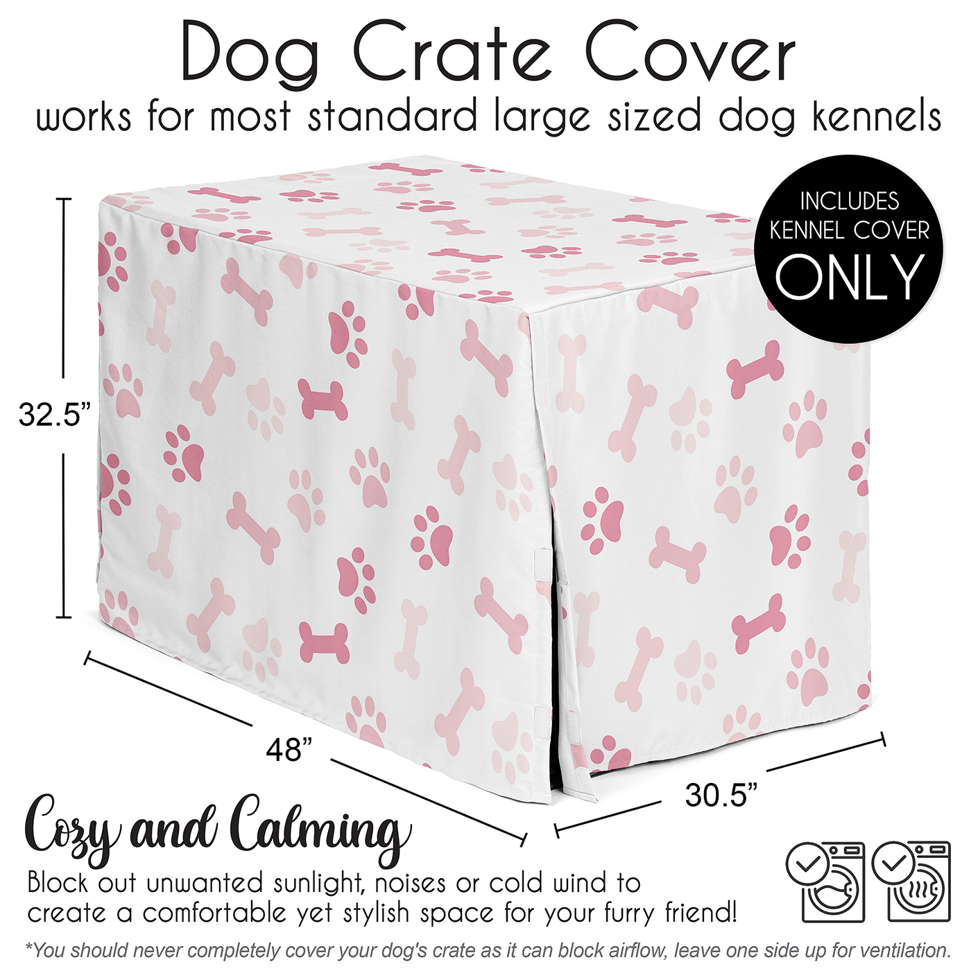 48in. DOG CRATE COVER INCLUDES: (1) 48in. x 30.5in. x 32.5in. Kennel Cover ONLY. Designed in the USA by lovers of both pets and home decor! Machine washable, tumble dry low. This vibrant dog kennel cover pets would pair perfectly with coordinating bedding sets and match with the Modern, Cartoon, Doggy, Puppy, Neutral, Pink Bones and Paw Print Collection accessories to complete your bedroom look. Use it in your bedroom, kitchen or living room for the perfect decor addition.CARTOON PUPPY BONE DESIGN: This girls large dog crate cover boasts an exclusive design featuring shades of pink puppy bone modern neutral paw prints. Machine washable. Tumble dry low. DOG KENNEL COVER ONLY – DOG CAGE/CRATE/KENNEL NOT INCLUDED.MODERN PET-FRIENDLY DECOR: This durable and stylish dog crate cover is the best way to create a comfortable and cozy space for your four legged friend with a protective fabric that securely covers the top of your pets cage for a dark and tranquil crate at all times. Give your puppy a space where they can rest and relax after a long day of playing or secure flaps with our hook and loop closure design to allow your pet to enter and exit as they please.DESIGNED IN THE USA: By real pet owners who understand the need for comfort, practicality, and style. Include your furry little one in your home room decoration! This kennel crate cover adds style and function to any home while creating a cozy, secure space for your pets. Each crate cover reflects a love for dogs while providing a practical, stylish solution for crate-trained pets.MATCHING DECOR & ACCESORIES: Match your favorite Sweet Jojo Designs home decor with our kennel covers for dogs to coordinate perfectly and create a cohesive look and adds a personalized touch to your space! Complete any room in your home with our coordinating room decor such as window treatment panels, throw pillows, bedding sets, hampers, wall decor, sheet sets, shower curtains, memo boards and more.Item# Crate-48-Paw-Bone-PK-PRT