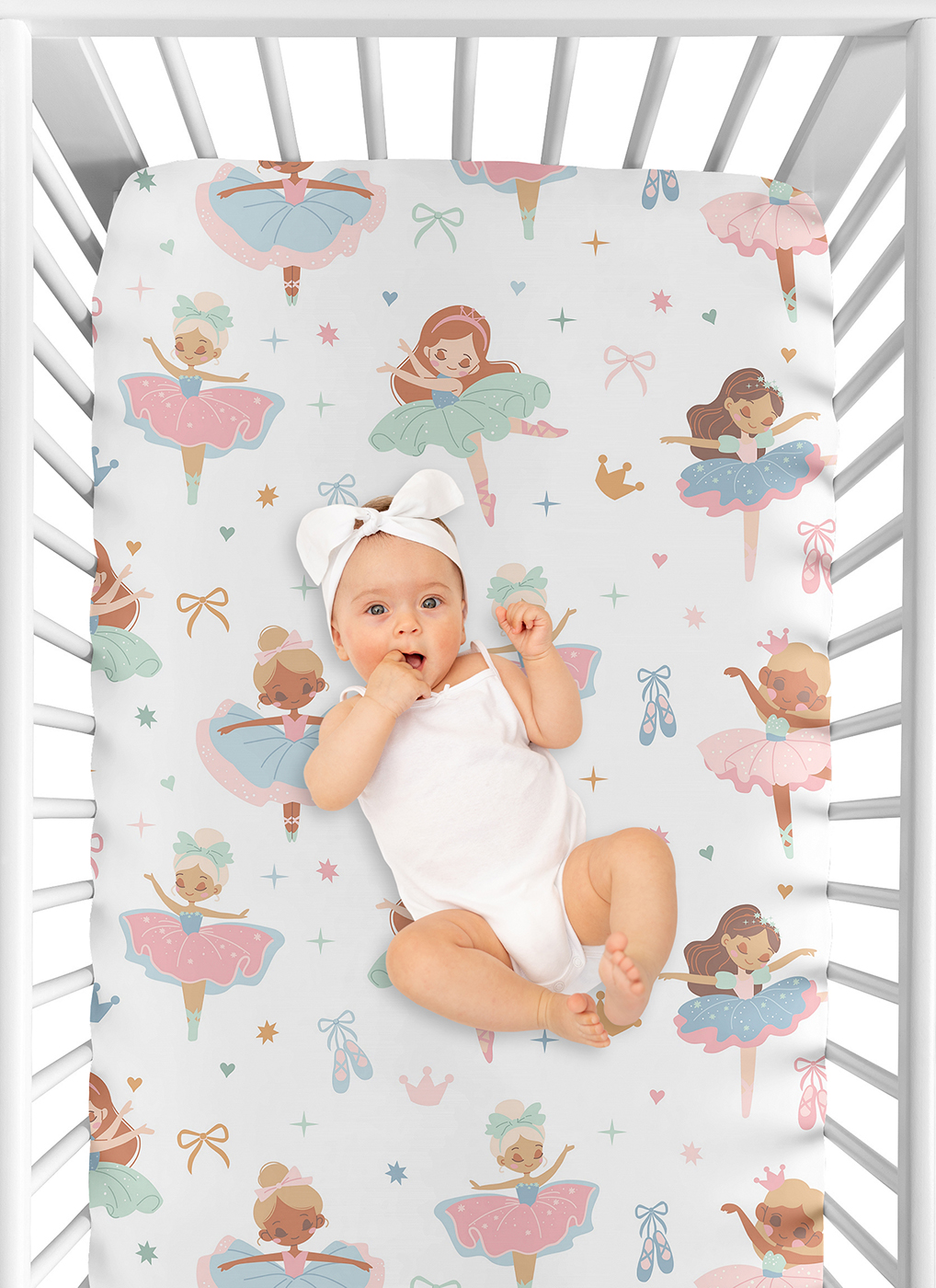Includes: (1) Fitted Crib Sheet: 52in. x 28in. x 8in. Easy machine washable, tumble dry low.This brushed microfiber crib sheet features an exclusive design of a blush pink, blue, green and orange ballet shoes hearts sparkles crown bows multicolored princess dancers and black ballerina tutus.A crib mattress sheet is essential for your baby's comfort and ensuring a soft, breathable surface for restful sleep. This newborn crib sheet fits snugly over the mattress, providing a secure and smooth fit that reduces shifting and bunching. Adding a crib mattress sheet to your gift registry is a thoughtful way to prepare for your baby’s arrival, as it’s a practical and useful item every parent will need. And remember, you can never have too many baby sheets!Add a baby cribsheet to your list of must haves for your little one! This soft crib sheet is stretchy and comfortable to give your infant or toddler the perfect setting for a good night’s rest. It’s thoughtfully designed with elastic sewn around the entire bottom edge of the sheet for a secure fit on most standard sized cribs and toddler beds. Use one crib sheet in your newborns bed and have spares nearby to swap in between washes and to be prepared if an accident happens in the crib. The interior design of a nursery can be planned entirely around a single focal point like the crib sheet. It makes the perfect gift with one of Sweet Jojo Designs coordinating crib bed sets, changing pad covers, nursing pillow covers, nursery room decoration accessories and window treatments. Include one in your baby shower gift basket, gender reveal presents or add to your baby gift registry to ensure you have all you need to complete your Sweet Jojo Designs baby bed room look.Item# CribSheet-Ballet-PRT