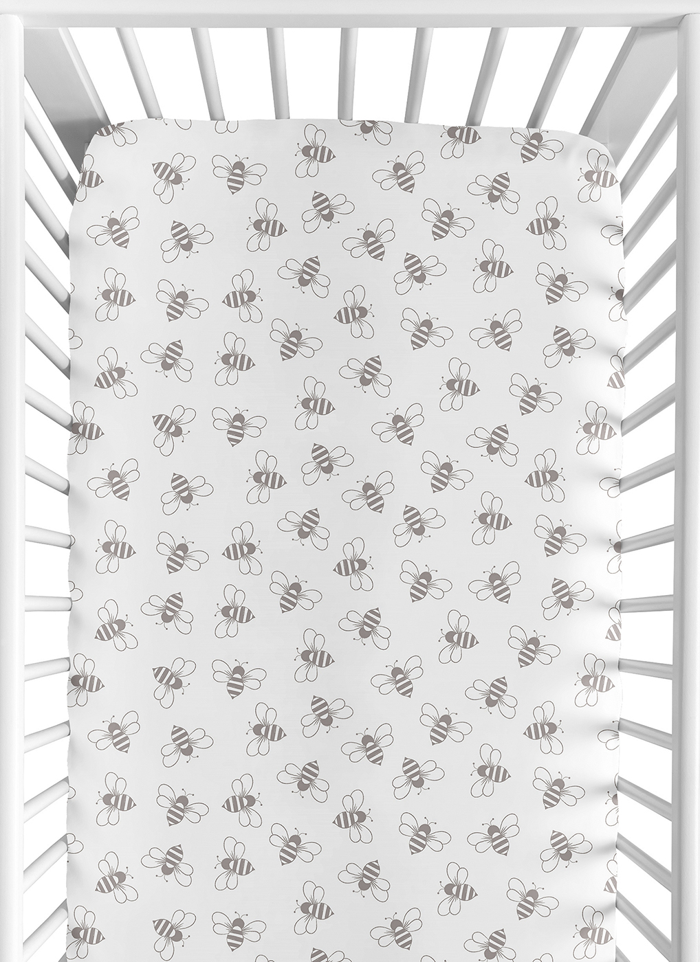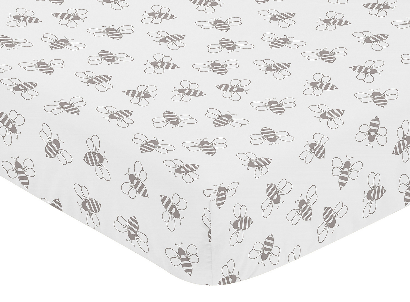 This brushed microfiber crib sheet features an exclusive design of a white and grey abstract honeybee bumblebee flying bees print.