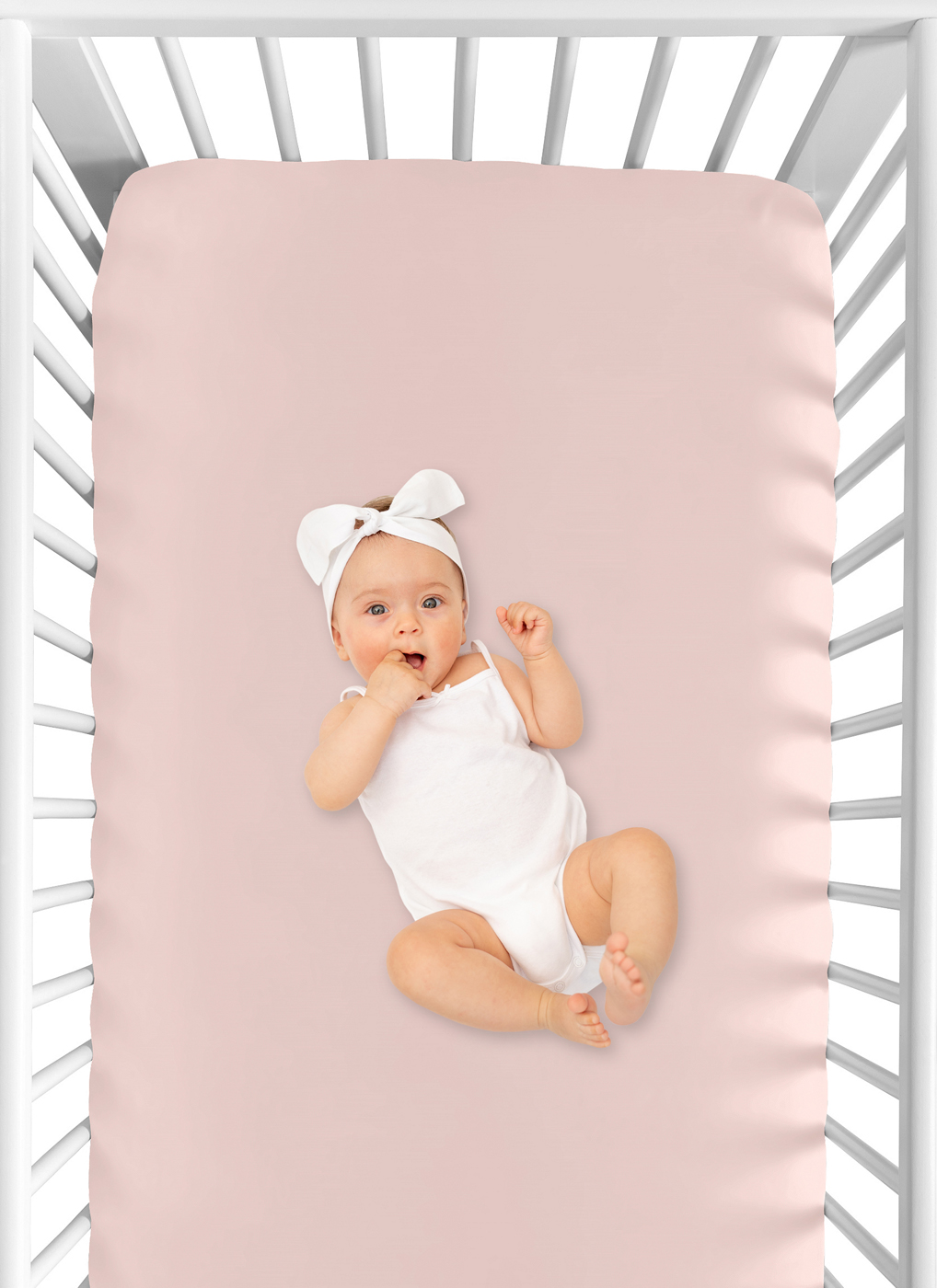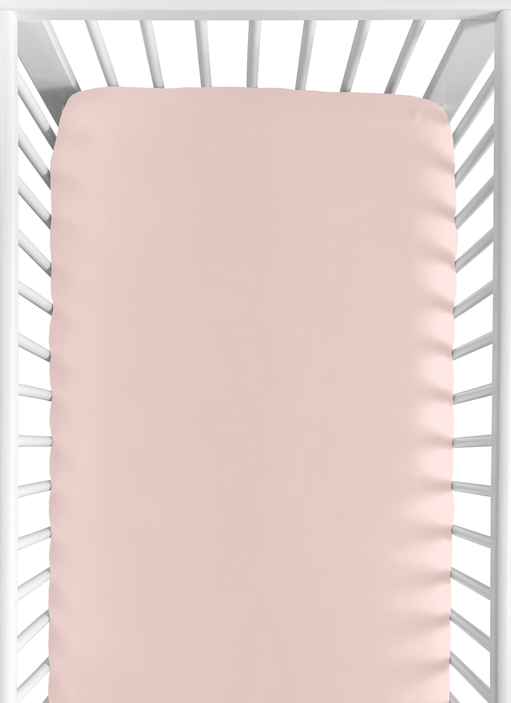 This cotton crib sheet features an exclusive design of solid light color blush pink and made to match the shabby chic farmhouse designer modern elegant bohemian Boho Fringe Pink and Ivory Collection.