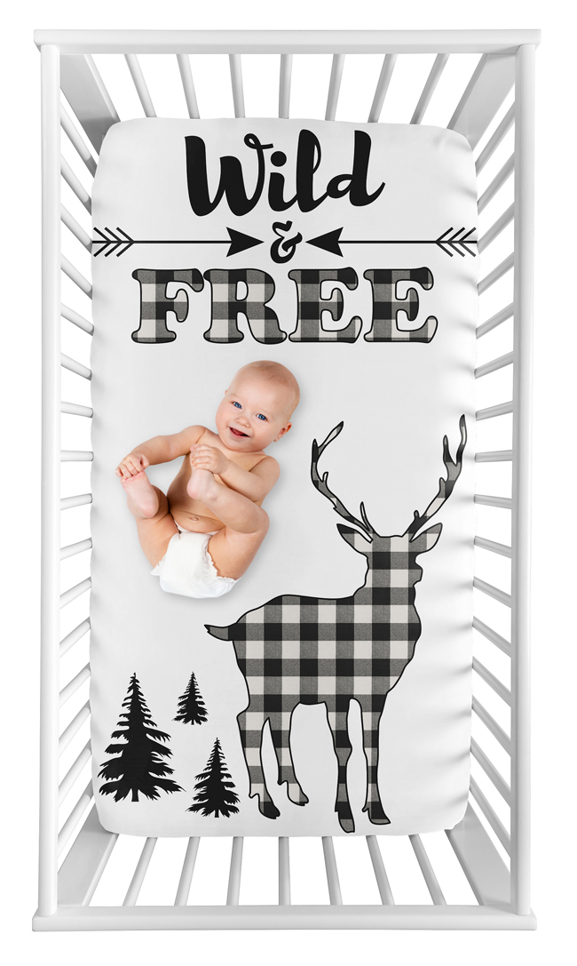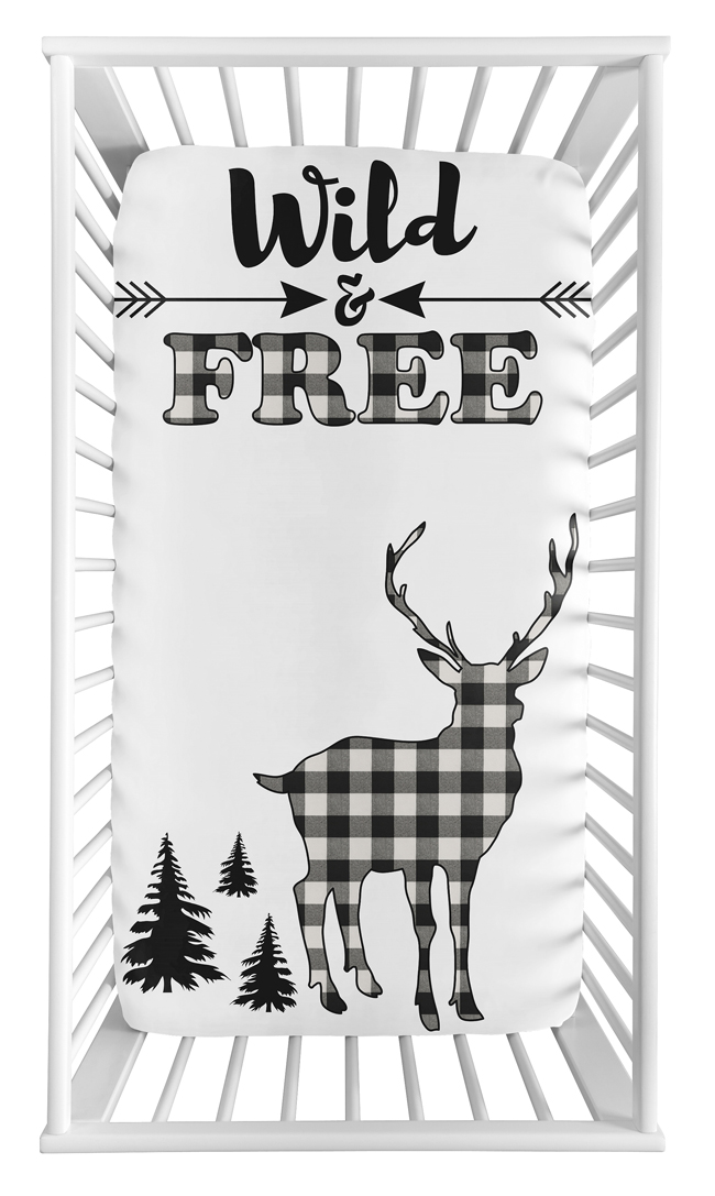 Black and White Buffalo Check fitted crib sheets will help complete the look of your Sweet Jojo Designs nursery. This black and white "Wild & Free" buffalo plaid photo op print brushed microfiber sheet fits all standard crib and toddler mattresses and is machine washable for easy care. Dimensions: 52 in x 28 in x 8 in.