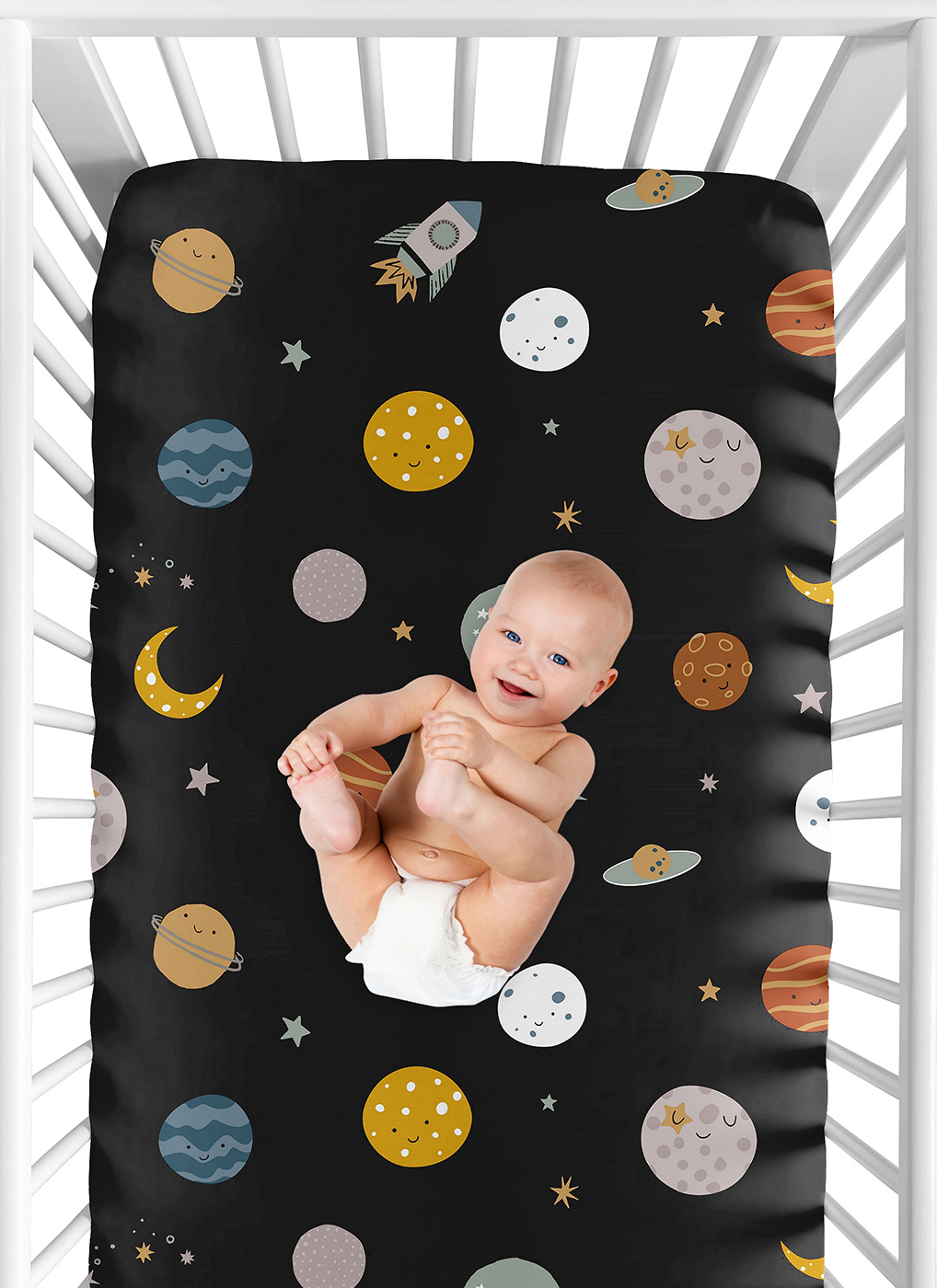 SNUG FIT: Includes (1) Fitted Crib Sheet 52in. x 28in. x 8in. Our newborn standard crib sheets fit snugly, with premium elastic sewn around the entire bottom edge for a secure fit on most standard sized cribs and toddler beds, to reduce shifting and bunching. This whimsical, outerspace brushed microfiber crib sheet features an exclusive design of black, red & yellow galaxy, outer space planets, rocket ship, moon & stars print & is gentle on delicate skin to foster a soothing sleep environment.DESIGNED IN THE USA: By real parents who understand the need for comfort, practicality, and style. Sweet Jojo Designs is a small, women owned business. The mom's on our team know a crib mattress sheet is first priority for your baby essentials to ensure a restful night of sleep. We use top fabrics and designs to create soft crib sheets that are stretchy and comfortable for your infant or toddler. We've studied the latest trends in space crib sheets for baby boy to bring you the finest product.SAFE & DURABLE: Sweet Jojo Designs is a proud Baby Safety Alliance member and rigorously tests products to meet or exceed CPSC safety standards. Our breathable crib sheets are designed with busy parents in mind. Quick to change, easy machine washable and tumble dry on low. The high quality stitching and fabric ensure long-lasting use and will hold up wash after wash. Use one crib sheet in your newborns bed and have spares nearby to swap in between washes & to be prepared if an accident happens.PERFECT GIFT: Add baby boy crib sheets to your list of must haves! Including a baby fitted crib sheet on your gift registry, in a baby shower gift basket or as a gender reveal present is an easy way to prepare for a baby's arrival. Whether it's nap time, bedtime, or an unexpected mess, having extras of these baby mattress sheets make changes effortless so you can focus on what matters most to you and your family. And remember, you can never have too many baby crib sheets or toddler bed sheets!NURSERY DESIGN MADE EASY: If you have a nursery to decorate, we have endless coordinating options to help. A nursery theme can be planned entirely around baby sheets for crib. Sweet Jojo Designs makes decorating simple with matching crib bedding sets, toddler bedding sets, crib sheet set, crib bed sheets, changing pad covers, milestone blankets, wall decor, decorative accessories, swaddles, and window treatments to make sure you have all you need to complete the look of your baby room. Item# CribSheet-CuteSpace-BK