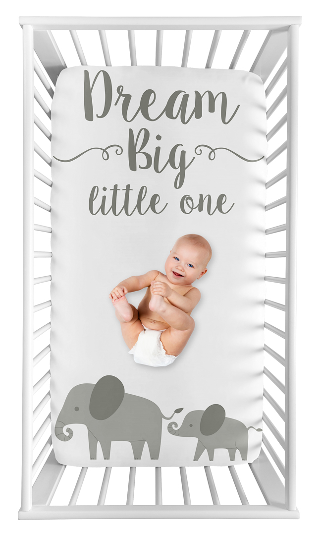 Pink and Grey Elephant fitted crib sheets will help complete the look of your Sweet Jojo Designs nursery. This Grey and White "Dream Big Little One" Watercolor Elephant Photo Op Print brushed microfiber sheet fits all standard crib and toddler mattresses and is machine washable for easy care. Dimensions: 52 in x 28 in x 8 in.