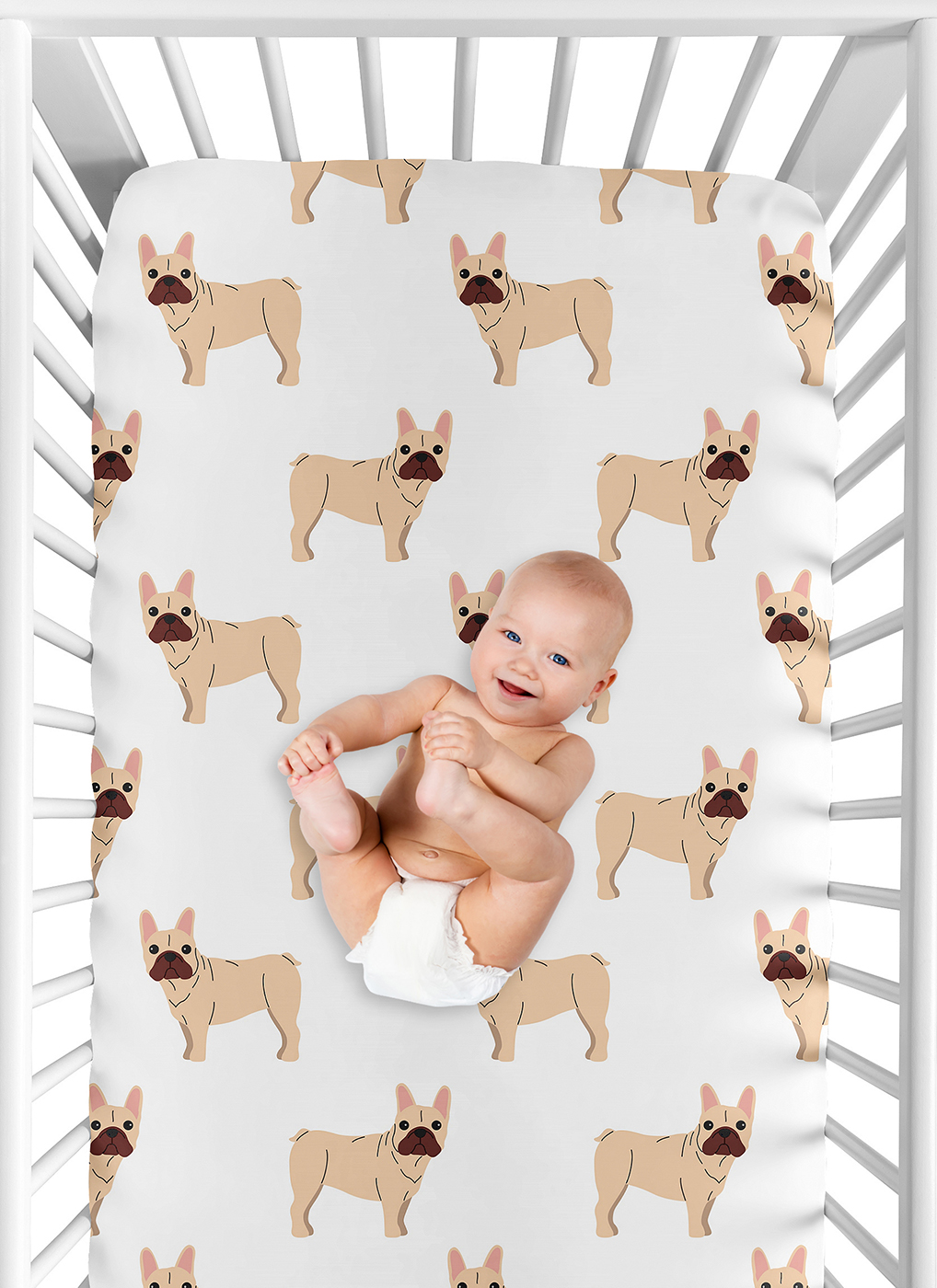 SNUG FIT: Includes (1) Fitted Crib Sheet 52in. x 28in. x 8in. Our newborn standard crib sheets fit snugly, with premium elastic sewn around the entire bottom edge for a secure fit on most standard sized cribs and toddler beds, to reduce shifting and bunching. This brushed microfiber crib sheet features an exclusive trendy design of a whimsical modern cartoon illustration style beige and tan French Bulldogs and puppies print and is gentle on delicate skin to foster a soothing sleep environment.DESIGNED IN THE USA: By real parents who understand the need for comfort, practicality, and style. Sweet Jojo Designs is a small, women owned business. The mom's on our team know a crib mattress sheet is first priority for your baby essentials to ensure a restful night of sleep. We use top fabrics and designs to create soft crib sheets that are stretchy and comfortable for your infant or toddler. We've studied the latest trends in frenchie dog crib sheets neutral to bring you the finest product.SAFE & DURABLE: Sweet Jojo Designs is a proud JPMA member and rigorously tests products to meet or exceed CPSC safety standards. Our breathable crib sheets are designed with busy parents in mind. Quick to change, easy machine washable and tumble dry on low. The high quality stitching and fabric ensure long-lasting use and will hold up wash after wash. Use one crib sheet in your newborns bed and have spares nearby to swap in between washes and to be prepared if an accident happens in the crib.PERFECT GIFT: Add baby girl crib sheets to your list of must haves! Including a baby fitted crib sheet on your gift registry, in a baby shower gift basket or as a gender reveal present is an easy way to prepare for a baby's arrival. Whether it's nap time, bedtime, or an unexpected mess, having extras of these baby mattress sheets make changes effortless so you can focus on what matters most to you and your family. And remember, you can never have too many baby crib sheets or toddler bed sheets!NURSERY DESIGN MADE EASY: If you have a nursery to decorate, we have endless coordinating options to help. A nursery theme can be planned entirely around baby sheets for crib. Sweet Jojo Designs makes decorating simple with matching crib bedding sets, toddler bedding sets, crib sheet set, crib bed sheets, changing pad covers, milestone blankets, wall decor, decorative accessories, swaddles, and window treatments to make sure you have all you need to complete the look of your baby room. Item# CribSheet-Frenchie
