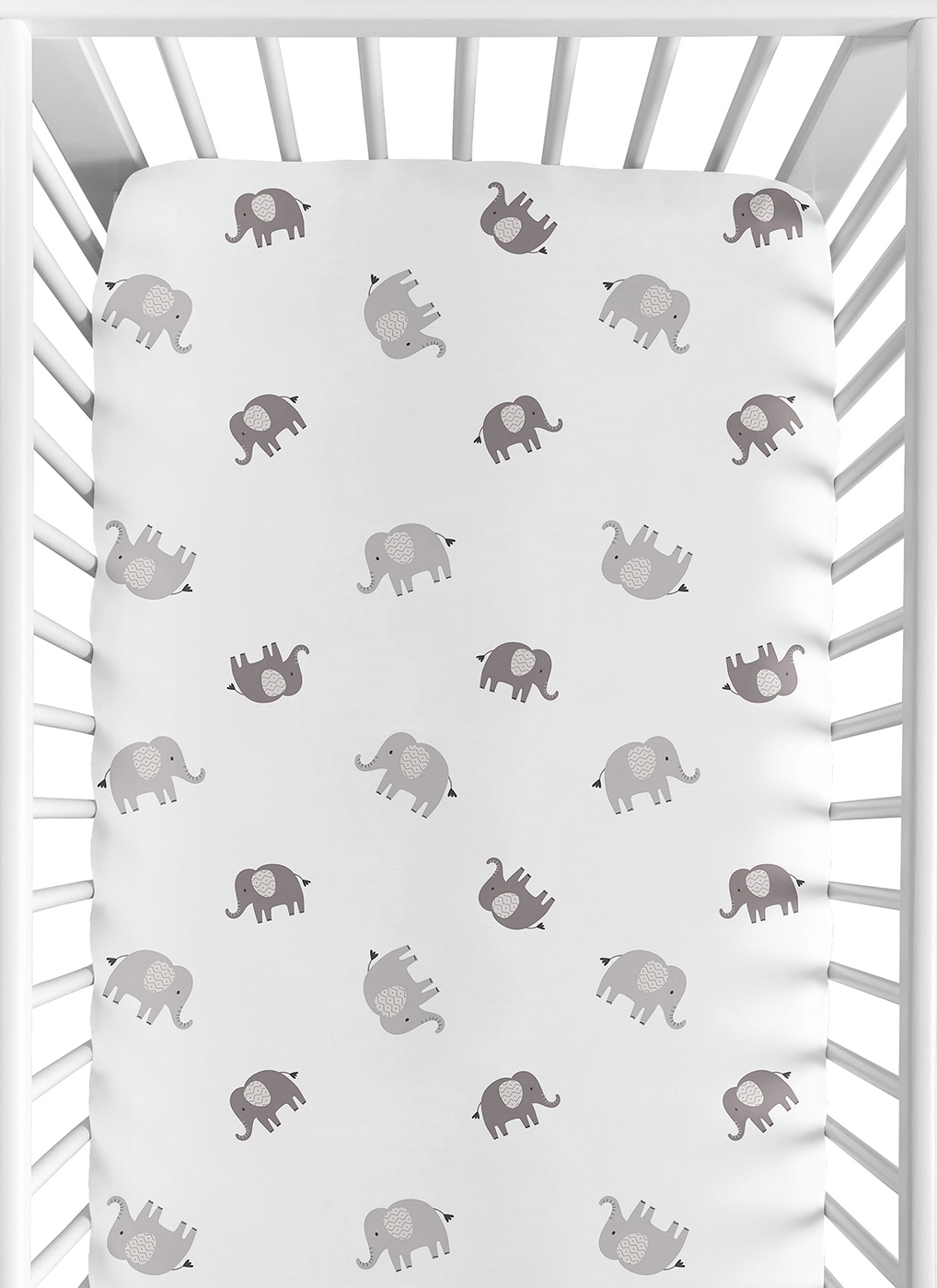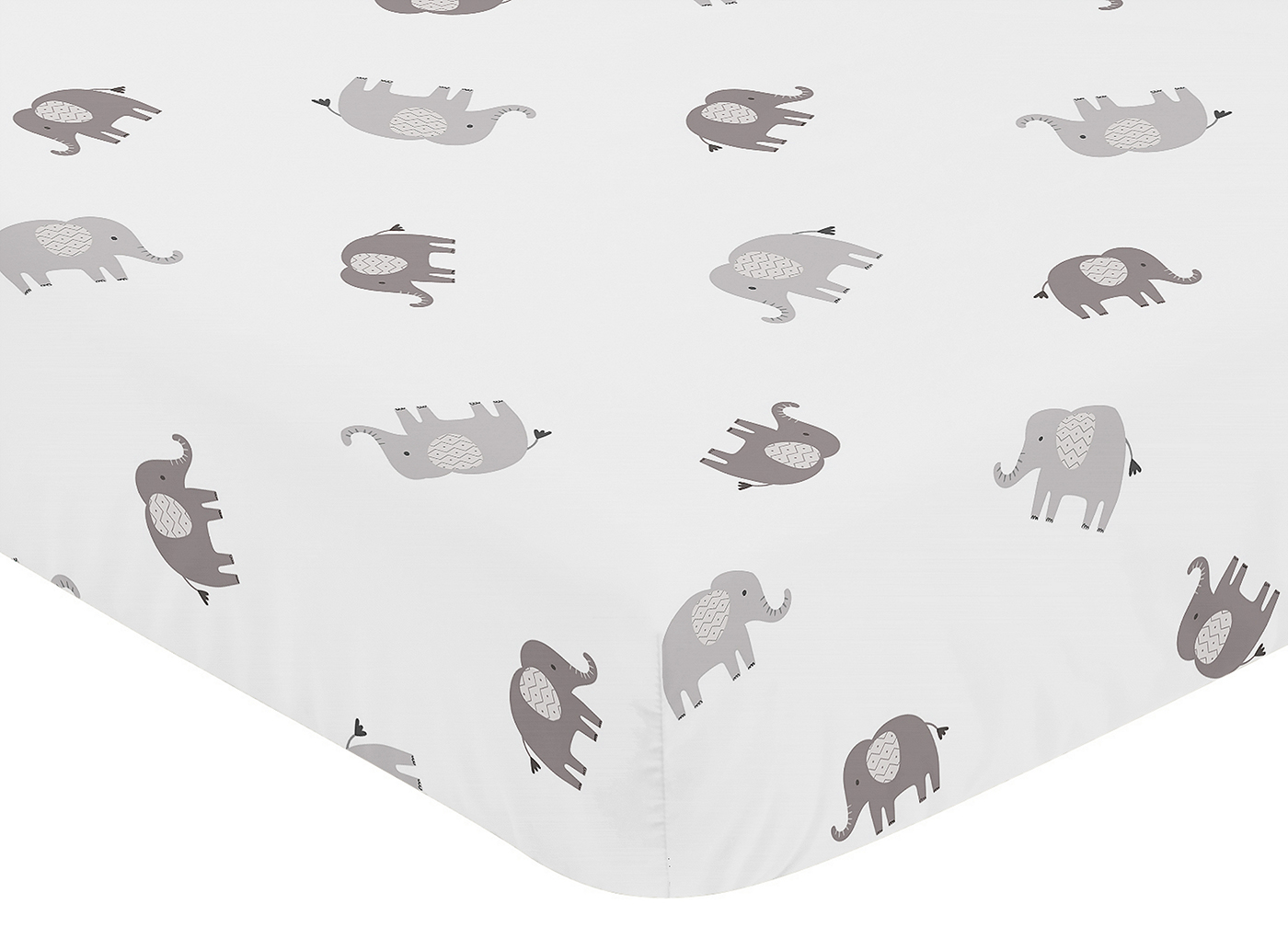 This brushed microfiber crib sheet features an exclusive design of grey and white modern boho bohemian jungle safari silver gray animal elephants print.