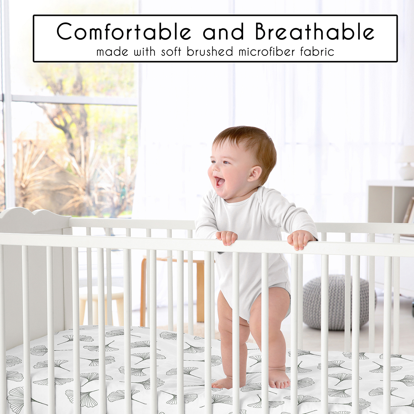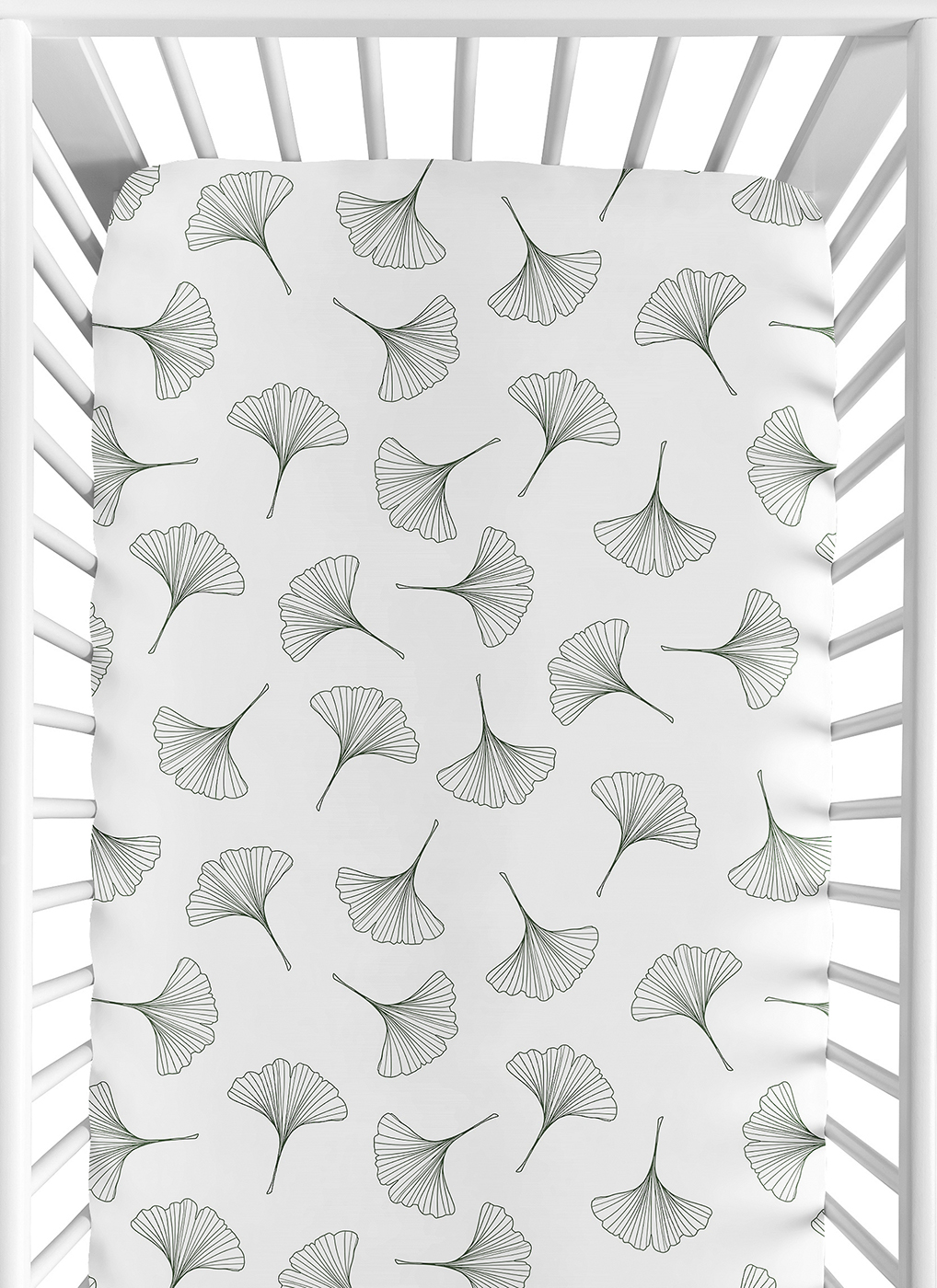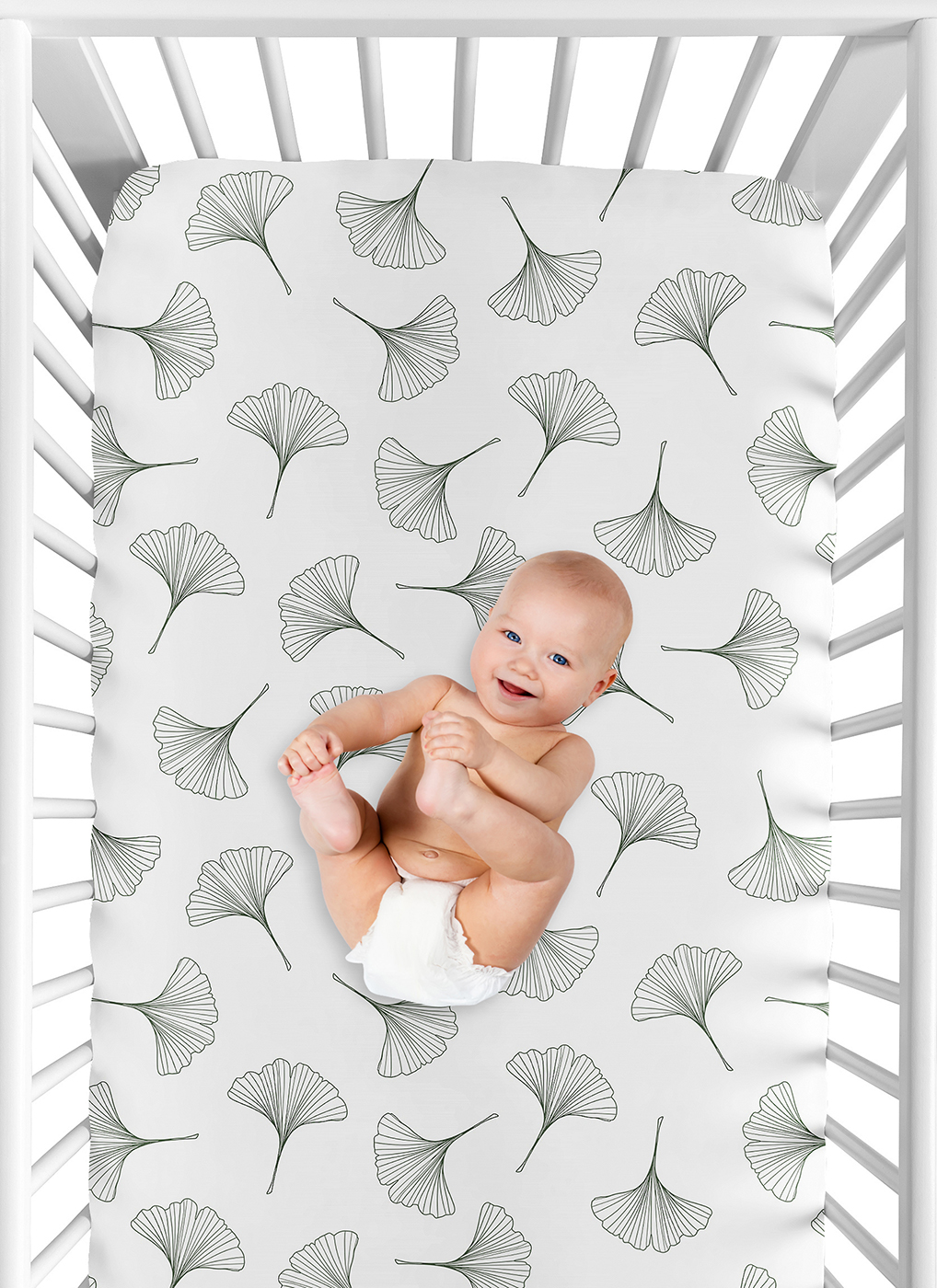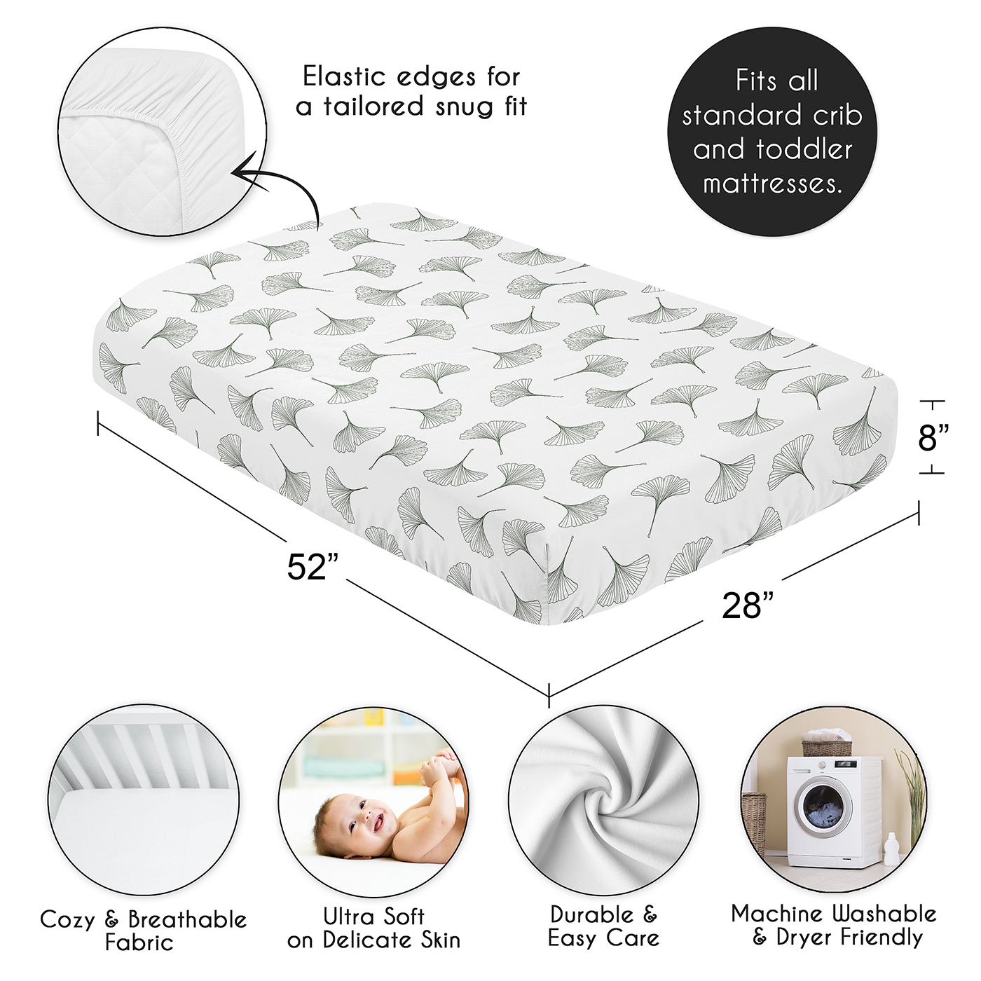 SNUG FIT: Includes (1) Fitted Crib Sheet 52in. x 28in. x 8in. Our newborn standard crib sheets fit snugly, with premium elastic sewn around the entire bottom edge for a secure fit on most standard sized cribs and toddler beds, to reduce shifting and bunching. This brushed microfiber crib sheet features an exclusive design of white and forest hunter green delicate leaves, modern foliage, calming, elegant ginkgo biloba print and is gentle on delicate skin to foster a soothing sleep environment.DESIGNED IN THE USA: By real parents who understand the need for comfort, practicality, & style. Sweet Jojo Designs is a small, women owned business. The mom's on our team know a crib mattress sheet is first priority for your baby essentials to ensure a restful night of sleep. We use top fabrics & designs to create soft crib sheets that are stretchy & comfortable for your infant or toddler. We've studied the latest trends in woodland crib sheets for baby neutral to bring you the finest product.SAFE & DURABLE: Sweet Jojo Designs is a proud Baby Safety Alliance member and rigorously tests products to meet or exceed CPSC safety standards. Our breathable crib sheets are designed with busy parents in mind. Quick to change, easy machine washable and tumble dry on low. The high quality stitching and fabric ensure long-lasting use and will hold up wash after wash. Use one crib sheet in your newborns bed and have spares nearby to swap in between washes & to be prepared if an accident happens.PERFECT GIFT: Add gender neutral crib sheets to your list of must haves! Including a baby fitted crib sheet on your gift registry, in a baby shower gift basket or as a gender reveal present is an easy way to prepare for a baby's arrival. Whether it's bedtime or an unexpected mess, having extras of these baby mattress sheets make changes effortless so you can focus on what matters most to you and your family. And remember, you can never have too many baby crib sheets or toddler bed sheets!NURSERY DESIGN MADE EASY: If you have a nursery to decorate, we have endless coordinating options to help. A nursery theme can be planned entirely around baby sheets for crib. Sweet Jojo Designs makes decorating simple with matching crib bedding sets, toddler bedding sets, crib sheet set, crib bed sheets, changing pad covers, milestone blankets, wall decor, decorative accessories, swaddles, and window treatments to make sure you have all you need to complete the look of your baby room. Item# CribSheet-Ginkgo-WH
