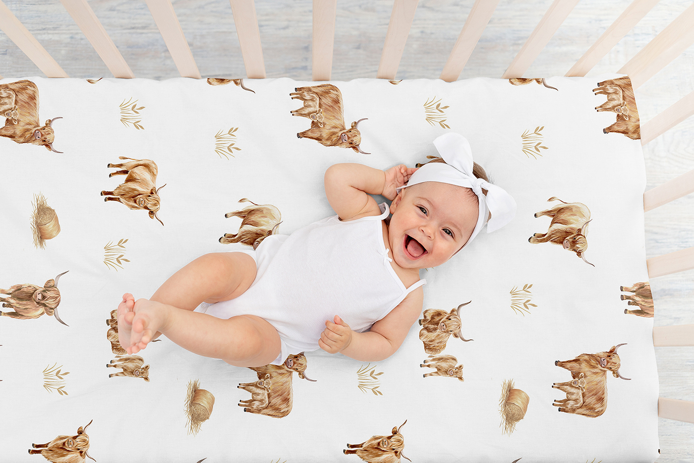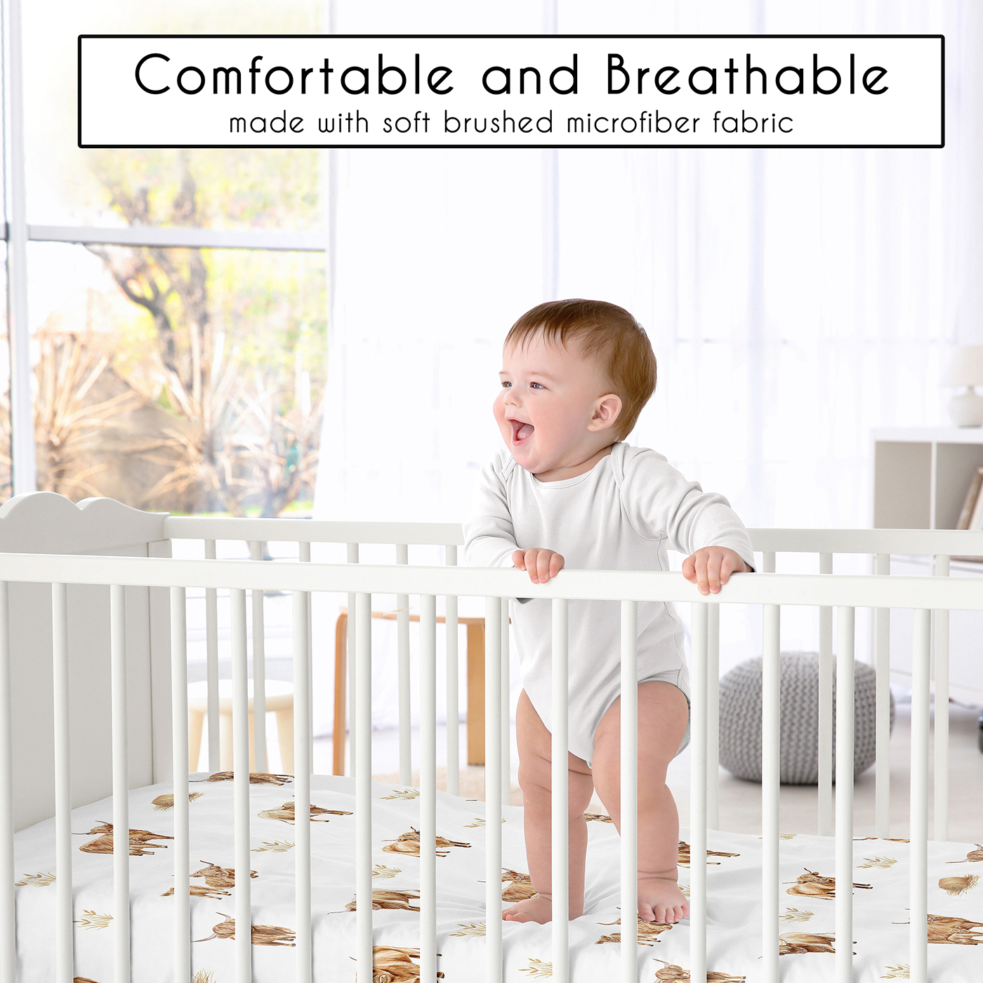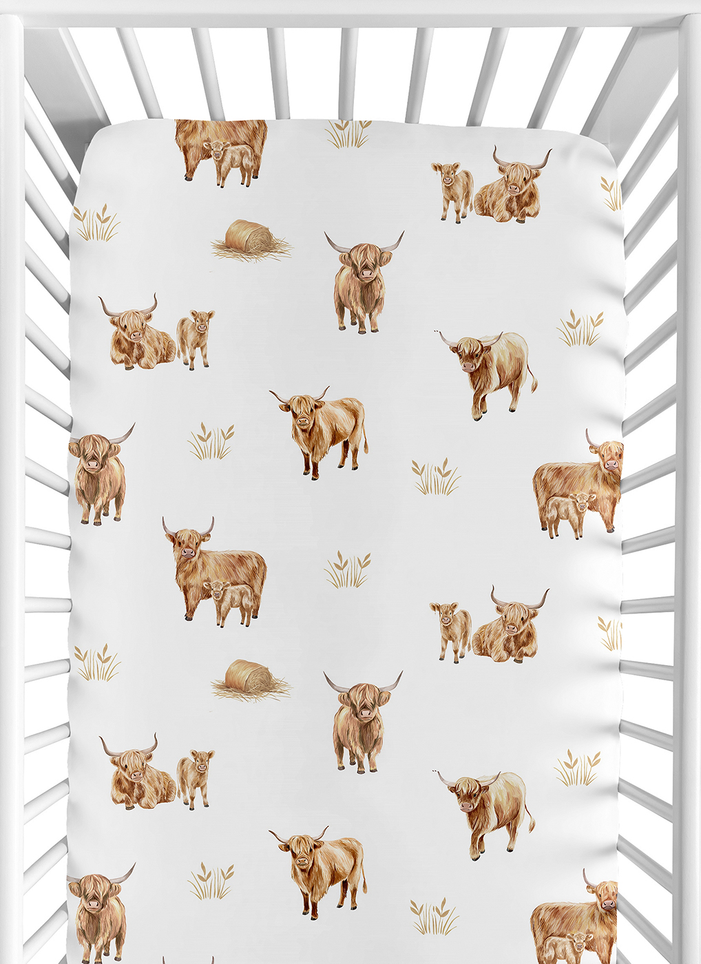 SNUG FIT: Includes (1) Fitted Crib Sheet 52in. x 28in. x 8in. Our newborn standard crib sheets fit snugly, with premium elastic sewn around the entire bottom edge for a secure fit on most standard sized cribs & toddler beds, to reduce shifting & bunching. This modern bohemian animal brushed microfiber crib sheet features a watercolor rustic farmhouse high land cow print in a classic boho country farm animals cattle ranch style & is gentle on delicate skin to foster a soothing sleep environment.DESIGNED IN THE USA: By real parents who understand the need for comfort, practicality, and style. Sweet Jojo Designs is a small, women owned business. The mom's on our team know a crib mattress sheet is first priority for your baby essentials to ensure a restful night of sleep. We use top fabrics and designs to create soft crib sheets that are stretchy and comfortable for your infant or toddler. We've studied the latest trends in highland cow crib sheets neutral to bring you the finest product.SAFE & DURABLE: Sweet Jojo Designs is a proud Baby Safety Alliance member & rigorously tests products to meet or exceed CPSC safety standards. Our breathable crib sheets are designed with busy parents in mind. Quick to change, easy machine washable and tumble dry on low. The high quality stitching and fabric ensure long-lasting use and will hold up wash after wash. Use one crib sheet in your newborns bed and have spares nearby to swap in between washes & to be prepared for accidents in the crib.PERFECT GIFT: Add gender neutral crib sheets to your list of must haves! Including a baby fitted crib sheet on your gift registry, in a baby shower gift basket or as a gender reveal present is an easy way to prepare for a baby's arrival. Whether it's bedtime or an unexpected mess, having extras of these baby mattress sheets make changes effortless so you can focus on what matters most to you and your family. And remember, you can never have too many baby crib sheets or toddler bed sheets!NURSERY DESIGN MADE EASY: If you have a nursery to decorate, we have endless coordinating options to help. A nursery theme can be planned entirely around baby sheets for crib. Sweet Jojo Designs makes decorating simple with matching crib bedding sets, toddler bedding sets, crib sheet set, crib bed sheets, changing pad covers, milestone blankets, wall decor, decorative accessories, swaddles, and window treatments to make sure you have all you need to complete the look of your baby room.Item# CribSheet-HighlandCow