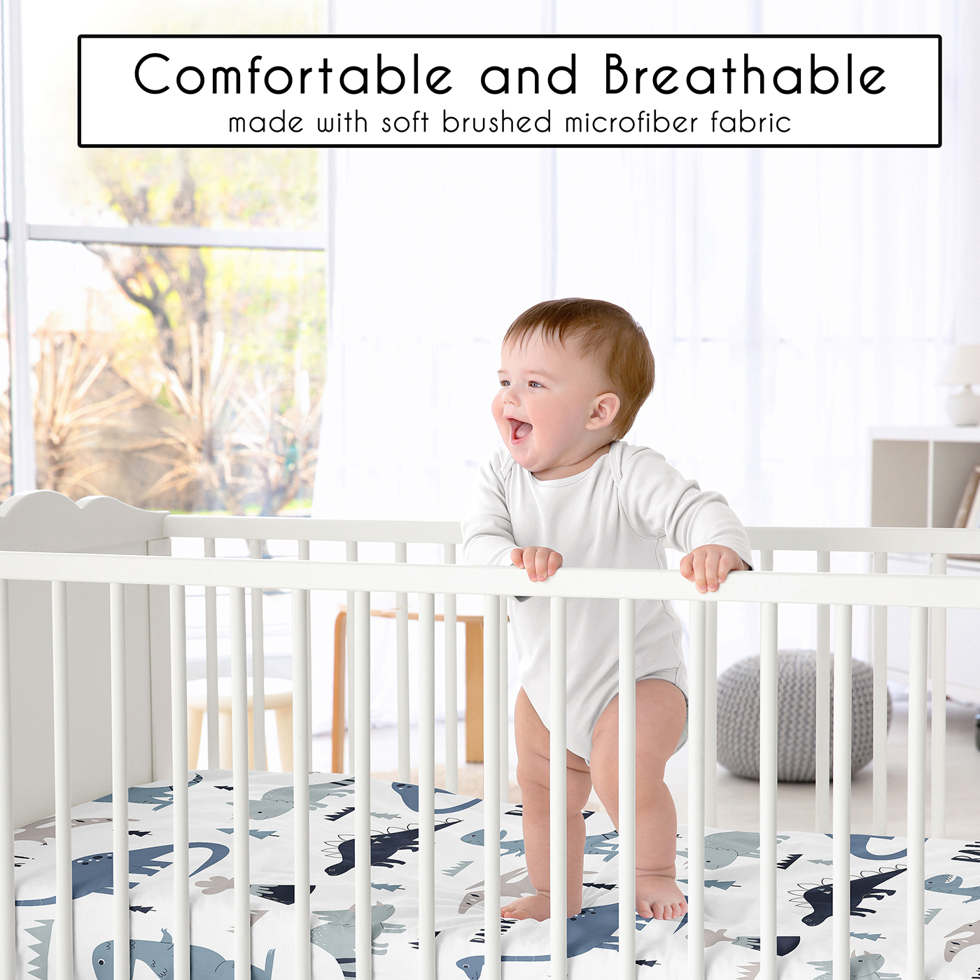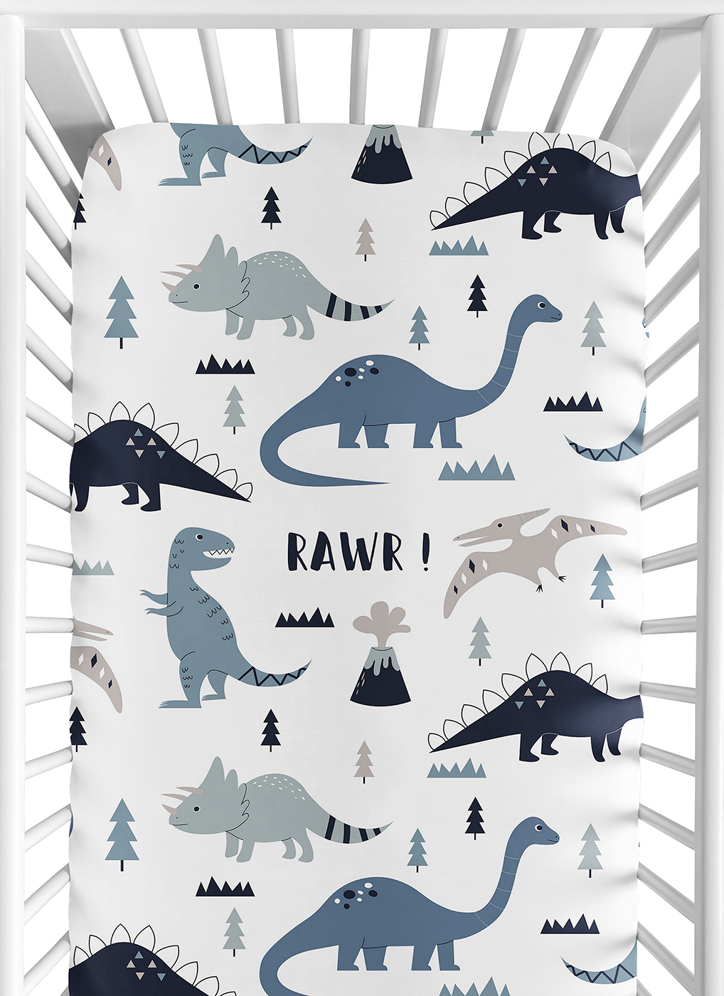 SNUG FIT: Includes (1) Fitted Crib Sheet 52in. x 28in. x 8in. Our newborn standard crib sheets fit snugly, with premium elastic sewn around the entire bottom edge for a secure fit on most standard sized cribs and toddler beds, to reduce shifting and bunching. This brushed microfiber crib sheet features an exclusive modern boho dino print of prehistoric dinosaurs, trex and volcanos in a grey, navy blue and gray color palette and is gentle on delicate skin to foster a soothing sleep environment.DESIGNED IN THE USA: By real parents who understand the need for comfort, practicality, and style. Sweet Jojo Designs is a small, women owned business. The mom's on our team know a crib mattress sheet is first priority for your baby essentials to ensure a restful night of sleep. We use top fabrics and designs to create soft crib sheets that are stretchy and comfortable for your infant or toddler. We've studied the latest trends in blue dinosaur crib sheets boy to bring you the finest product.SAFE & DURABLE: Sweet Jojo Designs is a proud Baby Safety Alliance member & rigorously tests products to meet or exceed CPSC safety standards. Our breathable crib sheets are designed with busy parents in mind. Quick to change, easy machine washable and tumble dry on low. The high quality stitching and fabric ensure long-lasting use and will hold up wash after wash. Use one crib sheet in your newborns bed and have spares nearby to swap in between washes & to be prepared for accidents in the crib.PERFECT GIFT: Add baby boy crib sheets to your list of must haves! Including a baby fitted crib sheet on your gift registry, in a baby shower gift basket or as a gender reveal present is an easy way to prepare for a baby's arrival. Whether it's nap time, bedtime, or an unexpected mess, having extras of these baby mattress sheets make changes effortless so you can focus on what matters most to you and your family. And remember, you can never have too many baby crib sheets or toddler bed sheets!NURSERY DESIGN MADE EASY: If you have a nursery to decorate, we have endless coordinating options to help. A nursery theme can be planned entirely around baby sheets for crib. Sweet Jojo Designs makes decorating simple with matching crib bedding sets, toddler bedding sets, crib sheet set, crib bed sheets, changing pad covers, milestone blankets, wall decor, decorative accessories, swaddles, and window treatments to make sure you have all you need to complete the look of your baby room.Item# CribSheet-ModDino-NV-GY