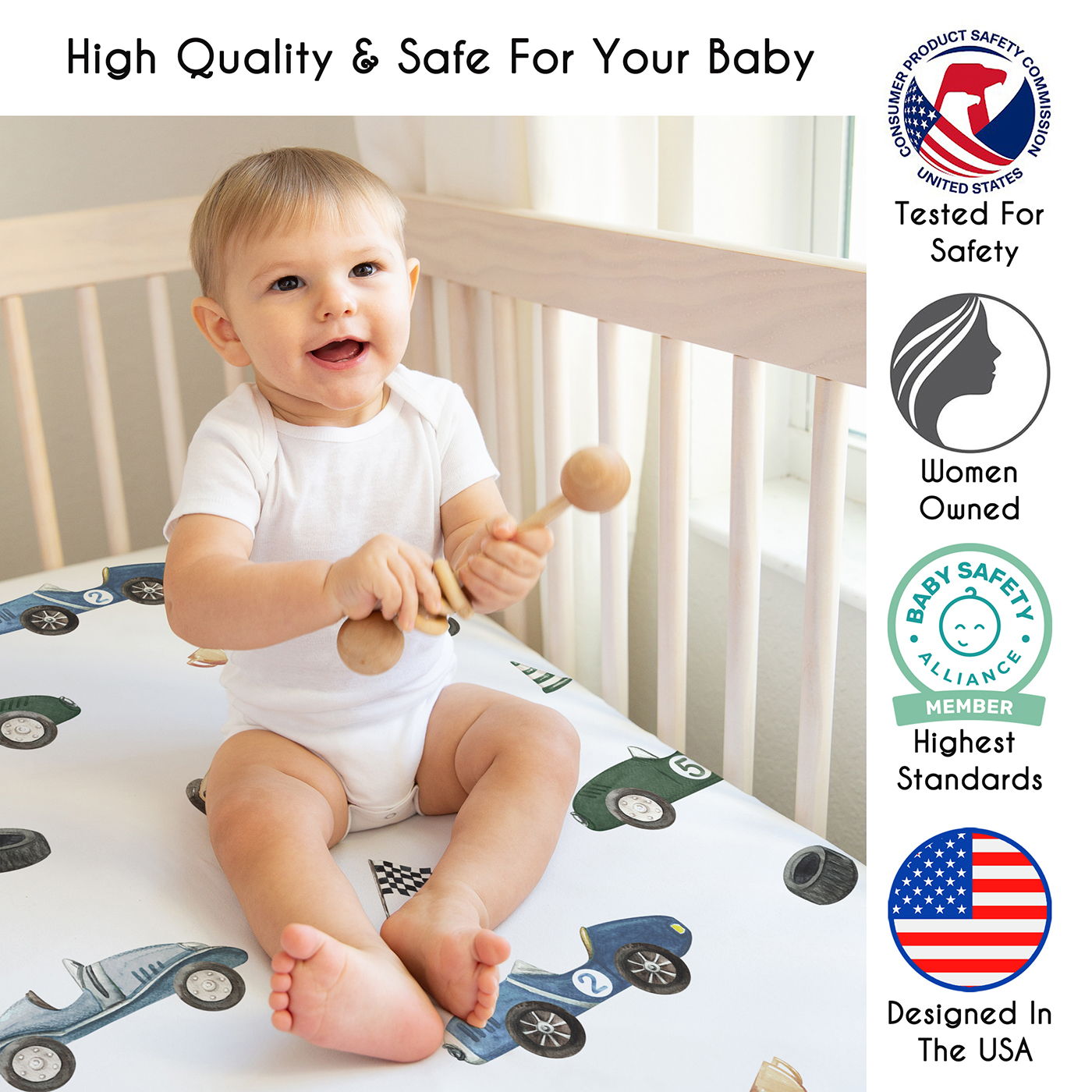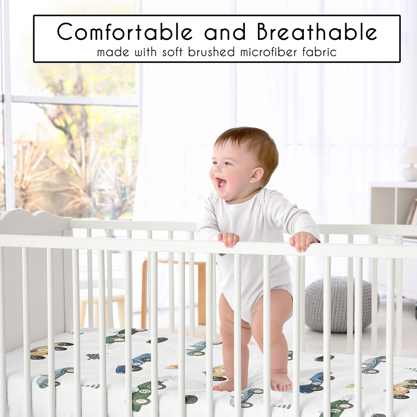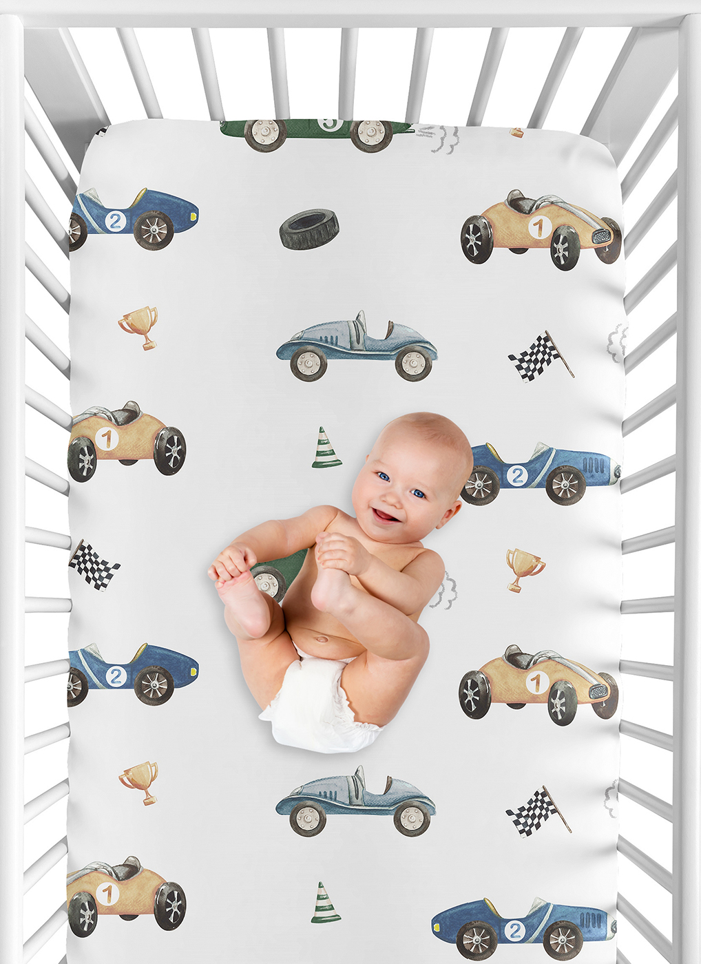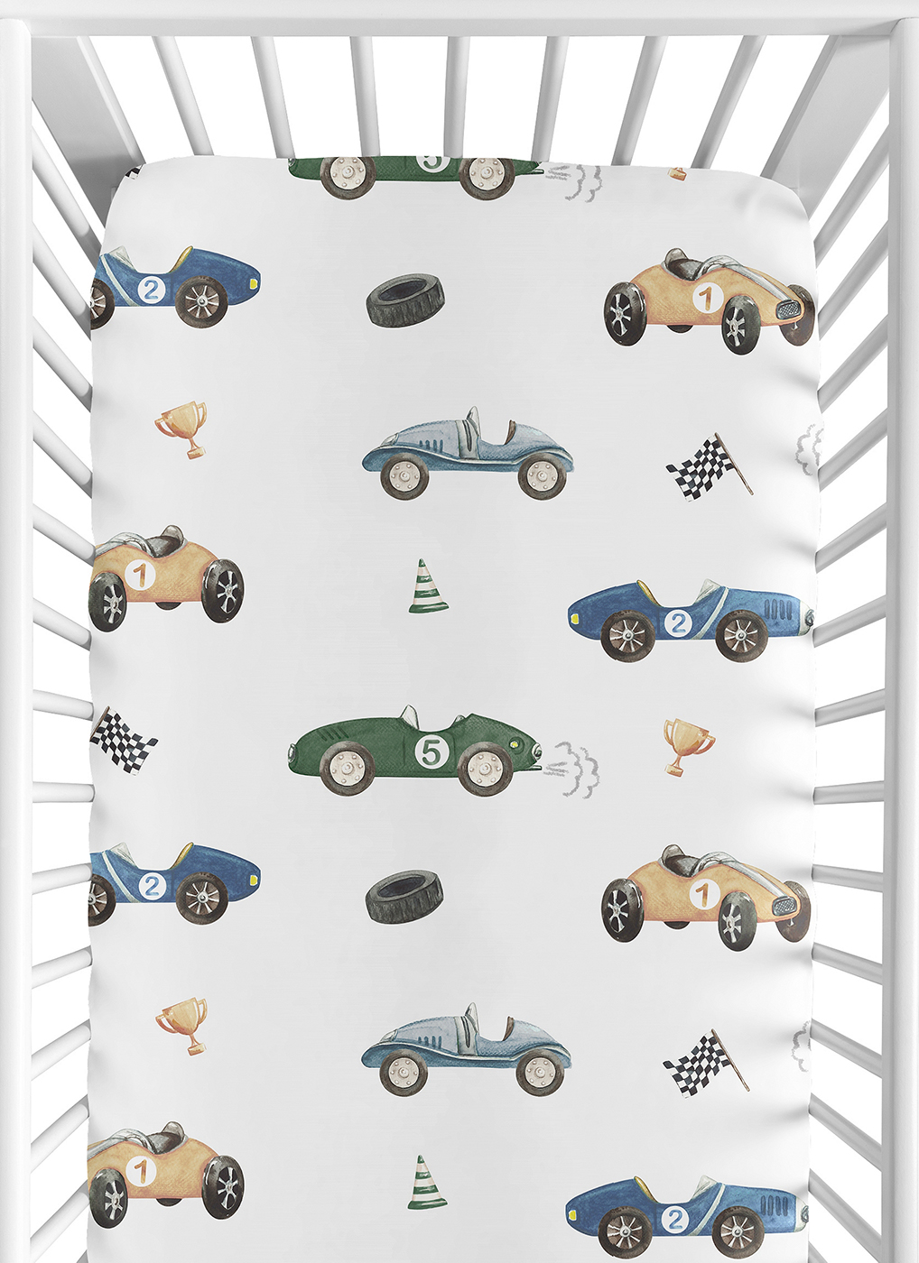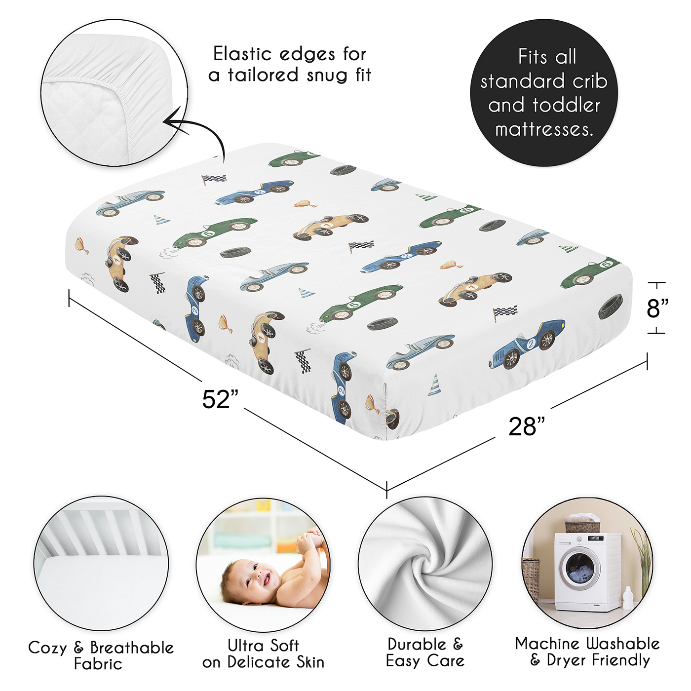 SNUG FIT: Includes (1) Fitted Crib Sheet 52in. x 28in. x 8in. Our newborn standard crib sheets fit snugly, with premium elastic sewn around the entire bottom edge for a secure fit on most standard sized cribs and toddler beds, to reduce shifting and bunching. This brushed microfiber crib sheet features an exclusive design of transportation vehicles, black and white gingham checkered plaid racing flag, cartoon racecars print and is gentle on delicate skin to foster a soothing sleep environment.DESIGNED IN THE USA: By real parents who understand the need for comfort, practicality, and style. Sweet Jojo Designs is a small, women owned business. The mom's on our team know a crib mattress sheet is first priority for your baby essentials to ensure a restful night of sleep. We use top fabrics & designs to create soft crib sheets that are stretchy and comfortable for your infant or toddler. We've studied the latest trends in race cars crib sheets for baby boy to bring you the finest product.SAFE & DURABLE: Sweet Jojo Designs is a proud Baby Safety Alliance member and rigorously tests products to meet or exceed CPSC safety standards. Our breathable crib sheets are designed with busy parents in mind. Quick to change, easy machine washable and tumble dry on low. The high quality stitching and fabric ensure long-lasting use and will hold up wash after wash. Use one crib sheet in your newborns bed and have spares nearby to swap in between washes & to be prepared if an accident happens.PERFECT GIFT: Add baby boy crib sheets to your list of must haves! Including a baby fitted crib sheet on your gift registry, in a baby shower gift basket or as a gender reveal present is an easy way to prepare for a baby's arrival. Whether it's nap time, bedtime, or an unexpected mess, having extras of these baby mattress sheets make changes effortless so you can focus on what matters most to you and your family. And remember, you can never have too many baby crib sheets or toddler bed sheets!NURSERY DESIGN MADE EASY: If you have a nursery to decorate, we have endless coordinating options to help. A nursery theme can be planned entirely around baby sheets for crib. Sweet Jojo Designs makes decorating simple with matching crib bedding sets, toddler bedding sets, crib sheet set, crib bed sheets, changing pad covers, milestone blankets, wall decor, decorative accessories, swaddles, and window treatments to make sure you have all you need to complete the look of your baby room. Item# CribSheet-RaceCar-BU-GR