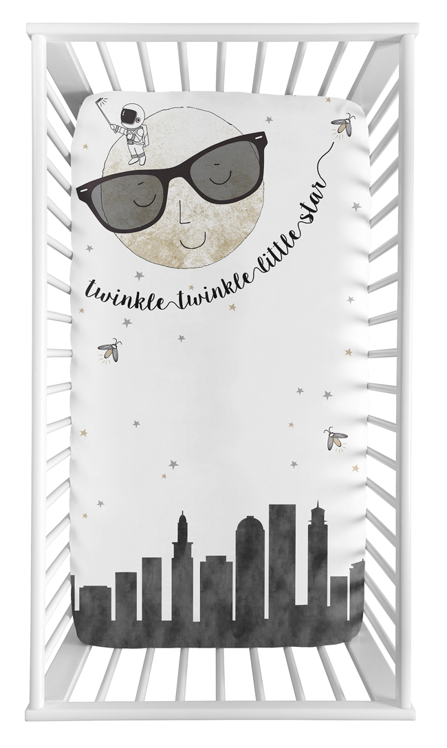 Skyline fitted crib sheets will help complete the look of your Sweet Jojo Designs nursery. This black and gold "Twinkle Twinkle Little Star" moon and stars photo op print brushed microfiber sheet fits all standard crib and toddler mattresses and is machine washable for easy care. Dimensions: 52 in x 28 in x 8 in.