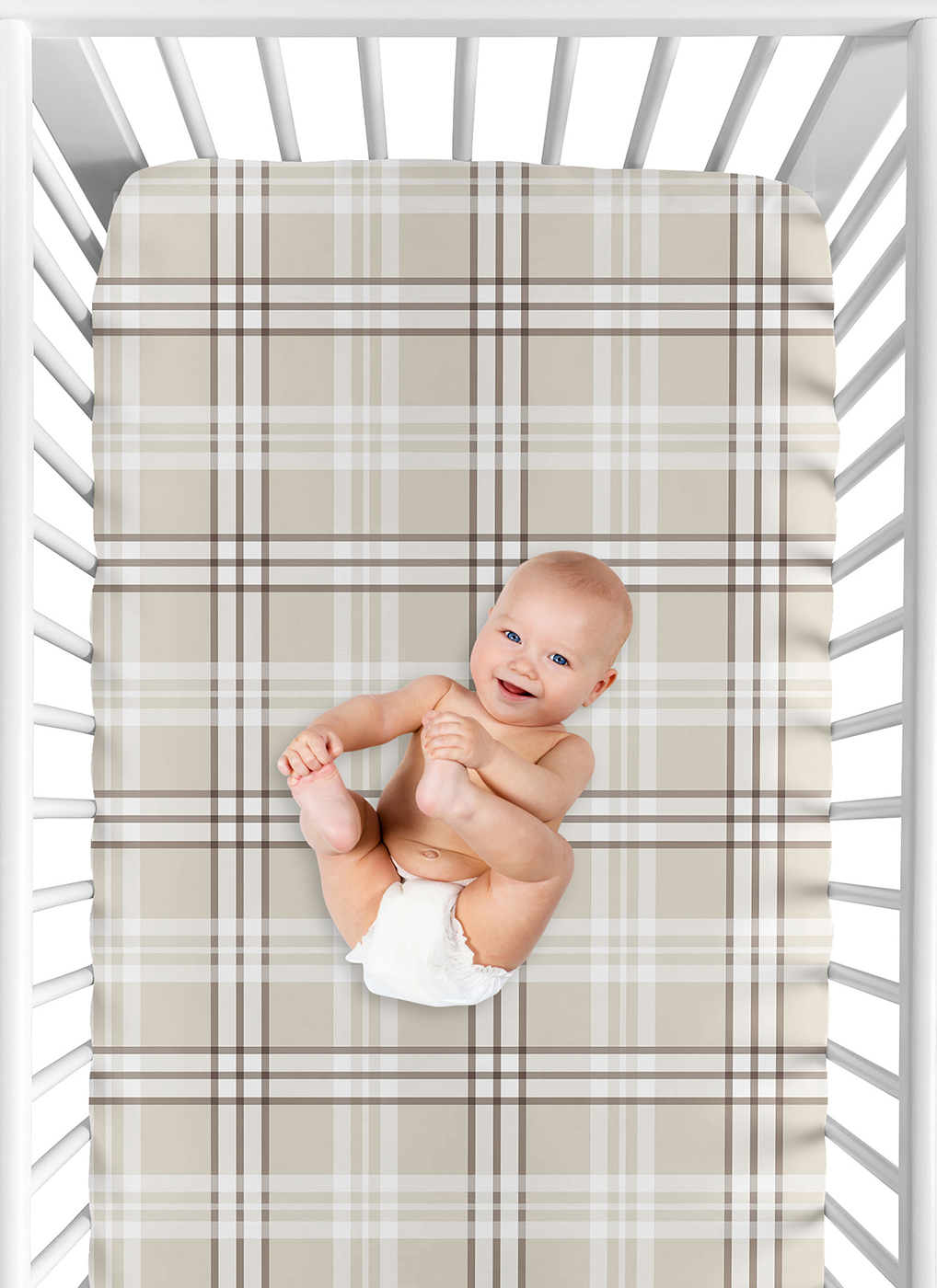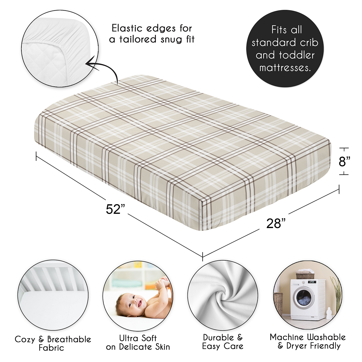 SNUG FIT: Includes (1) Fitted Crib Sheet 52in. x 28in. x 8in. Our newborn standard crib sheets fit snugly, with premium elastic sewn around the entire bottom edge for a secure fit on most standard sized cribs & toddler beds, to reduce shifting & bunching. This brushed microfiber crib sheet features a classic design of a tan, taupe, beige & brown country, rustic, geometric plaid pattern made to match the Teddy Bear Collection & is gentle on delicate skin to foster a soothing sleep environment.DESIGNED IN THE USA: By real parents who understand the need for comfort, practicality, and style. Sweet Jojo Designs is a small, women owned business. The mom's on our team know a crib mattress sheet is first priority for your baby essentials to ensure a restful night of sleep. We use top fabrics and designs to create soft crib sheets that are stretchy and comfortable for your infant or toddler. We've studied the latest trends in teddy bears crib sheets for baby to bring you the finest product.SAFE & DURABLE: Sweet Jojo Designs is a proud Baby Safety Alliance member and rigorously tests products to meet or exceed CPSC safety standards. Our breathable crib sheets are designed with busy parents in mind. Quick to change, easy machine washable and tumble dry on low. The high quality stitching and fabric ensure long-lasting use and will hold up wash after wash. Use one crib sheet in your newborns bed and have spares nearby to swap in between washes & to be prepared if an accident happens.PERFECT GIFT: Add unisex baby crib sheets to your list of must haves! Including a baby fitted crib sheet on your gift registry, in a baby shower gift basket or as a gender reveal present is an easy way to prepare for a baby's arrival. Whether it's nap time, bedtime, or an unexpected mess, having extras of these baby mattress sheets make changes effortless so you can focus on what matters most to you & your family. And remember, you can never have too many baby crib sheets or toddler bed sheets!NURSERY DESIGN MADE EASY: If you have a nursery to decorate, we have endless coordinating options to help. A nursery theme can be planned entirely around baby sheets for crib. Sweet Jojo Designs makes decorating simple with matching crib bedding sets, toddler bedding sets, crib sheet set, crib bed sheets, changing pad covers, milestone blankets, wall decor, decorative accessories, swaddles, and window treatments to make sure you have all you need to complete the look of your baby room. Item# CribSheet-TeddyBear-PLAID