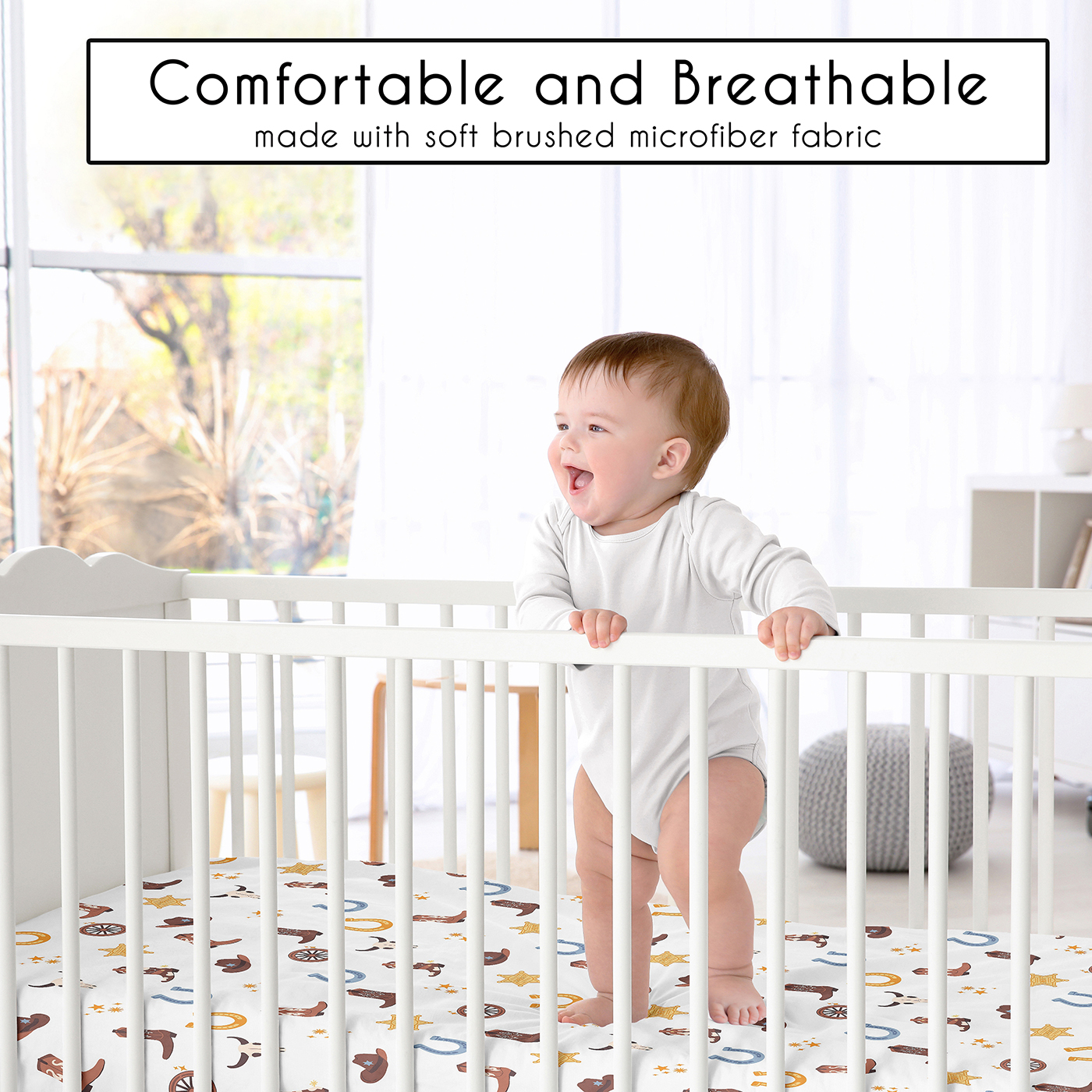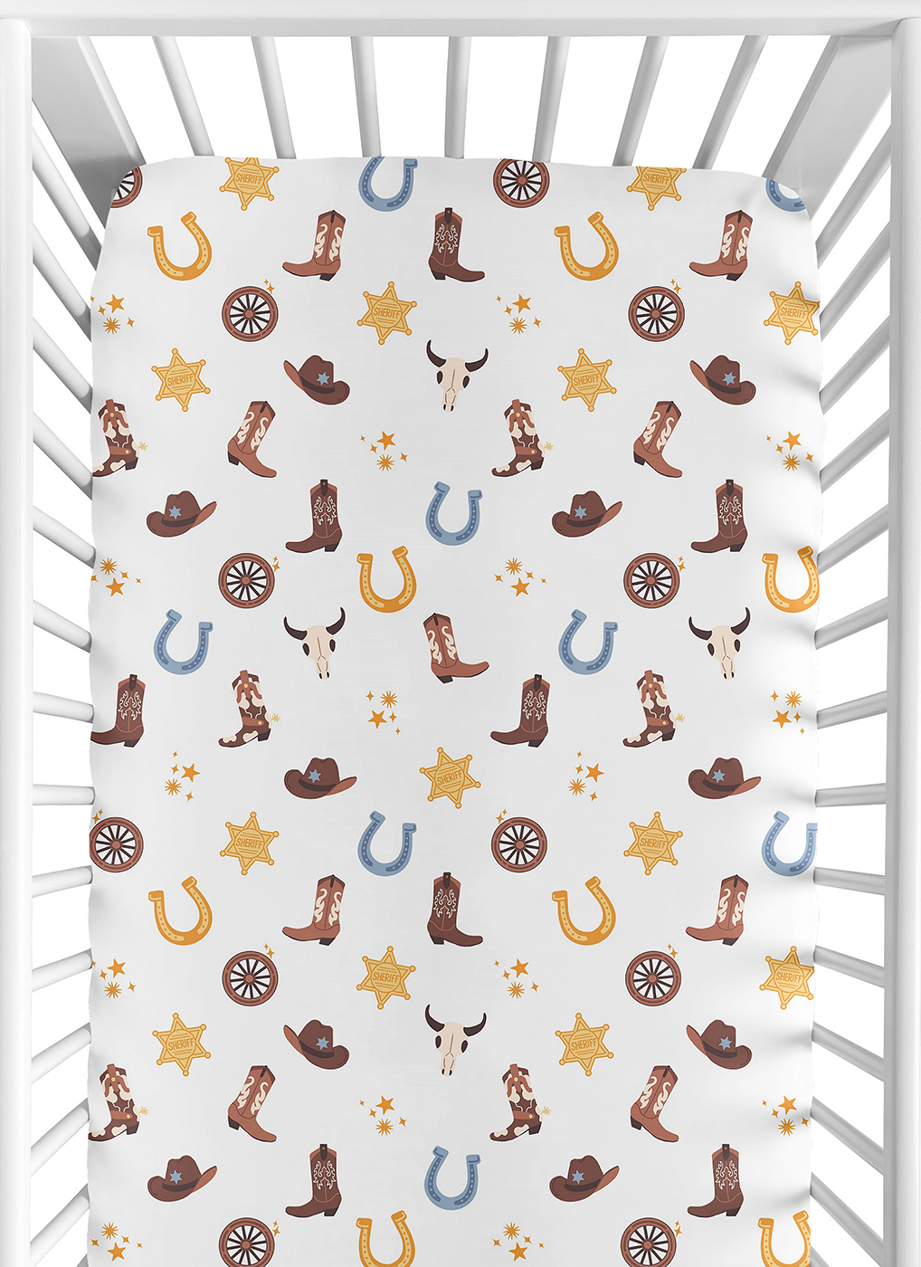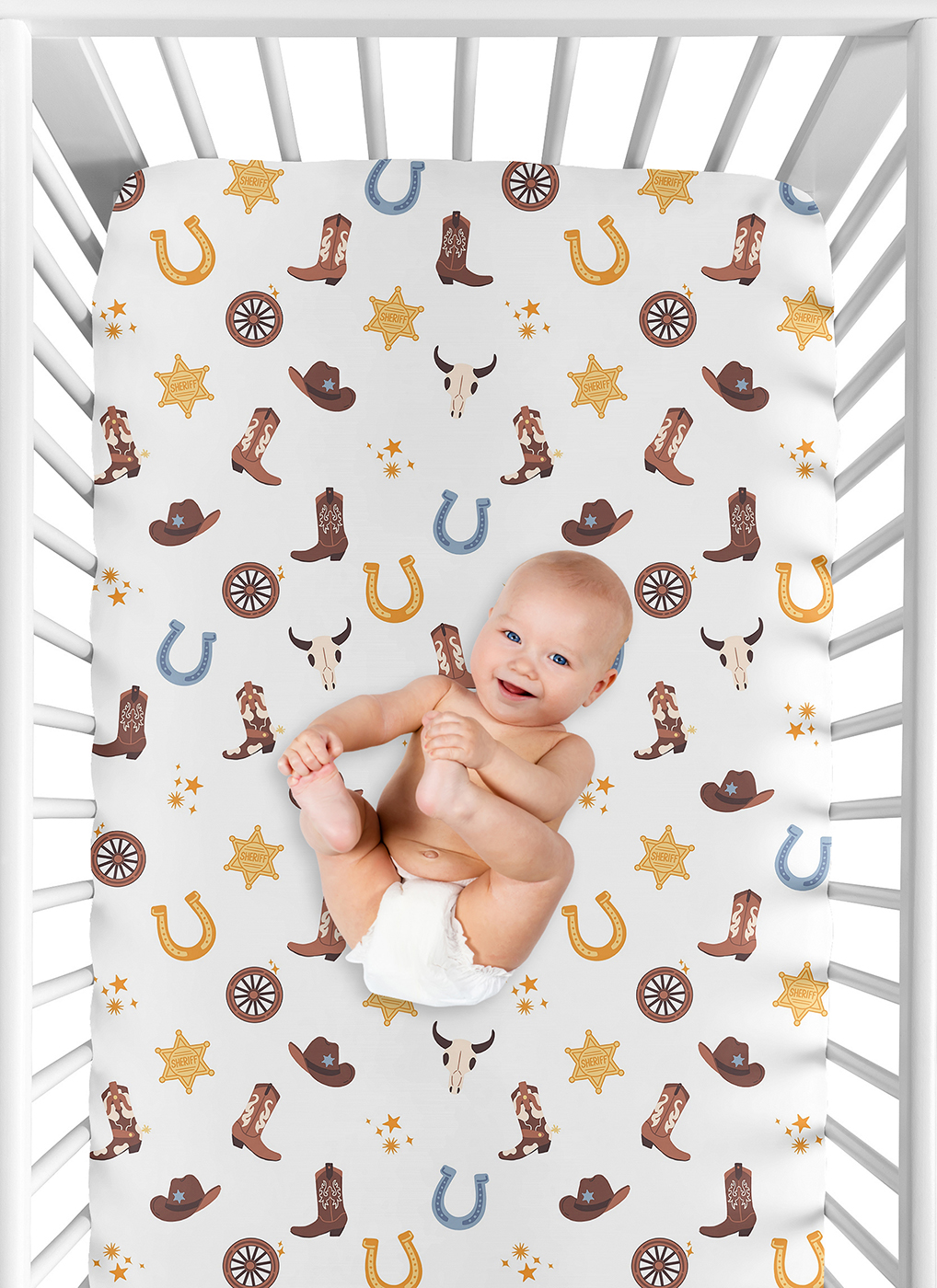 SNUG FIT: Includes (1) Fitted Crib Sheet 52in. x 28in. x 8in. Our newborn standard crib sheets fit snugly, with premium elastic sewn around the entire bottom edge for a secure fit on most standard sized cribs and toddler beds, to reduce shifting & bunching. This vintage, bohemian brushed microfiber crib sheet features an exclusive design of blue, brown, tan, orange & yellow southwestern, rodeo themed, rustic country west print & is gentle on delicate skin to foster a soothing sleep environment.DESIGNED IN THE USA: By real parents who understand the need for comfort, practicality, and style. Sweet Jojo Designs is a small, women owned business. The mom's on our team know a crib mattress sheet is first priority for your baby essentials to ensure a restful night of sleep. We use top fabrics and designs to create soft crib sheets that are stretchy and comfortable for your infant or toddler. We've studied the latest trends in western crib sheets for baby boy to bring you the finest product.SAFE & DURABLE: Sweet Jojo Designs is a proud Baby Safety Alliance member and rigorously tests products to meet or exceed CPSC safety standards. Our breathable crib sheets are designed with busy parents in mind. Quick to change, easy machine washable and tumble dry on low. The high quality stitching and fabric ensure long-lasting use and will hold up wash after wash. Use one crib sheet in your newborns bed and have spares nearby to swap in between washes & to be prepared if an accident happens.PERFECT GIFT: Add baby boy crib sheets to your list of must haves! Including a baby fitted crib sheet on your gift registry, in a baby shower gift basket or as a gender reveal present is an easy way to prepare for a baby's arrival. Whether it's nap time, bedtime, or an unexpected mess, having extras of these baby mattress sheets make changes effortless so you can focus on what matters most to you and your family. And remember, you can never have too many baby crib sheets or toddler bed sheets!NURSERY DESIGN MADE EASY: If you have a nursery to decorate, we have endless coordinating options to help. A nursery theme can be planned entirely around baby sheets for crib. Sweet Jojo Designs makes decorating simple with matching crib bedding sets, toddler bedding sets, crib sheet set, crib bed sheets, changing pad covers, milestone blankets, wall decor, decorative accessories, swaddles, and window treatments to make sure you have all you need to complete the look of your baby room. Item# CribSheet-Western-BU