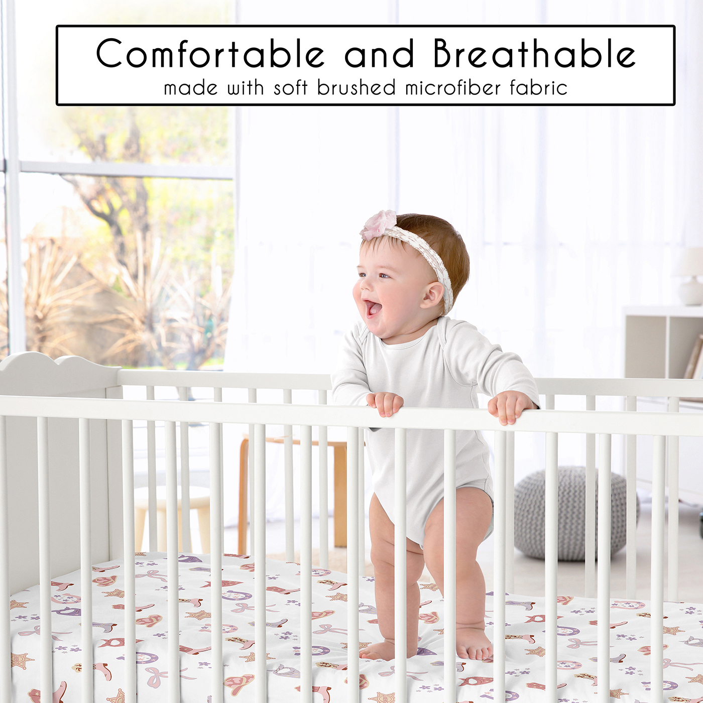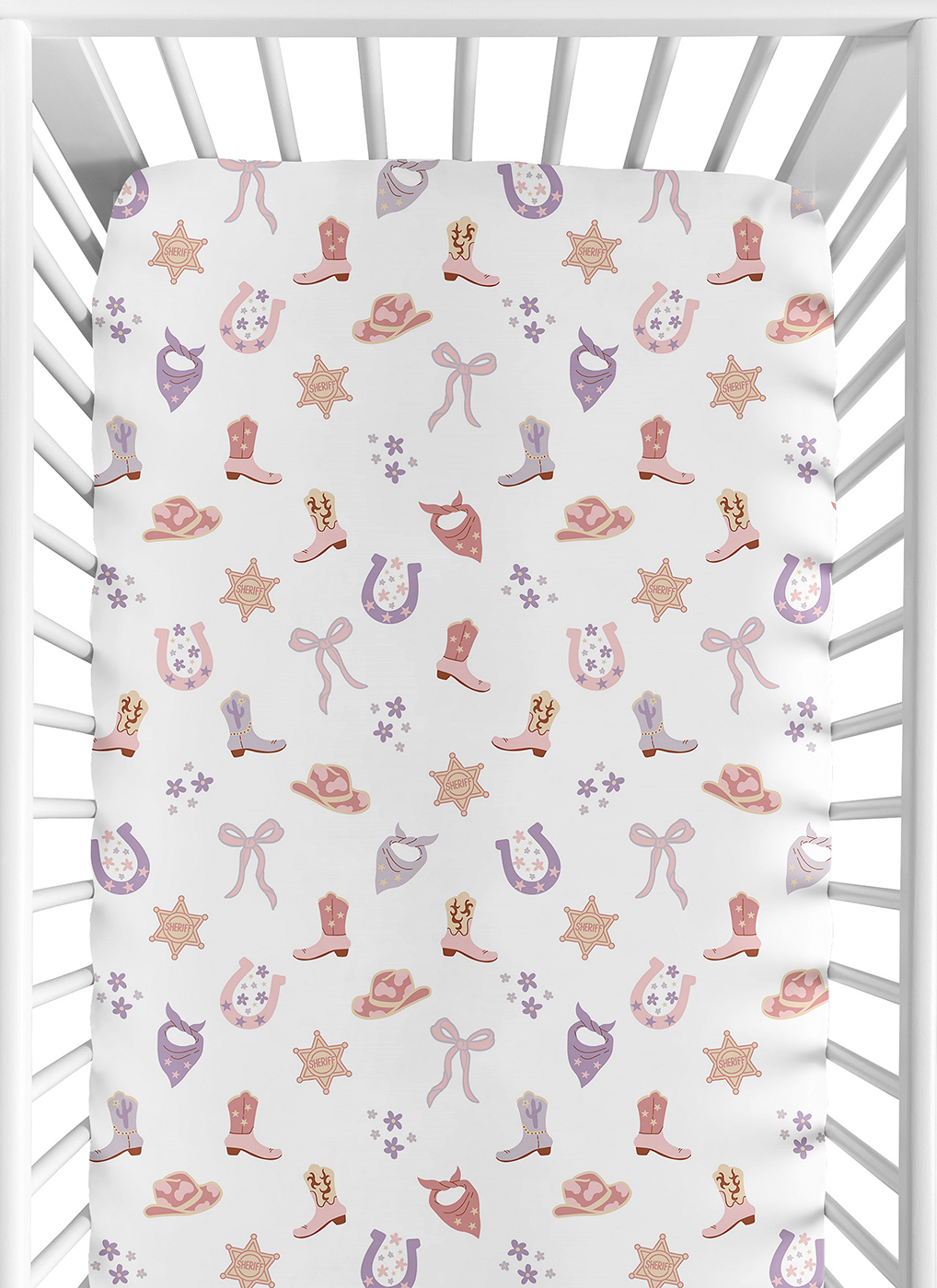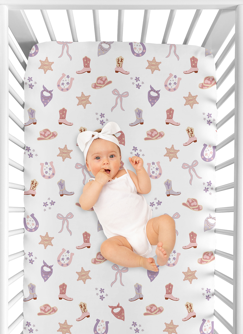 SNUG FIT: Includes (1) Fitted Crib Sheet 52in. x 28in. x 8in. Our newborn standard crib sheets fit snugly, with premium elastic sewn around the entire bottom edge for a secure fit on most standard sized cribs and toddler beds, to reduce shifting and bunching. This brushed microfiber crib sheet features an exclusive design of a pink, purple, orange & yellow rustic country, southwestern, southern charm, cowgirl western print and is gentle on delicate skin to foster a soothing sleep environment.DESIGNED IN THE USA: By real parents who understand the need for comfort, practicality, and style. Sweet Jojo Designs is a small, women owned business. The mom's on our team know a crib mattress sheet is first priority for your baby essentials to ensure a restful night of sleep. We use top fabrics and designs to create soft crib sheets that are stretchy & comfortable for your infant or toddler. We've studied the latest trends in western crib sheets for baby girl to bring you the finest product.SAFE & DURABLE: Sweet Jojo Designs is a proud Baby Safety Alliance member and rigorously tests products to meet or exceed CPSC safety standards. Our breathable crib sheets are designed with busy parents in mind. Quick to change, easy machine washable and tumble dry on low. The high quality stitching and fabric ensure long-lasting use and will hold up wash after wash. Use one crib sheet in your newborns bed and have spares nearby to swap in between washes & to be prepared if an accident happens.PERFECT GIFT: Add baby girl crib sheets to your list of must haves! Including a baby fitted crib sheet on your gift registry, in a baby shower gift basket or as a gender reveal present is an easy way to prepare for a baby's arrival. Whether it's nap time, bedtime, or an unexpected mess, having extras of these baby mattress sheets make changes effortless so you can focus on what matters most to you and your family. And remember, you can never have too many baby crib sheets or toddler bed sheets!NURSERY DESIGN MADE EASY: If you have a nursery to decorate, we have endless coordinating options to help. A nursery theme can be planned entirely around baby sheets for crib. Sweet Jojo Designs makes decorating simple with matching crib bedding sets, toddler bedding sets, crib sheet set, crib bed sheets, changing pad covers, milestone blankets, wall decor, decorative accessories, swaddles, and window treatments to make sure you have all you need to complete the look of your baby room. Item# CribSheet-Western-PK