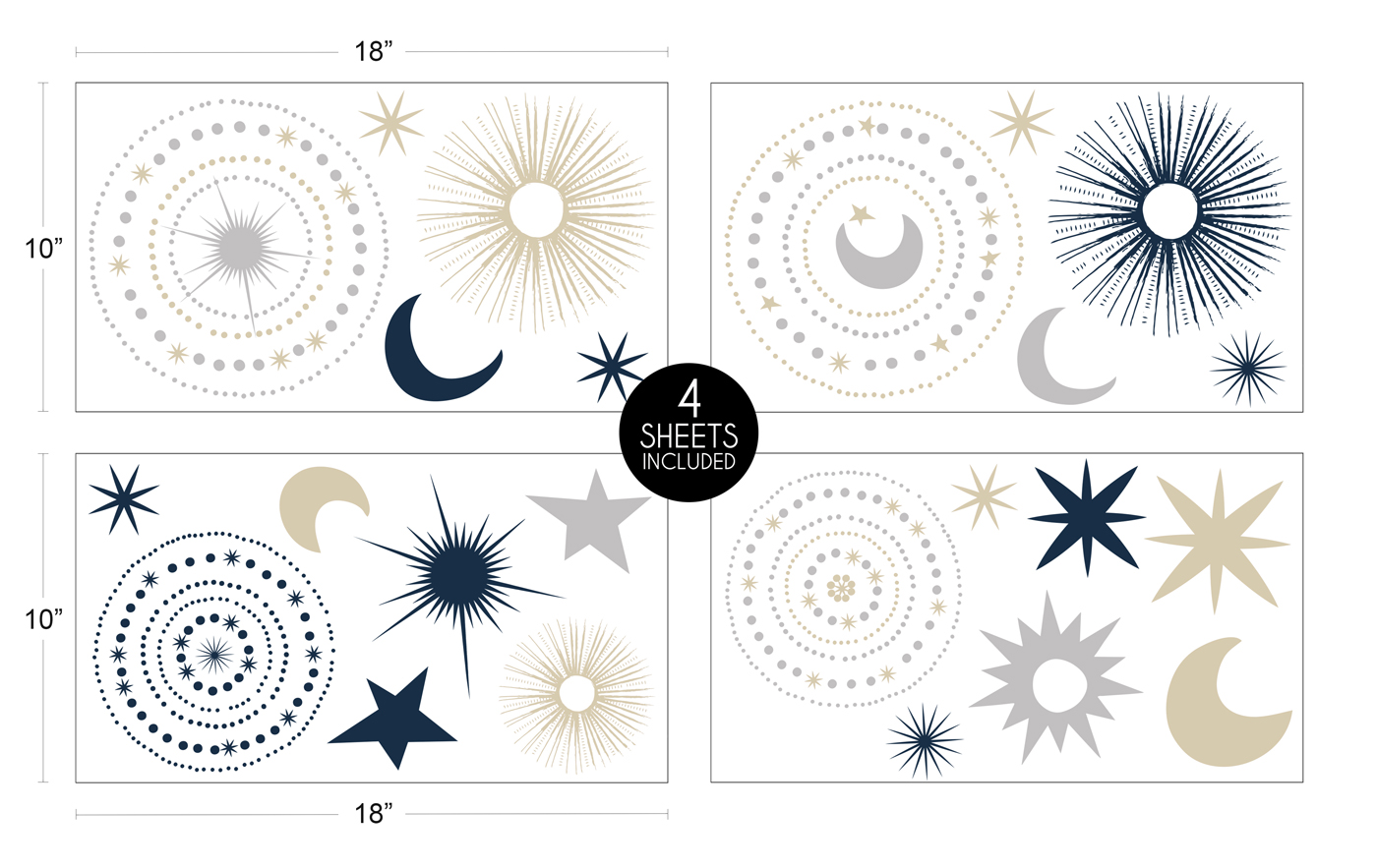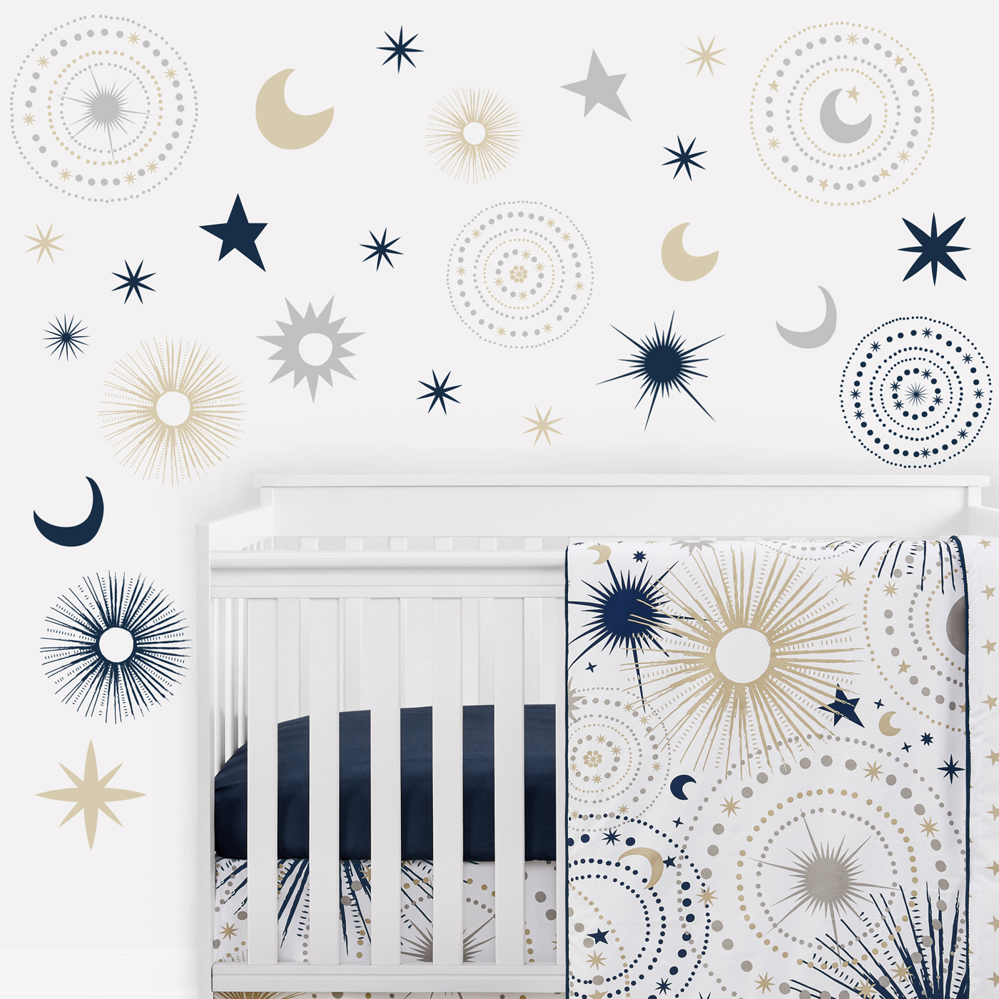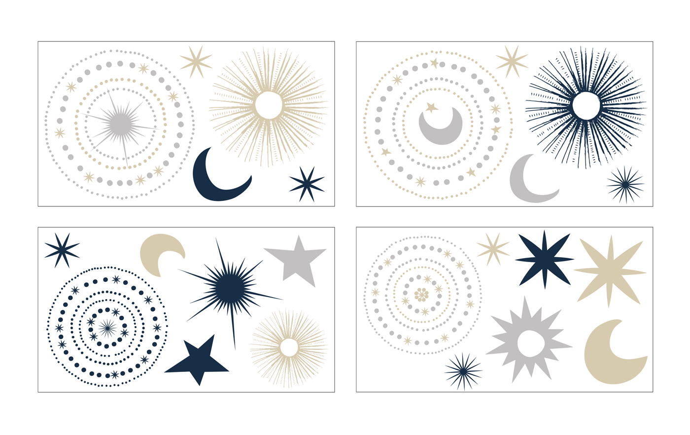 This design has matching accessories such as hampers, lamp shades, window treatments and wall decor coordinating sheets, border, wall decals, shower curtains, mobiles, changing pads and pillows cases Item# Decal-Celestial-BU