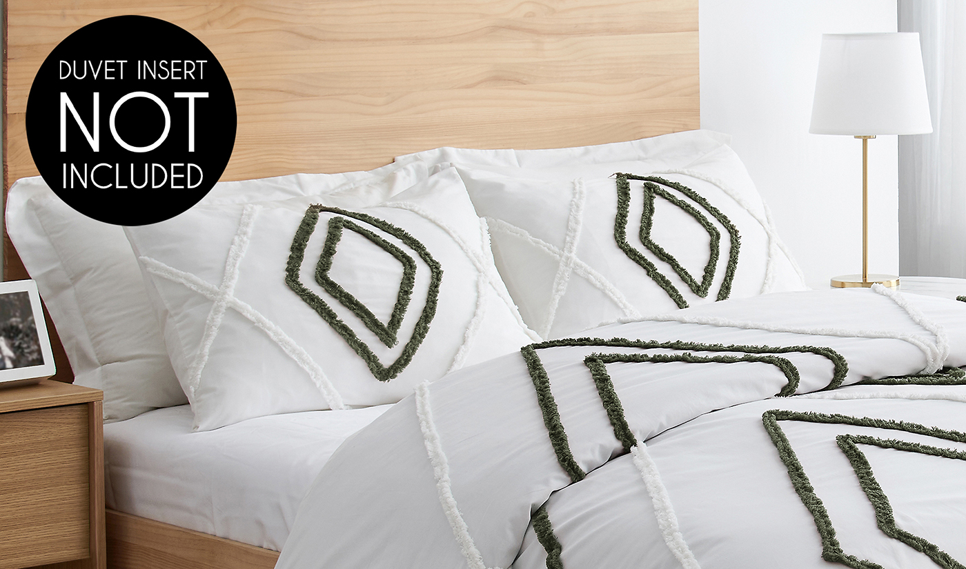 3PC QUEEN DUVET COVER SET INCLUDES: Lightweight Duvet Cover (90in. x 90in.) & Set of 2 Standard Shams (20in. x 26in.). COMFORTER INSERT NOT INCLUDED. Easy machine washable and dryable on low. This designer & southwest queen size duvet cover set unisex is made with super soft, moisture wicking 100% cotton fabric and features the soft color palette of hunter, sage green & off white to bring together this bohemian tribal, chevron geometric arrows look and matches the Diamond Tuft Collection.BOHO ELEGANT THEME: This queen full size duvet cover set boasts a soft duvet cover & pillow case shams. The comforter cover features a hunter green geometrical diamond design made of tufted and fringed macrame trims. This queen duvet set has matching pillow shams with the same print that effortlessly makes them a standout addition to any kids bedroom decor. If you're looking for a minimalist & whimsical aesthetic for your room makeover, this duvet cover set queen size is the perfect focal point.DESIGNED IN THE USA: By a small, women owned business that understands the need for comfort, practicality, & style. Made with premium materials to create comfortable bedding for you or your loved ones, our duvet covers are low maintenance. Simply remove from your filled comforter or blanket insert & put in the washer to clean as easily as you would bed sheets. Duvets eliminate the need to worry about the fill in a comforter shifting or clumping in the wash or your comforter taking forever to dryMATCHING DECOR & ACCESORIES: Purchasing a duvet set queen from Sweet Jojo Designs offers many benefits. If you have a room to decorate, we have endless options to help. An interior design theme can be planned around a bedding duvet comforter set, creating a cohesive space without mixing & matching. Sweet Jojo Designs adds a personalized touch to your space with a wide variety of coordinating room decor such as window treatments, wall decor, sheet sets, shower curtains, memo boards & more.PERFECT GIFT: A queen bed duvet cover set that includes a bedding duvet cover & shams offers convenience & savings & should be #1 on your bedroom makeover essentials necessities list! Duvet cover set queen make a unique & thoughtful birthday gift, graduation present, college dorm care package, house warming gifts, or Easter basket stuffers for kids, teens, & adults. This practical gift idea provides comfort & warmth through the all seasons comforter & pillow protection through pillow shams.Item# DiamondTuft-DK-GR-Duvet-Q
