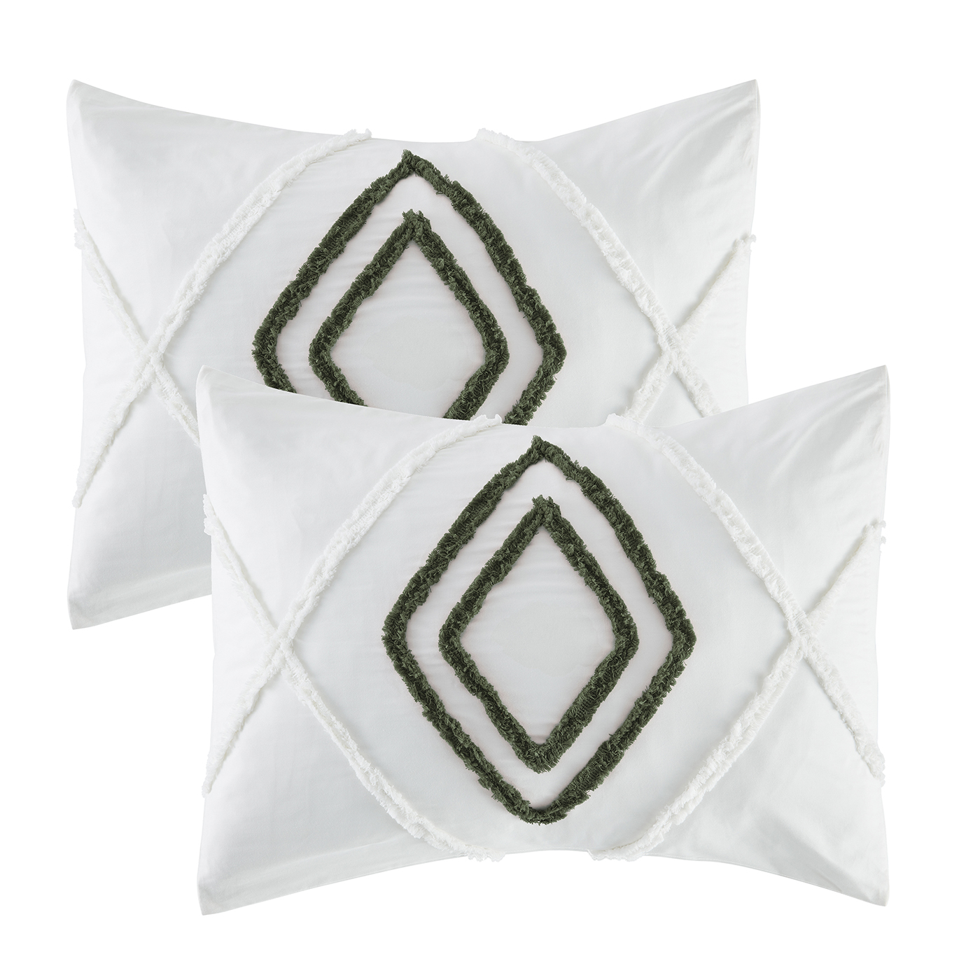 The 3pc Dark Green Diamond Tuft bohemian Full/Queen Duvet Bedding Collection by Sweet Jojo Designs will create a modern southwest look for your bedroom. This boho bedding set uses a sensational collection of exclusive cotton and brushed microfiber fabrics. This farmhouse set is made with 100% washed cotton accented with a unique diamond geometrical design made of tufted and fringed macrame trims. The earthy neutral color palette of hunter sage green, ivory and off white will set your bed room up in sophisticated style. This Sweet Jojo Designs set will fit all standard full and queen beds and is machine washable for easy care and repeated use.