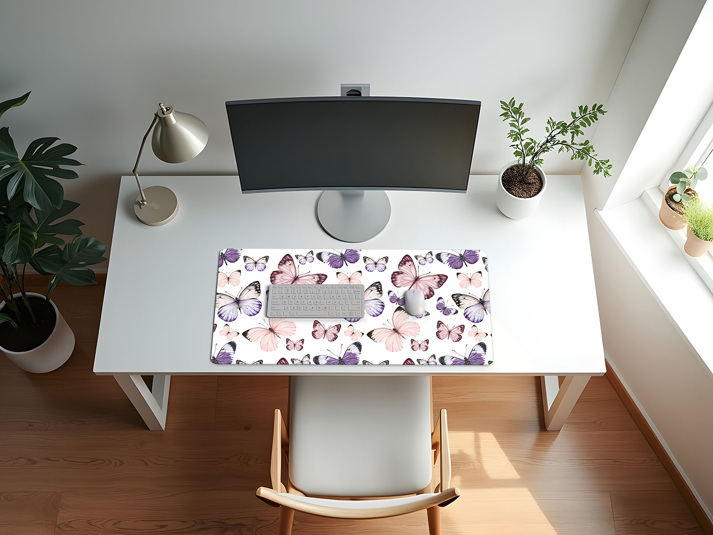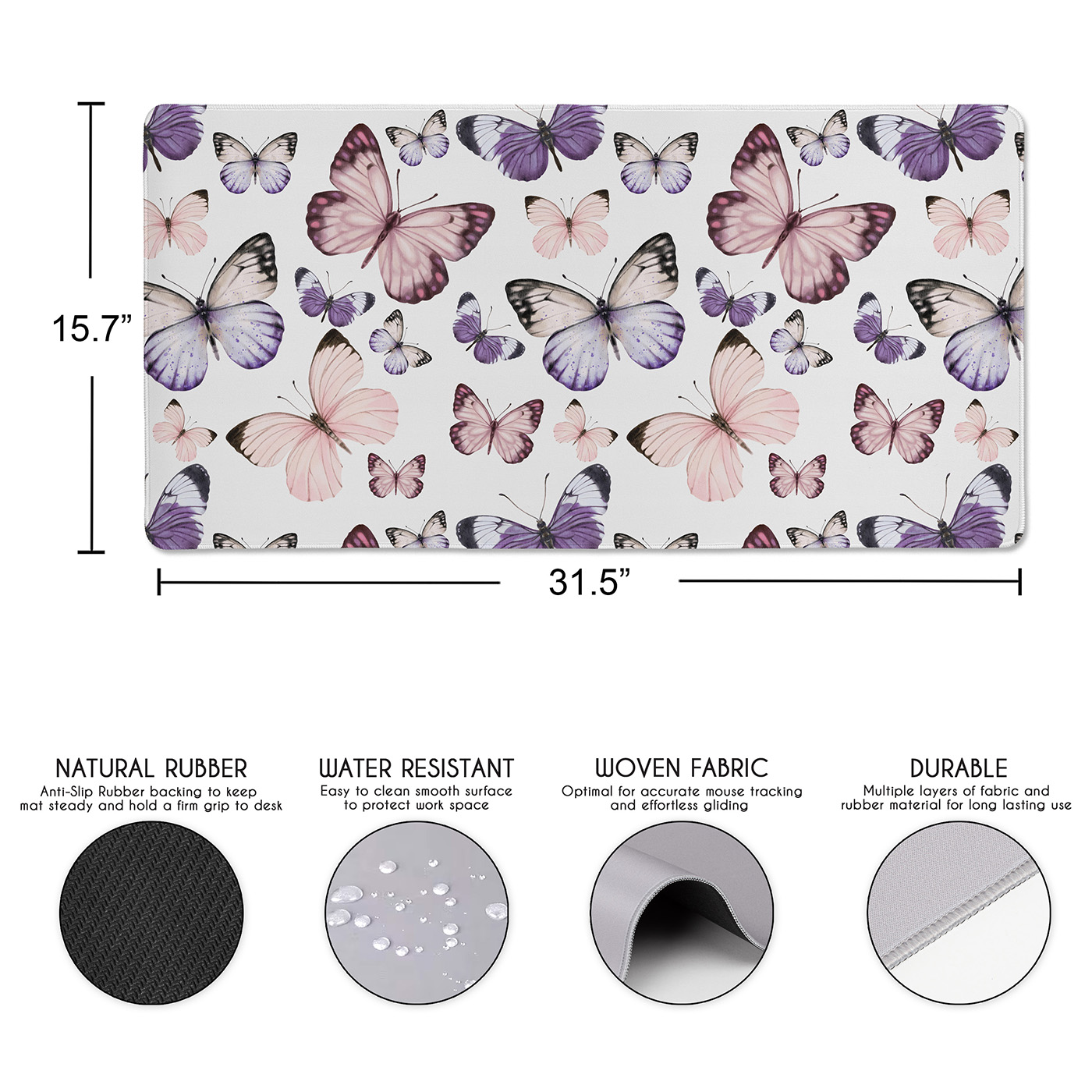 UPGRADE YOUR OFFICE DECOR FOR WOMEN: With a large mousepad that measures (31.5in. x 15.7in.). Made with a 100% polyester waterproof fabric cloth top layer that is easy to clean & a natural rubber bottom layer with woven stitched edges to create a gaming mouse pad that is smooth & stays in place for your keyboard, mouse & other computer accessories. This desk pad features a pink and pastel purple, lilac and lavender color palette in a shabby, whimsical, nature, cottagecore, moth, butterfly print.ENHANCE THE WAY YOU GAME: Place this extended mouse pad on your computer desktop as the perfect office desk decor that fits all your gaming accessories needs such as your gaming keyboard, mouse, laptop and more. Created with a non-slip rubber base that firmly grips your desk to avoid any unwanted mouse movements during those crucial game moments. Glide your cursor across the xl mouse pad, and watch how fast, accurate and stable control can change the game play while never running off the edge!VERSATILE DESK COVER MAT: Cover your current plain desk top with a decorative computer desk mat with your favorite prints to give any room or office your personal touch. Don't stop at gaming! Use the waterproof design on this keyboard pad for table protection against every day messy activities such as eating, drinking, working from home, surfing the web, typing, writing, drawing, make up, puzzles, wear and more! Made with stitched edges ensures a lasting & quality large mouse pad for desk.DESIGNED IN THE USA: By real gamers, students and office workers who understand the need for style, practicality, & size when it comes to a desk pad for keyboard and mouse. Each mouse pads for desk is made with a cushioning soft fabric to help reduce noise and vibration from keystrokes, clicker movement, trackpads jostling, stylus sketching and trackball rolling to create a seamless, uniform surface without the need for multiple smaller desktop pads with this essential decorative mousepad xl.MATCHING DECOR & ACCESORIES: Include your office accessories and office supplies for desk when thinking of decor in your computer room or home office. This desk pad mat adds style & functionality to any table while creating a space you will love to be in. Match your keyboard and mouse pad with your favorite Sweet Jojo Designs coordinating room decor such as window treatment curtains, valances, throw pillows, cub storage bins, wall art, home decor, lamp shades, blankets, memo boards, and more.Item# DMLG-Butterfly-PU