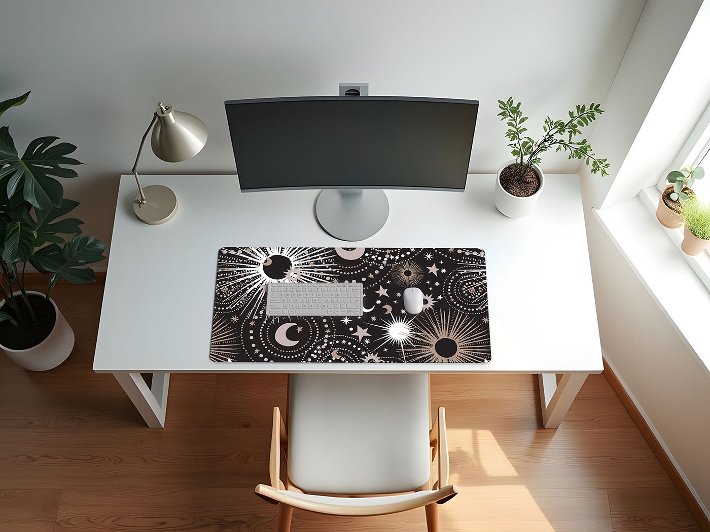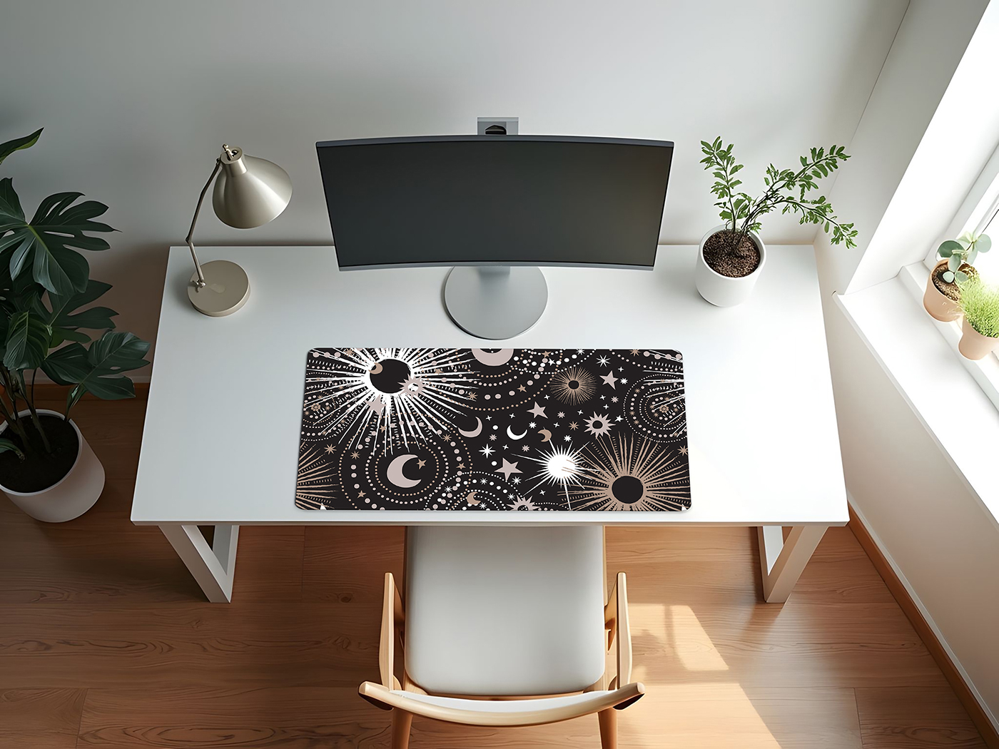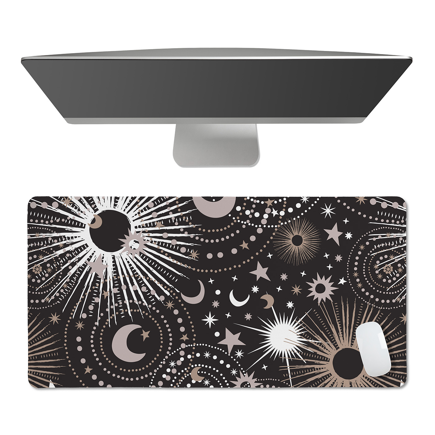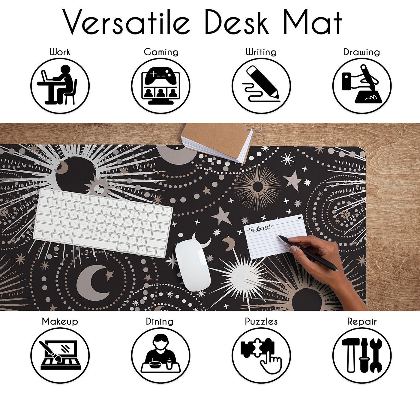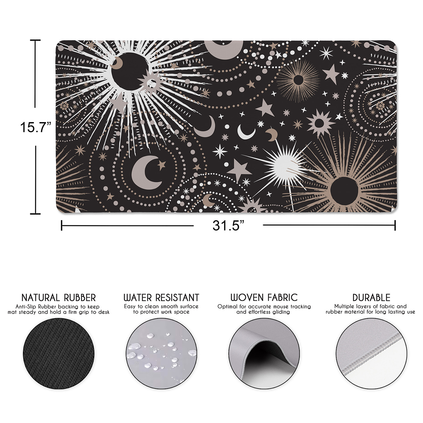 UPGRADE YOUR OFFICE DECOR FOR WOMEN & MEN: With a large mousepad that measures (31.5in. x 15.7in.). Made with a 100% polyester waterproof fabric cloth top layer that is easy to clean and a natural rubber bottom layer with woven stitched edges to create a gaming mouse pad that is smooth and stays in place for your keyboard, mouse and other computer accessories. This desk pad features a black, white grey, gold and gray color palette in a galactic, abstract stars, outerspace, moon and star print.ENHANCE THE WAY YOU GAME: Place this extended mouse pad on your computer desktop as the perfect office desk decor that fits all your gaming accessories needs such as your gaming keyboard, mouse, laptop and more. Created with a non-slip rubber base that firmly grips your desk to avoid any unwanted mouse movements during those crucial game moments. Glide your cursor across the xl mouse pad, and watch how fast, accurate and stable control can change the game play while never running off the edge!VERSATILE DESK COVER MAT: Cover your current plain desk top with a decorative computer desk mat with your favorite prints to give any room or office your personal touch. Don't stop at gaming! Use the waterproof design on this keyboard pad for table protection against every day messy activities such as eating, drinking, working from home, surfing the web, typing, writing, drawing, make up, puzzles, wear and more! Made with stitched edges ensures a lasting & quality large mouse pad for desk.DESIGNED IN THE USA: By real gamers, students and office workers who understand the need for style, practicality, & size when it comes to a desk pad for keyboard and mouse. Each mouse pads for desk is made with a cushioning soft fabric to help reduce noise and vibration from keystrokes, clicker movement, trackpads jostling, stylus sketching and trackball rolling to create a seamless, uniform surface without the need for multiple smaller desktop pads with this essential decorative mousepad xl.MATCHING DECOR & ACCESORIES: Include your office accessories and office supplies for desk when thinking of decor in your computer room or home office. This desk pad mat adds style & functionality to any table while creating a space you will love to be in. Match your keyboard and mouse pad with your favorite Sweet Jojo Designs coordinating room decor such as window treatment curtains, valances, throw pillows, cub storage bins, wall art, home decor, lamp shades, blankets, memo boards, and more.Item# DMLG-Celestial-BK