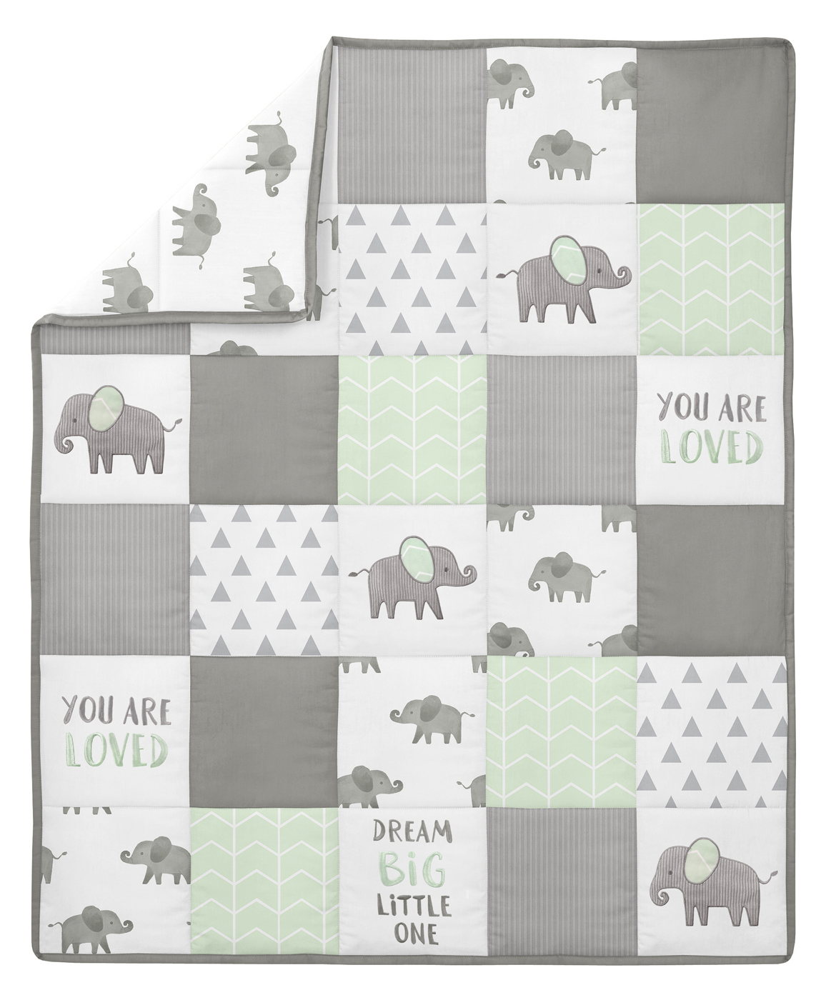 Mint and Grey Elephant 5 pc Crib Bedding set has all that your little bundle of joy will need. Let the little one in your home settle down to sleep in this incredible nursery set. This unisex baby bedding set features an impressive array of exclusive prints combining a watercolor elephant print, a chevron arrow print and a triangle print paired with solid coordinating fabrics. This collection uses the stylish colors of mint, grey and white. The design uses brushed microfiber and corduroy fabrics that are machine washable for easy care. This wonderful set will fit most standard cribs and toddler beds.