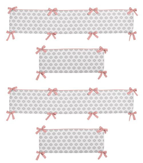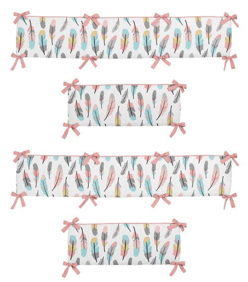 Now you can complete your nursery decor with this Sweet Jojo Designs Turquoise and Coral Feather crib bumper. This bumper is created using the multicolored feather print and reverses to the grey tribal geometric print. It is finished with coral piping and upper and lower ties. The color palette of coral, turquoise, grey, gold and white will set your nursery up in high style.