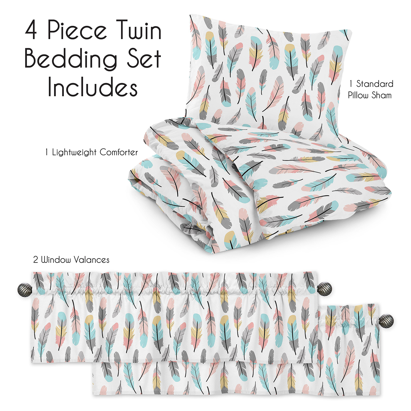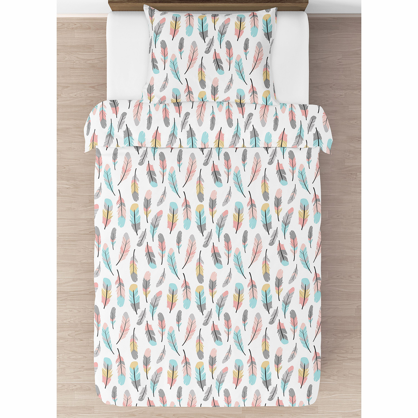 Turquoise and Coral Feather Twin Bedding set will help you create an incredible room for your child. This stylish designer bedding set uses a multicolored feather print. This collection uses the stylish colors of coral, turquoise, grey, gold and white. The design uses brushed microfiber fabrics that are machine washable for easy care. This wonderful set will fit all standard twin beds.
