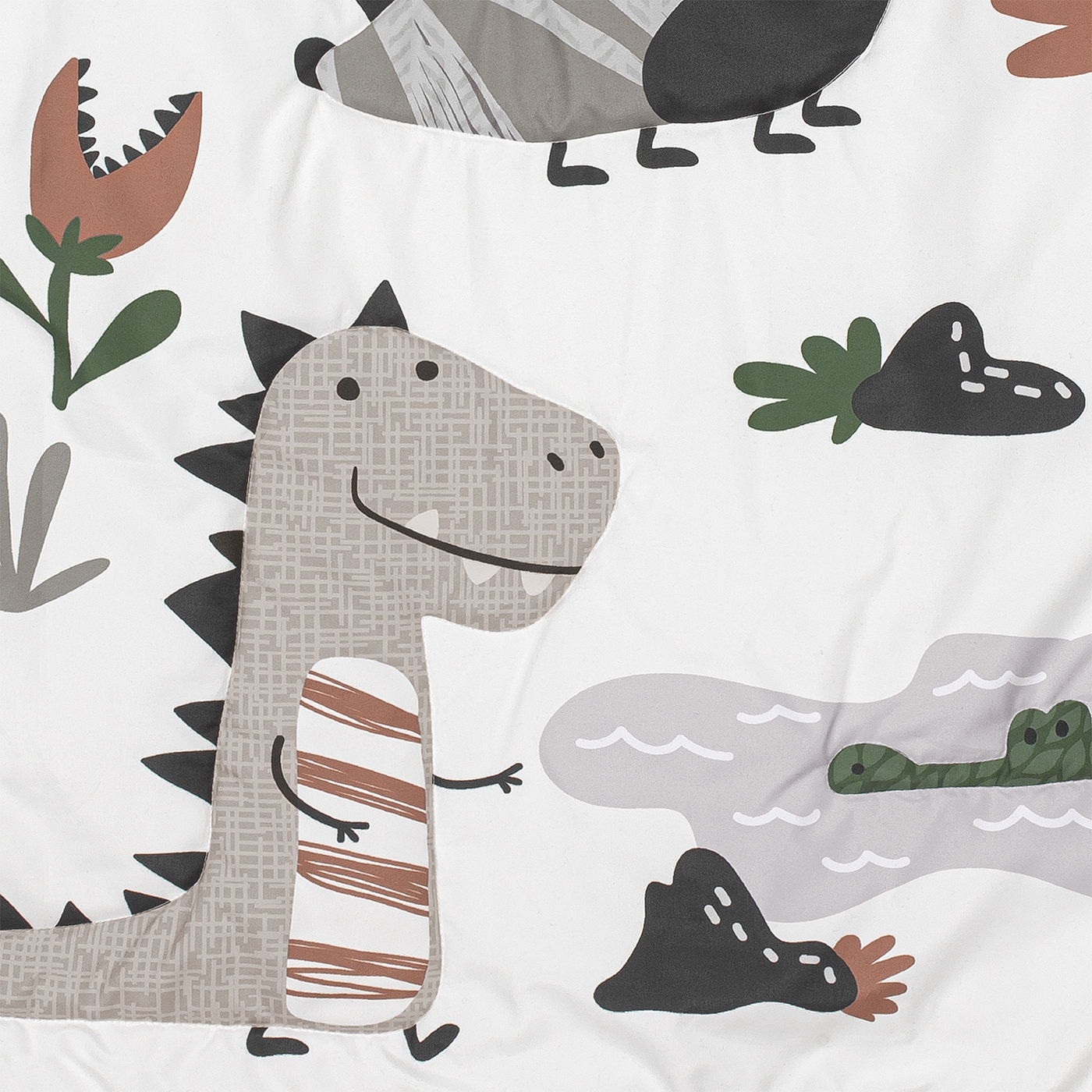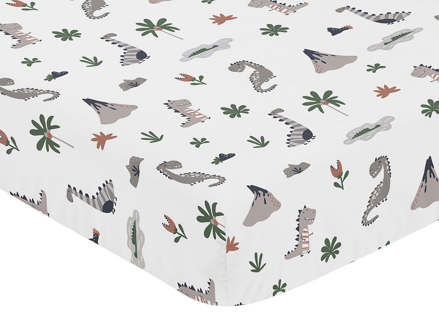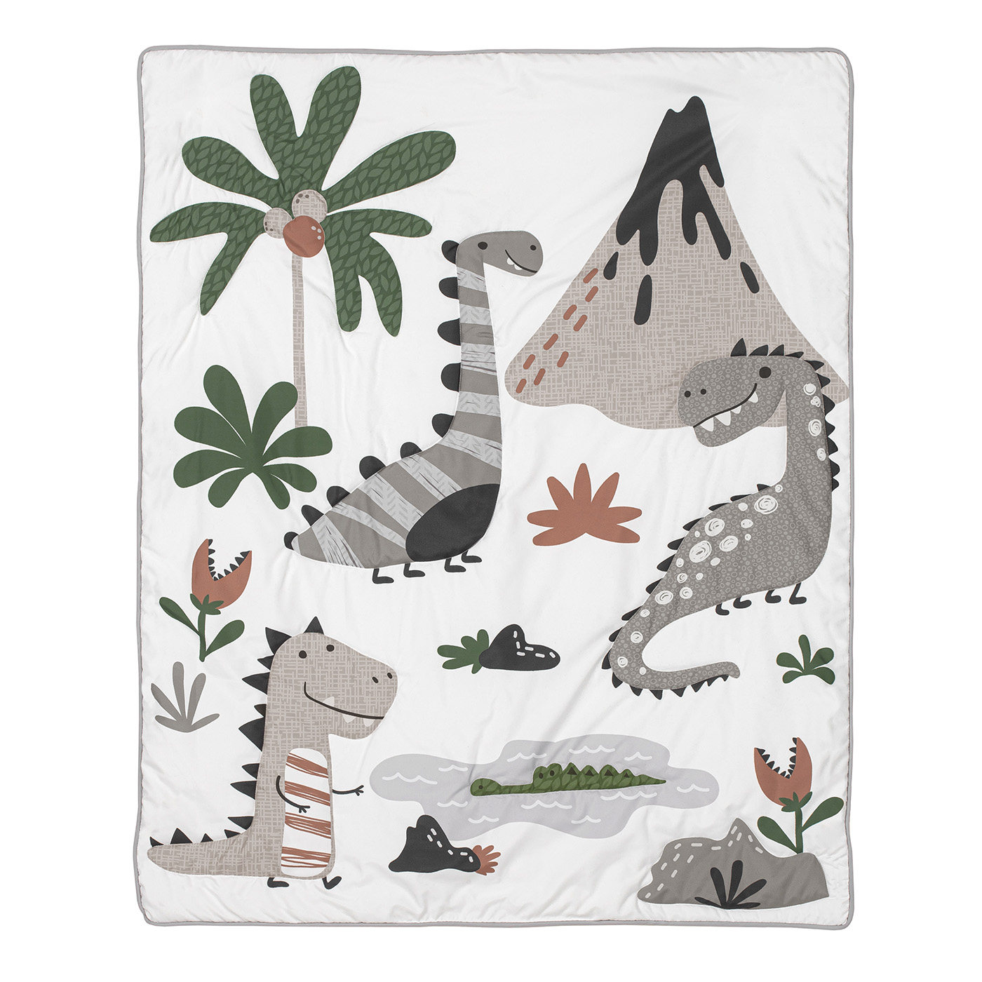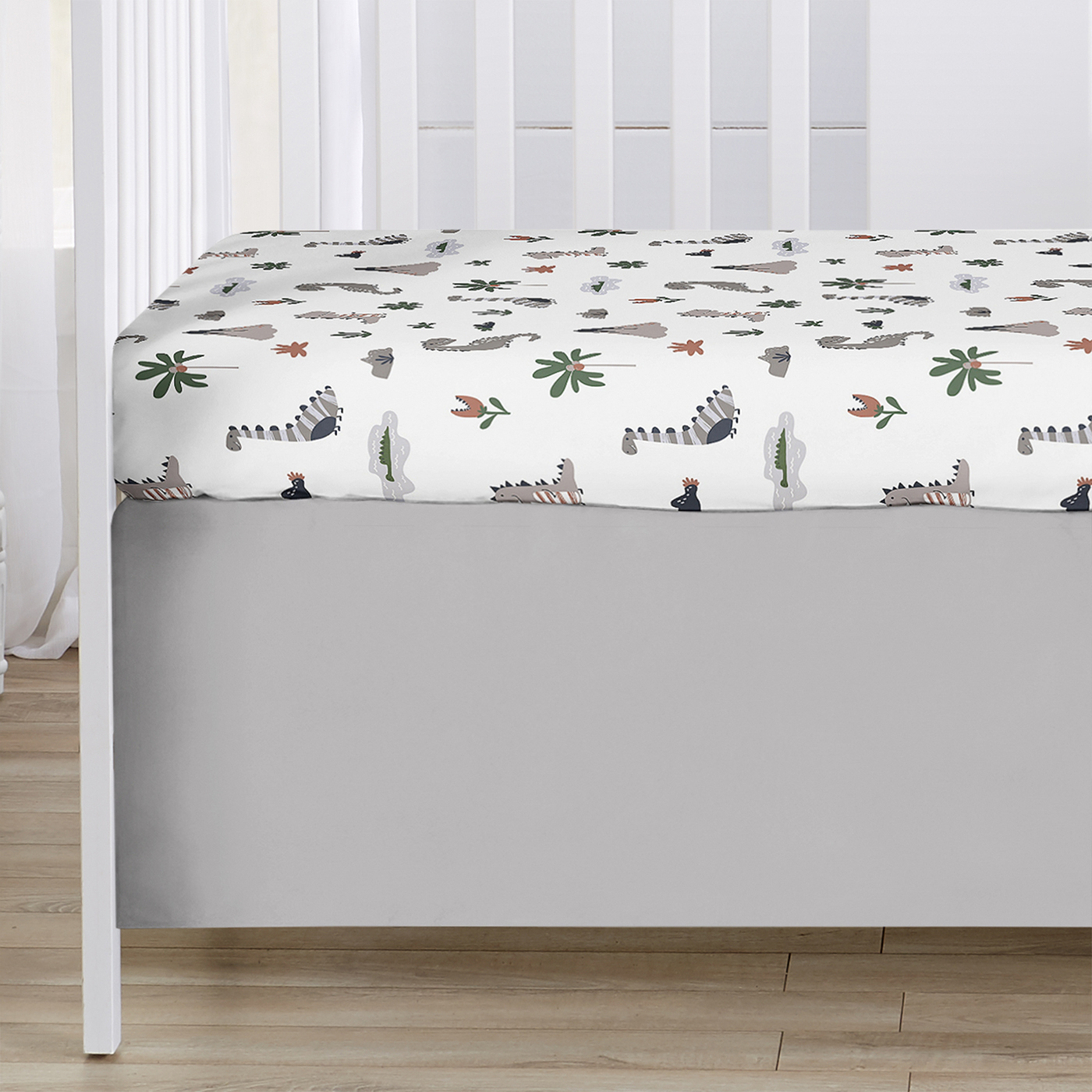 3 Piece Crib Bedding Set Includes: Crib Comforter (41in. x 32in.), Fitted Crib Sheet (52in. x 28in. x 8in. Pocket), Crib Skirt (52in. x 28in. x 12in. Drop)This baby crib set is made of brushed microfiber fabric and is machine washable. Tumble dry low.The perfect baby shower gift! All your baby room essentials can be found in one set for your nursery. Newborn blanket features a beige, grey, taupe, slate gray, and green modern reptile volcano trex alligator earthy mod dino dinosaurs print and reverses to solid white. Ultra soft crib mattress sheet is made with brushed microfiber. Crib bed skirt dust ruffle features straight solid grey.This baby bedding set boasts a beige, grey, taupe, slate gray, and green modern reptile volcano trex alligator earthy mod dino dinosaurs print.Sweet Jojo Designs offers matching accessories such as crib sheets, changing pads, wall decor, window treatments, musical mobiles, storage options, and much more. This design is also available in crib, toddler, twin, and queen bedding sets.Item# HappyDinosaur-LC-Crib-3