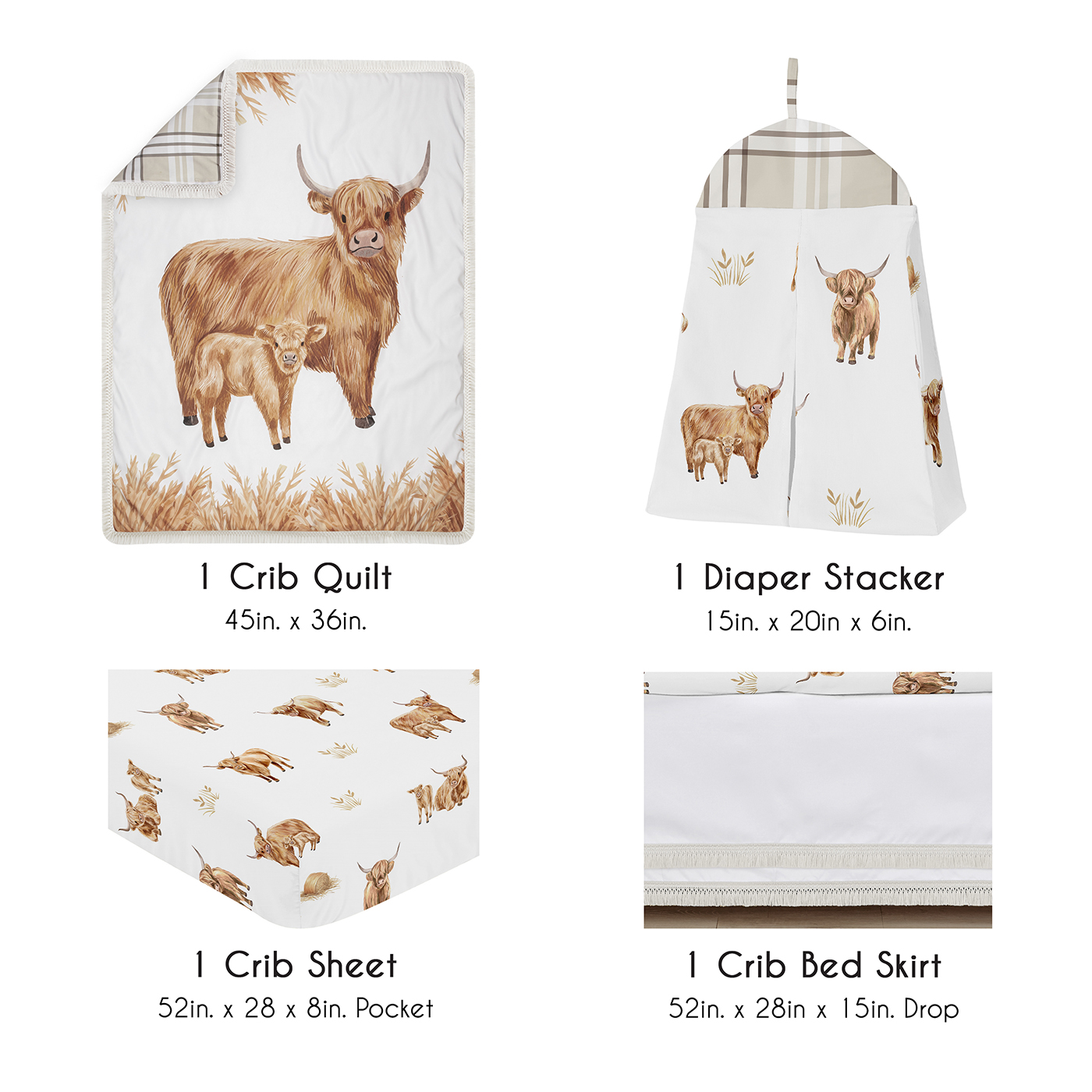 4 PIECE CRIB BEDDING SET INCLUDES: Crib Comforter (45in. x 36in.), Fitted Crib Sheet (52in. x 28in. x 8in. Pocket), Crib Skirt (52in. x 28in. x 15in. Drop) & Diaper stacker (15in. x 20in. x 6in.). An infant crib set including all the baby essentials is a great value compared to purchasing pieces separately. This baby crib set is made of soft microfiber fabric & features the neutral color palette of warm, brown tones to bring your western, country animals, southwestern themed baby room together.COUNTRY WESTERN THEME: This unisex baby crib bedding set boasts a crib blanket featuring a modern highland cow and calf that reverses to a classic beige and taupe plaid pattern. The solid white skirt is adorned with two rows of delicate bohemian macrame fringe detailing. The cattle ranch animals breathable crib sheet has elastic sewn around the bottom edge for a secure fit on most standard cribs. The matching diaper stacker keeps nappies conveniently organized. Machine washable. Tumble dry low.DESIGNED IN USA TO BE SAFE & DURABLE: As a proud Baby Safety Alliance member who rigorously tests products to meet or exceed CPSC safety standards, Sweet Jojo Designs is dedicated to creating high-quality products that blends style, comfort, and functionality. Our products are crafted with premium materials and details to support your baby's sleep and well-being and help parents design the perfect space for their little one. Trusted by families worldwide, we bring your nursery vision to life.PERFECT GIFT: Add a gender neutral baby crib set to your list of must haves! Including a toddler crib bedding set on your gift registry, in a baby shower gift basket or as a gender reveal present is an easy way to prepare for a baby's arrival. A quilt provides unique decor or a cuddle time blankie & fitted crib sheets provide a soft surface to sleep on. Crib bed skirt dust ruffles add a polished touch & can hide storage under the crib. And a diaper stacker keeps diapers organized & accessible.NURSERY DESIGN MADE EASY: If you have a room to decorate, we have endless coordinating options to help. A nursery theme can be planned around baby bedding set, which creates a stylish cohesive room without having to mix and match pieces. Sweet Jojo Designs makes decorating simple with matching crib sheets, toddler bedding sets, crib sheet sets, changing pad covers, milestone blankets, wall decor, decorative accessories, window treatments and more to complete the look of your baby room. Item# HighlandCow-Crib-4