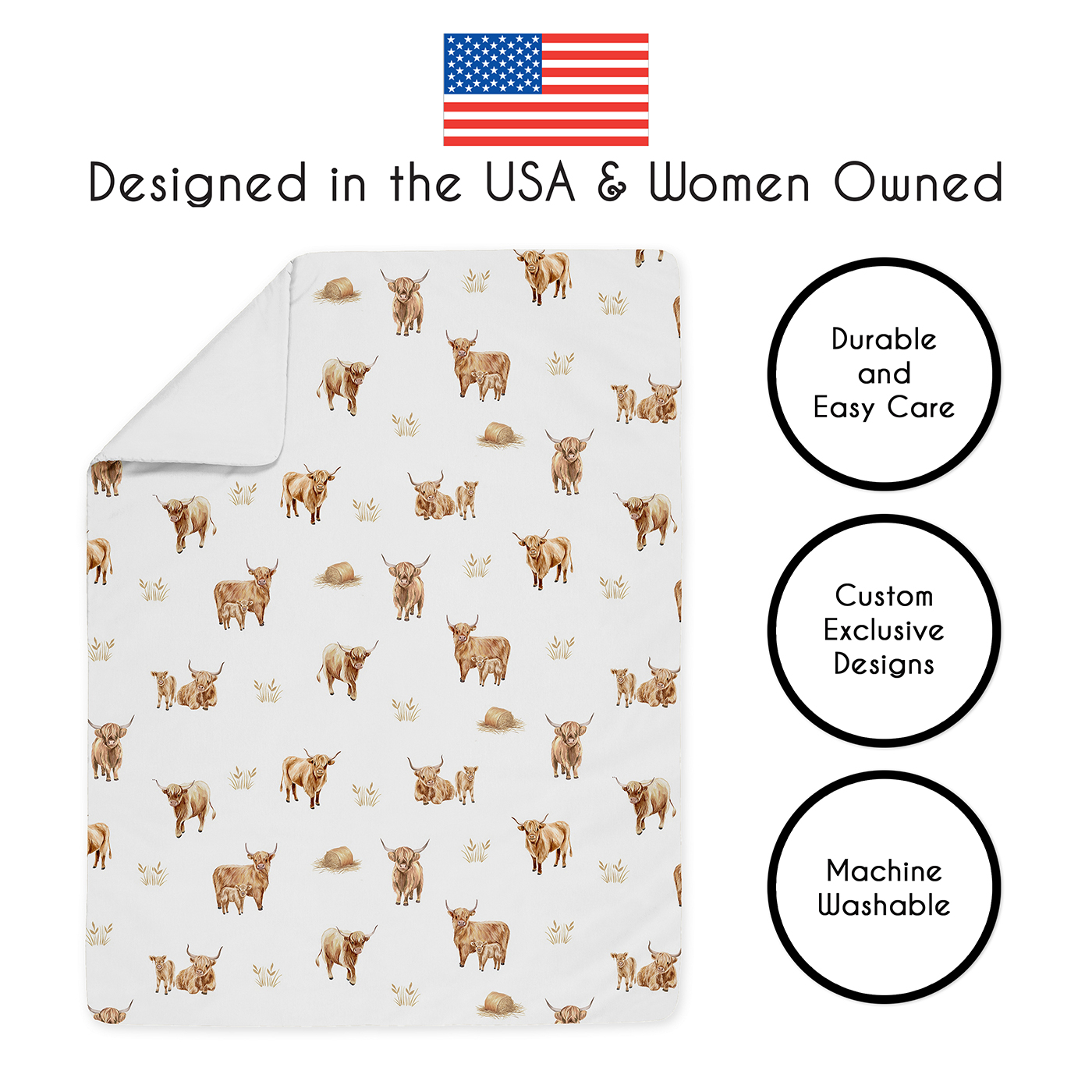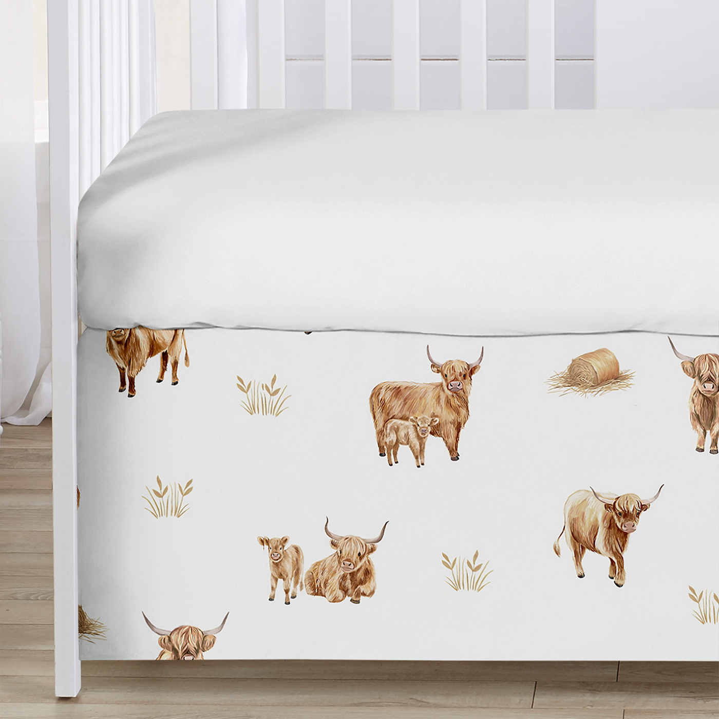 3 PIECE CRIB BEDDING SET INCLUDES: Crib Comforter (41in. x 32in.), Fitted Crib Sheet (52in. x 28in. x 8in. Pocket), & Crib Skirt (52in. x 28in. x 12in. Drop). An infant crib set including all the baby essentials is a great value compared to purchasing pieces separately. This baby crib set is made of soft microfiber fabric & features the gender neutral color palette of warm, natural brown & taupe tones to bring your western, country animals, cattle ranch, southwestern themed baby room together. COUNTRY WESTERN THEME: This unisex baby bedding set boasts a crib blanket featuring a rustic southwestern, longhorn cattle, high land mother cow with highland calves in nature with watercolor hay bales and delicate prairie grass & it reverses to a solid white. The matching straight country animals print skirt is made of soft brushed microfiber. The solid white breathable crib sheet has elastic sewn around the bottom edge for a secure fit on most standard cribs. Machine washable. Tumble dry low.DESIGNED IN USA TO BE SAFE & DURABLE: As a proud Baby Safety Alliance member who rigorously tests products to meet or exceed CPSC safety standards, Sweet Jojo Designs is dedicated to creating high-quality products that blends style, comfort, and functionality. Our products are crafted with premium materials and details to support your baby's sleep and well-being and help parents design the perfect space for their little one. Trusted by families worldwide, we bring your nursery vision to life.PERFECT GIFT: Add a gender neutral baby crib set to your list of must haves! Including a toddler crib bedding set on your gift registry, in a baby shower gift basket or as a gender reveal present is an easy way to prepare for a baby's arrival. A quilt provides unique decor or a cuddle time blankie and fitted crib sheets provide a soft surface to sleep on. Crib bed skirt dust ruffles add a polished touch and can hide storage under the crib.NURSERY DESIGN MADE EASY: If you have a room to decorate, we have endless coordinating options to help. A nursery theme can be planned around baby bedding set, which creates a stylish cohesive room without having to mix and match pieces. Sweet Jojo Designs makes decorating simple with matching crib sheets, toddler bedding sets, crib sheet sets, changing pad covers, milestone blankets, wall decor, decorative accessories, window treatments and more to complete the look of your baby room. Item# HighlandCow-LC-Crib-3