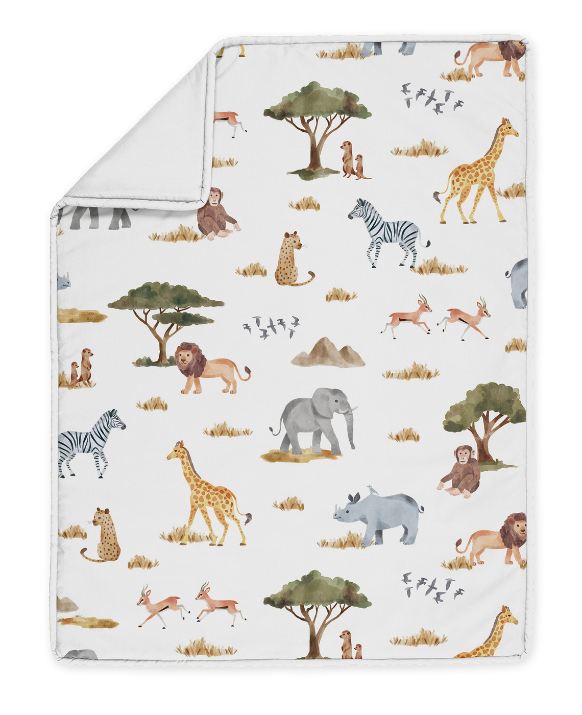 Jungle 3pc Mini Crib Bedding set has all that your little bundle of joy will need for the perfect baby nursery, making this a great addition to your newborn essentials. This mini crib bedding set will fit most porta and mini crib mattresses as well as infant play yards, play pens and pack and plays. The ensemble is designed for smaller size baby beds and will not fit on a standard size newborn mattress. This safari themed gender neutral portable mini crib bedding features a hand painted watercolor jungle animals complete with lions, leopards, elephants, zebras, giraffes, rhinos, gazelles, chimps, and meerkats along with a mud cloth inspired hatch print. This modern unisex set uses brushed microfiber and stylish shades of dark greens, golds, browns and soft greys on a colorful nature scene that pops against the white background are machine washable for easy care. Sweet Jojo Designs creates various coordinating room accessories for all children’s bedding sets including changing pad covers, storage solutions, wall decor, hampers, and window treatments.