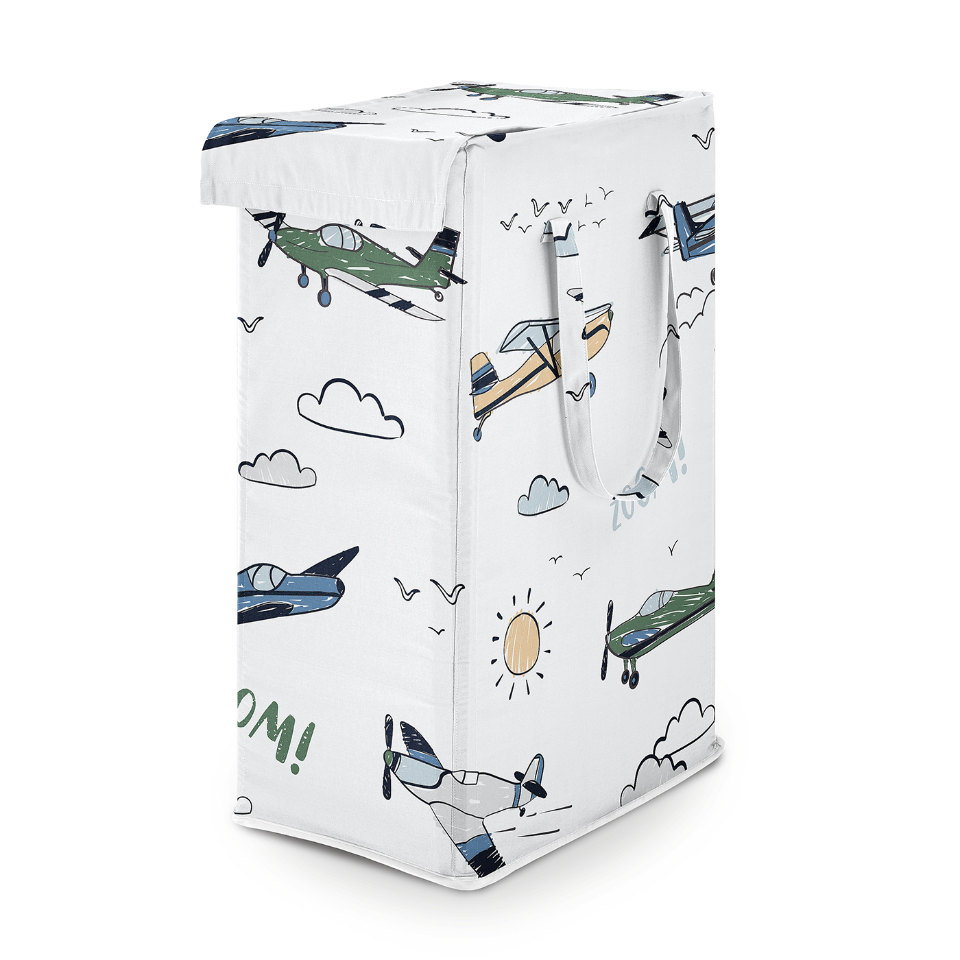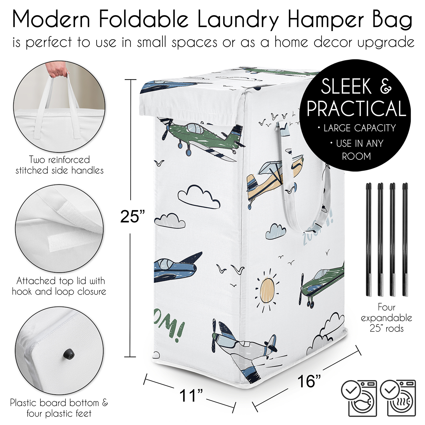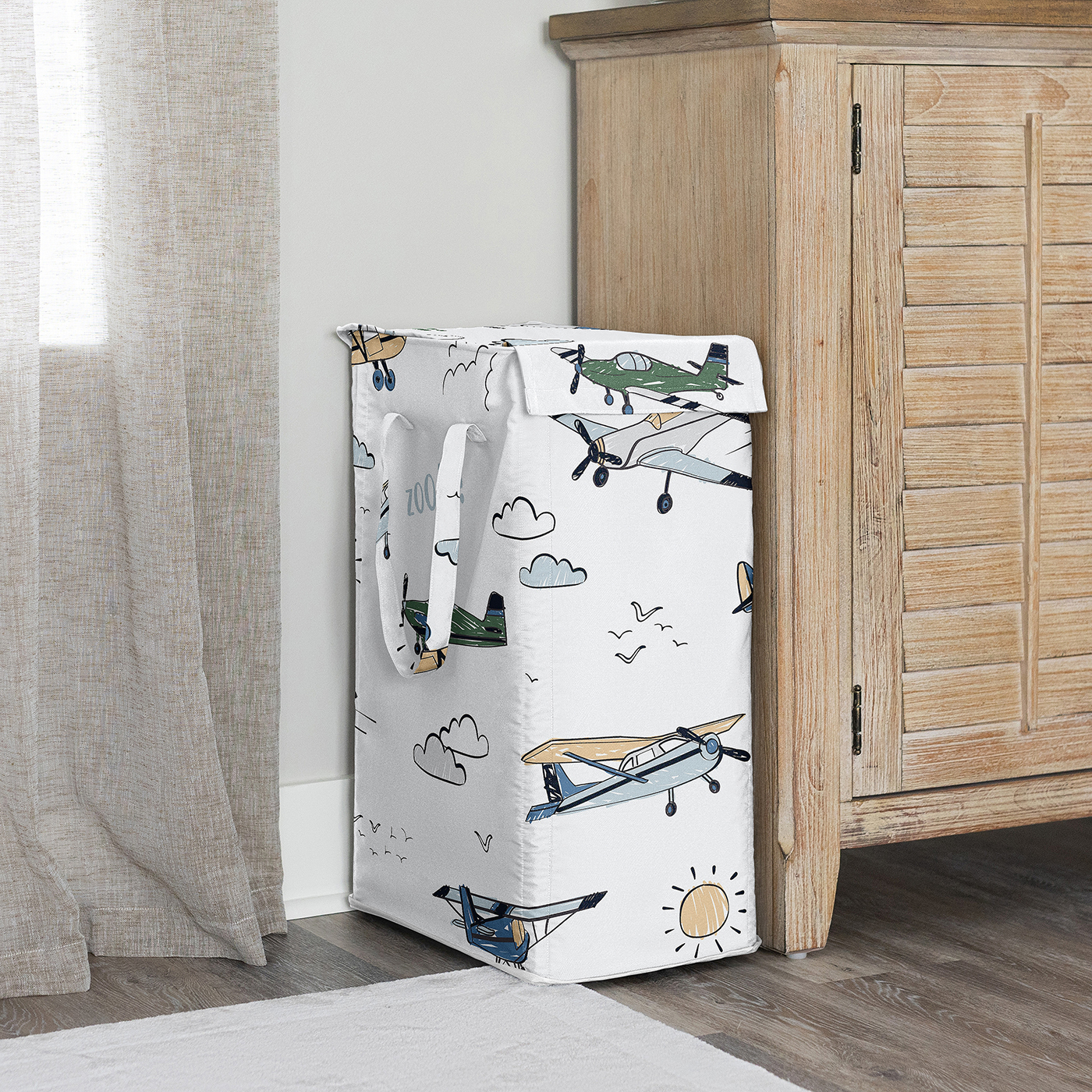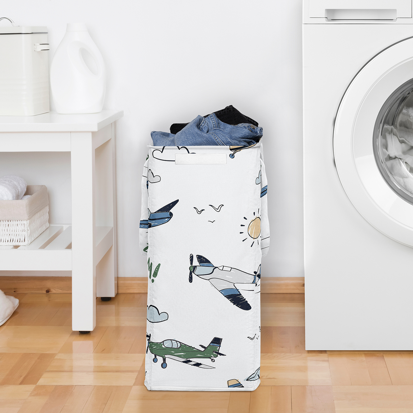 Includes: (1) Modern Laundry Hamper: 16in. x 11in. x 25in. and (4) Foldable Glass Fiber Rods, 24in. EachFeaturing exclusive canvas fabric of grey, yellow, green, gray, white and blue vintage airplanes, transportation, air plane, clouds, sun, sky, aviator, aviation, airplane print. To wash fabric, remove rods and machine wash cold, tumble dry low.This foldable hamper sorter is the perfect laundry organizer for every member of your family. Tote your dirty clothes around using the 2 reinforced handles with durable stitching without worry of handles tearing. When you’re not using the hamper and ready to save some space, simply remove the fiber rods from each of the four corners of the bin to collapse down into a small rectangle to store easily under the bed, in your closet, in your bathroom cabinet, or next to your dresser.The rectangular shape of the clothes hamper gives a sleek and practical look that compliments any interior design style. Get one for every room in the home – ideal for nurseries, bedrooms, playrooms, laundry rooms, guest rooms, bathrooms, kids bed rooms, closets, dens, attics, basements, and college dorms. If you want to make laundry day a breeze, buy two for each room so dark and light dirty clothing can be sorted, organized and ready to wash before you bring it to the machine.Makes the perfect gift to coordinate with Sweet Jojo Designs nursery bedding, adult duvets and comforter sets, changing pad covers, crib sheets, home decor accessories, storage solutions and window treatments! It can also double as a functional decorative alternative to gift bags or wrapping paper by placing your birthday, baby shower or gender reveal presents within the hamper itself so it can later be reused by the recipient.Item# Laundry-Airplane-GR-BU