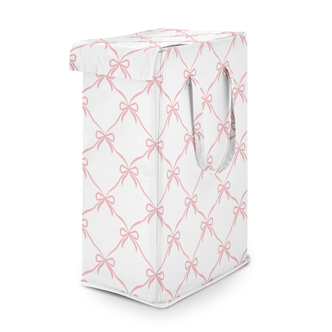 UPGRADE YOUR HOME STORAGE: with a Modern Laundry Basket that measures 16in. x 11in. x 25in. & includes (4) Foldable Glass Fiber Rods, 24in. each. Made with exclusive canvas fabric that is easy to wash by removing the rods and machine wash cold, tumble dry low. This laundry bag features an exclusive design of blush pink & white bows print for the Ballerina, Ballet, Dancer, Princess Collection to bring your shabby chic themed room together and upgrade both your bedroom decor and clothes storage!DESIGNED IN THE USA: By real parents who understand the need for practicality and style in collapsible laundry baskets. Sweet Jojo Designs is a small, women owned business. The mom's on our team know decorative laundry baskets are a priority for your laundry room organization or home storage needs. We use top fabrics and designs to create a laundry hamper with lid to fit your vision. We've studied the latest trends in pink bows foldable laundry basket to bring you the finest product.SLIM & DURABLE: This laundry bin is the perfect laundry organizer for every member of your family. Tote your dirty clothes around using the 2 reinforced handles with durable stitching without worry of handles tearing. When you’re not using the hamper & ready to save some space, simply remove the fiber rods from each of the four corners of the basket with lid to collapse down into a small rectangle to store easily under the bed, in your closet, in your bathroom cabinet, or next to your dresser.INTERIOR DESIGN MAKEOVER: The rectangular shape of the clothes hamper gives a sleek & practical look that compliments any interior design style. Get one for every room in the home – ideal for nurseries, bedrooms, playrooms, laundry rooms, guest rooms, bathrooms, kids bed rooms, closets, dens, attics, basements & college dorms. If you want to make laundry day a breeze, buy 2 for each room so dark & light dirty clothing can be sorted, organized & ready to wash before you bring it to the machine!MATCHING DECOR & ACCESORIES: This dirty clothes hamper makes the perfect gift to coordinate with Sweet Jojo Designs nursery bedding, duvets and comforter sets, changing pad covers, crib sheets, home decor accessories, storage solutions & window treatments! It can also double as a functional decorative alternative to gift bags or wrapping paper by placing your birthday, baby shower or gender reveal presents within the collapsible laundry basket itself so it can later be reused by the recipient.Item# Laundry-Ballet-BOW