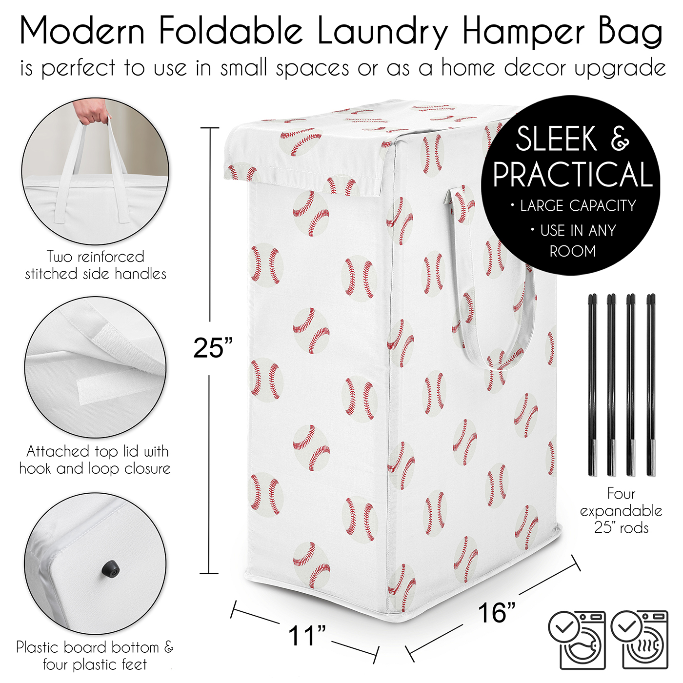 Includes: (1) Modern Laundry Hamper: 16in. x 11in. x 25in. and (4) Foldable Glass Fiber Rods, 24in. EachFeaturing exclusive canvas fabric of a red and white baseballs print. To wash fabric, remove rods and machine wash cold, tumble dry low.This foldable hamper sorter is the perfect laundry organizer for every member of your family. Tote your dirty clothes around using the 2 reinforced handles with durable stitching without worry of handles tearing. When you’re not using the hamper and ready to save some space, simply remove the fiber rods from each of the four corners of the bin to collapse down into a small rectangle to store easily under the bed, in your closet, in your bathroom cabinet, or next to your dresser.The rectangular shape of the clothes hamper gives a sleek and practical look that compliments any interior design style. Get one for every room in the home – ideal for nurseries, bedrooms, playrooms, laundry rooms, guest rooms, bathrooms, kids bed rooms, closets, dens, attics, basements, and college dorms. If you want to make laundry day a breeze, buy two for each room so dark and light dirty clothing can be sorted, organized and ready to wash before you bring it to the machine.Makes the perfect gift to coordinate with Sweet Jojo Designs nursery bedding, adult duvets and comforter sets, changing pad covers, crib sheets, home decor accessories, storage solutions and window treatments! It can also double as a functional decorative alternative to gift bags or wrapping paper by placing your birthday, baby shower or gender reveal presents within the hamper itself so it can later be reused by the recipient.Item# Laundry-BaseballPatch-PRT