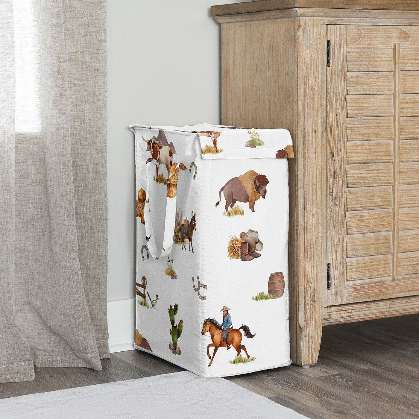 UPGRADE YOUR HOME STORAGE: with a Modern Laundry Basket that measures 16in. x 11in. x 25in. & includes (4) Foldable Glass Fiber Rods, 24in. each. Made with exclusive canvas fabric that is easy to wash by removing the rods & machine wash cold, tumble dry low. This laundry bag features an exclusive design of brown, red, white & blue steer, cow, desert, cactus, farm animal print for Western Collection to bring your wild west themed room together & upgrade both your bedroom decor & clothes storage!DESIGNED IN THE USA: By real parents who understand the need for practicality & style in collapsible laundry baskets. Sweet Jojo Designs is a small, women owned business. The mom's on our team know decorative laundry baskets are a priority for your laundry room organization or home storage needs. We use top fabrics & designs to create a laundry hamper with lid to fit your vision. We've studied the latest trends in western country foldable laundry basket for boys to bring you the finest product.SLIM & DURABLE: This laundry bin is the perfect laundry organizer for every member of your family. Tote your dirty clothes around using the 2 reinforced handles with durable stitching without worry of handles tearing. When you’re not using the hamper & ready to save some space, simply remove the fiber rods from each of the four corners of the basket with lid to collapse down into a small rectangle to store easily under the bed, in your closet, in your bathroom cabinet, or next to your dresser.INTERIOR DESIGN MAKEOVER: The rectangular shape of the clothes hamper gives a sleek & practical look that compliments any interior design style. Get one for every room in the home – ideal for nurseries, bedrooms, playrooms, laundry rooms, guest rooms, bathrooms, kids bed rooms, closets, dens, attics, basements & college dorms. If you want to make laundry day a breeze, buy 2 for each room so dark & light dirty clothing can be sorted, organized & ready to wash before you bring it to the machine!MATCHING DECOR & ACCESORIES: This dirty clothes hamper makes the perfect gift to coordinate with Sweet Jojo Designs nursery bedding, duvets and comforter sets, changing pad covers, crib sheets, home decor accessories, storage solutions & window treatments! It can also double as a functional decorative alternative to gift bags or wrapping paper by placing your birthday, baby shower or gender reveal presents within the collapsible laundry basket itself so it can later be reused by the recipient.Item# Laundry-CountryWestern-PRT