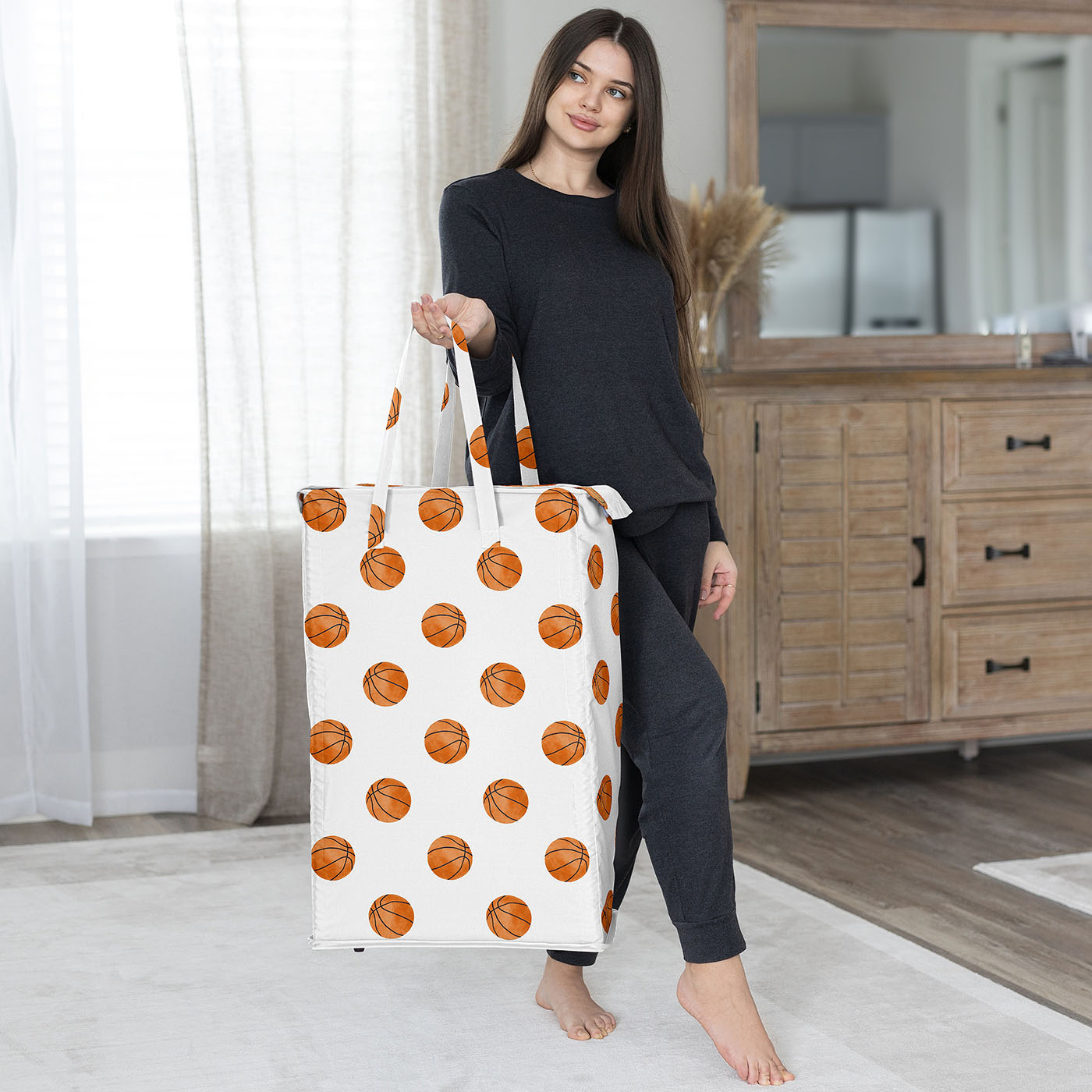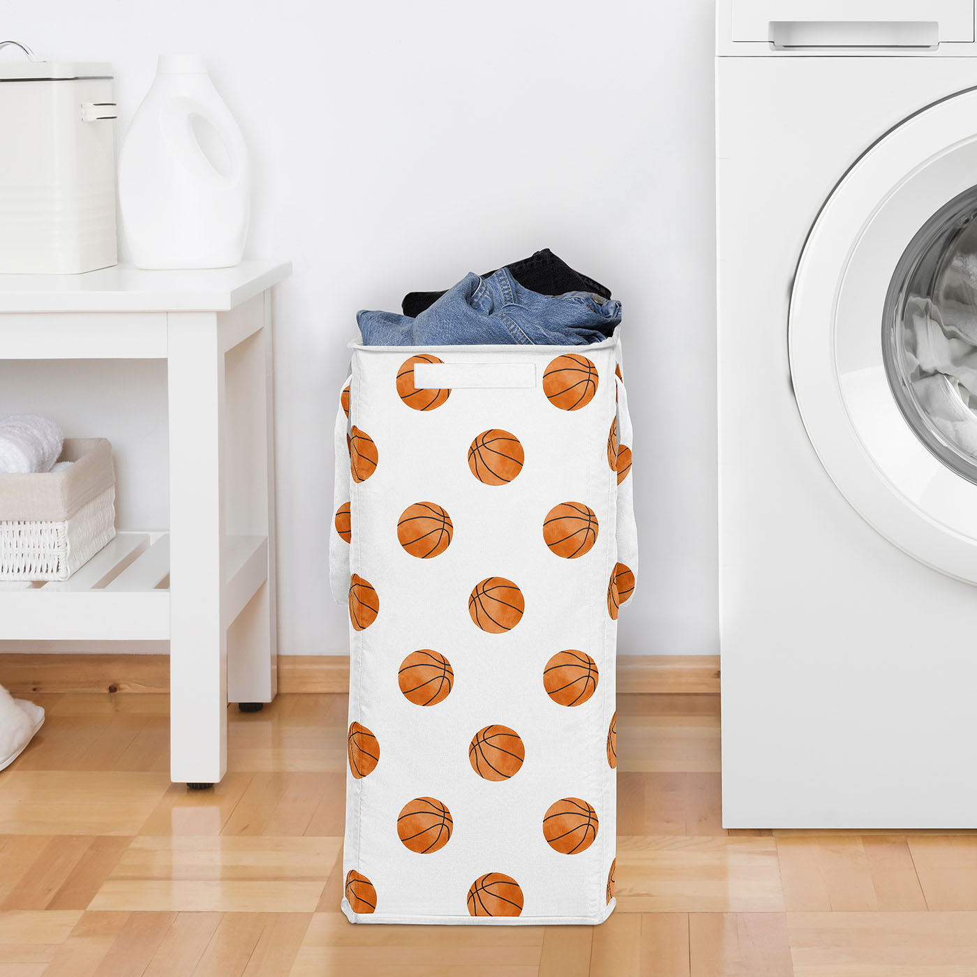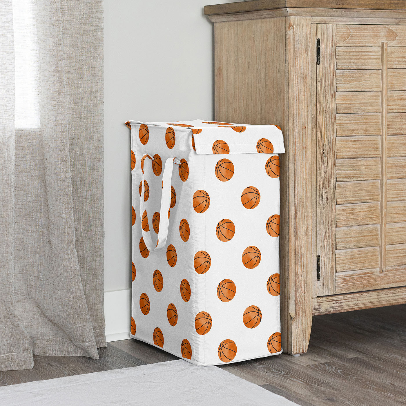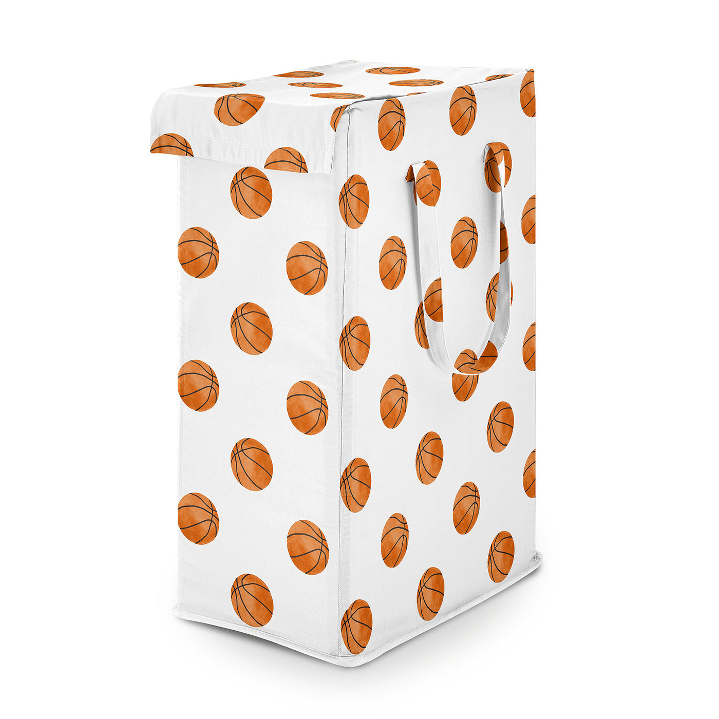 UPGRADE YOUR HOME STORAGE: with a Modern Laundry Basket that measures 16in. x 11in. x 25in. & includes (4) Foldable Glass Fiber Rods, 24in. each. Made with exclusive canvas fabric that is easy to wash by removing the rods and machine wash cold, tumble dry low. This laundry bag features an exclusive design of white and orange basketballs for the Watercolor, Vintage, Sports Theme Collection to bring your basketball themed room together and upgrade both your bedroom decor and clothes storage!DESIGNED IN THE USA: By real parents who understand the need for practicality and style in collapsible laundry baskets. Sweet Jojo Designs is a small, women owned business. The mom's on our team know decorative laundry baskets are a priority for your laundry room organization or home storage needs. We use top fabrics and designs to create a laundry hamper with lid to fit your vision. We've studied the latest trends in basketball foldable laundry basket for boys to bring you the finest product.SLIM & DURABLE: This laundry bin is the perfect laundry organizer for every member of your family. Tote your dirty clothes around using the 2 reinforced handles with durable stitching without worry of handles tearing. When you’re not using the hamper & ready to save some space, simply remove the fiber rods from each of the four corners of the basket with lid to collapse down into a small rectangle to store easily under the bed, in your closet, in your bathroom cabinet, or next to your dresser.INTERIOR DESIGN MAKEOVER: The rectangular shape of the clothes hamper gives a sleek & practical look that compliments any interior design style. Get one for every room in the home – ideal for nurseries, bedrooms, playrooms, laundry rooms, guest rooms, bathrooms, kids bed rooms, closets, dens, attics, basements & college dorms. If you want to make laundry day a breeze, buy 2 for each room so dark & light dirty clothing can be sorted, organized & ready to wash before you bring it to the machine!MATCHING DECOR & ACCESORIES: This dirty clothes hamper makes the perfect gift to coordinate with Sweet Jojo Designs nursery bedding, duvets and comforter sets, changing pad covers, crib sheets, home decor accessories, storage solutions & window treatments! It can also double as a functional decorative alternative to gift bags or wrapping paper by placing your birthday, baby shower or gender reveal presents within the collapsible laundry basket itself so it can later be reused by the recipient.Item# Laundry-Sports-BU-BASKETBALL