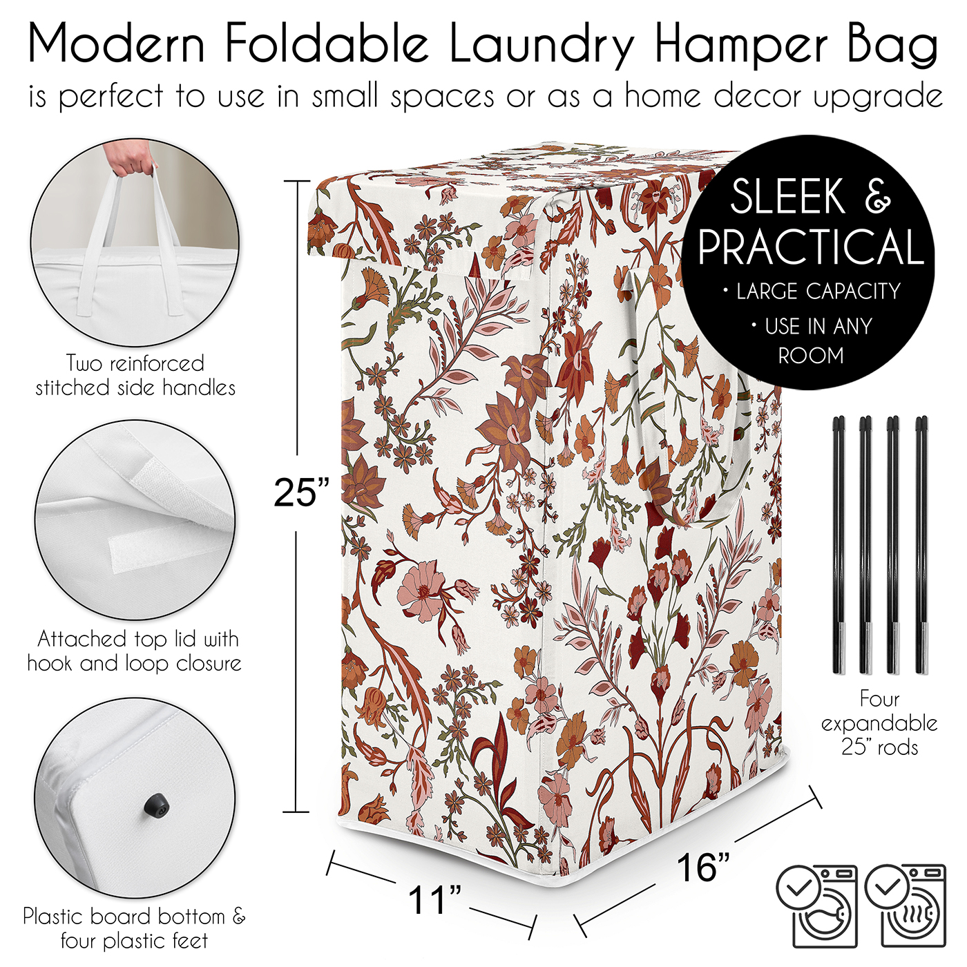 UPGRADE YOUR HOME STORAGE: with a Modern Laundry Basket that measures 16in. x 11in. x 25in. & includes (4) Foldable Glass Fiber Rods, 24in. each. Made with exclusive canvas fabric that is easy to wash by removing the rods and machine wash cold, tumble dry low. This laundry bag features an exclusive design of burgundy, green, maroon, pink and off white botanical leaf, daisy, flower leaves for the Rustic Paisley Garden Bohemian Wildflower Collection to bring your farmhouse themed room together.DESIGNED IN THE USA: By real parents who understand the need for practicality & style in collapsible laundry baskets. Sweet Jojo Designs is a small, women owned business. The mom's on our team know decorative laundry baskets are a priority for your laundry room organization or home storage needs. We use top fabrics & designs to create a laundry hamper with lid to fit your vision. We've studied the latest trends in bohemian floral foldable laundry basket for girls to bring you the finest product.SLIM & DURABLE: This laundry bin is the perfect laundry organizer for every member of your family. Tote your dirty clothes around using the 2 reinforced handles with durable stitching without worry of handles tearing. When you’re not using the hamper & ready to save some space, simply remove the fiber rods from each of the four corners of the basket with lid to collapse down into a small rectangle to store easily under the bed, in your closet, in your bathroom cabinet, or next to your dresser.INTERIOR DESIGN MAKEOVER: The rectangular shape of the clothes hamper gives a sleek & practical look that compliments any interior design style. Get one for every room in the home – ideal for nurseries, bedrooms, playrooms, laundry rooms, guest rooms, bathrooms, kids bed rooms, closets, dens, attics, basements & college dorms. If you want to make laundry day a breeze, buy 2 for each room so dark & light dirty clothing can be sorted, organized & ready to wash before you bring it to the machine!MATCHING DECOR & ACCESORIES: This dirty clothes hamper makes the perfect gift to coordinate with Sweet Jojo Designs nursery bedding, duvets and comforter sets, changing pad covers, crib sheets, home decor accessories, storage solutions & window treatments! It can also double as a functional decorative alternative to gift bags or wrapping paper by placing your birthday, baby shower or gender reveal presents within the collapsible laundry basket itself so it can later be reused by the recipient.Item# Laundry-WildFlower-IV-OR-PRT