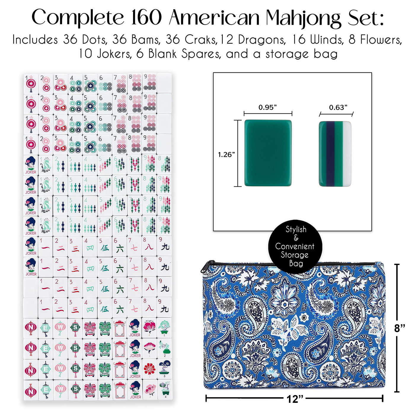 THIS AMERICAN MAHJONG SET INCLUDES: (160) 4 Layer Mahjong Tiles measure 1.2in x 0.9in x 0.5in each & carry bag. Made from a durable & easy to clean acrylic material that is resistant to scratches, fading & chipping to hold up for decades of use. This mahjong set offers a tactile experience, from the weight & texture of the tiles to the satisfying sound they make when shuffled, making each round feel more engaging & memorable. Perfect for casual beginners & professionals. DOES NOT INCLUDE RACKSDESIGNED IN THE USA: Each American mahjong tile set is designed by real players from a small, woman & family owned business. It's made with polished premium engravings & painted with clear details for authentic game play. The bright 160 mah jong tiles included in this beautiful mahjong set are 36 Dots, 36 Bams, 36 Craks, 12 Dragons, 16 Winds, 16 Flowers, 10 Jokers & 4 Blank Spares. The unique characters, symbols, & numbers deepen the appreciation for the strategy & Chinese tradition of the game!UPGRADE FAMILY GAME NIGHT: Impress everyone at your next game night when you break out this mahjong tiles set American! Playing a mahjong tile game is a great option for a screen free entertainment activity that also offers cognitive benefits. Help support mental stimulation by encouraging strategic thinking, pattern recognition, memory development & quick decision-making. Keep your mind sharp while still being enjoyable & social. Please note: complies with American Mahjong rules & gameplay.COLLECTIBLE VALUE: Many American mahjong tiles are beautifully designed with intricate artwork, making them appealing to collectors. Whether you appreciate artistic craftsmanship, want a display-worthy piece, or enjoy collecting traditional games, American mahjong sets serves as both a playable item and a meaningful collectible that stands out. Plus, this mahjong game set can double as stylish decor, adding character to living rooms, game rooms, or display shelves to enhance your home decor.BEST GIFT: A Mahjong set American makes a thoughtful & unique gift for game lovers, collectors, or anyone who enjoys cultural experiences. The combination of beauty, tradition, & entertainment makes it perfect for birthdays, anniversaries, housewarmings, or special occasions or give mahjong gifts as a thoughtful present for holidays like Easter, Christmas, Hanukkah, Mother's Day or Father's Day. It’s a memorable present that offers ongoing enjoyment & encourages bonding with friends and family.Item# Mahj-Lady-DKGR