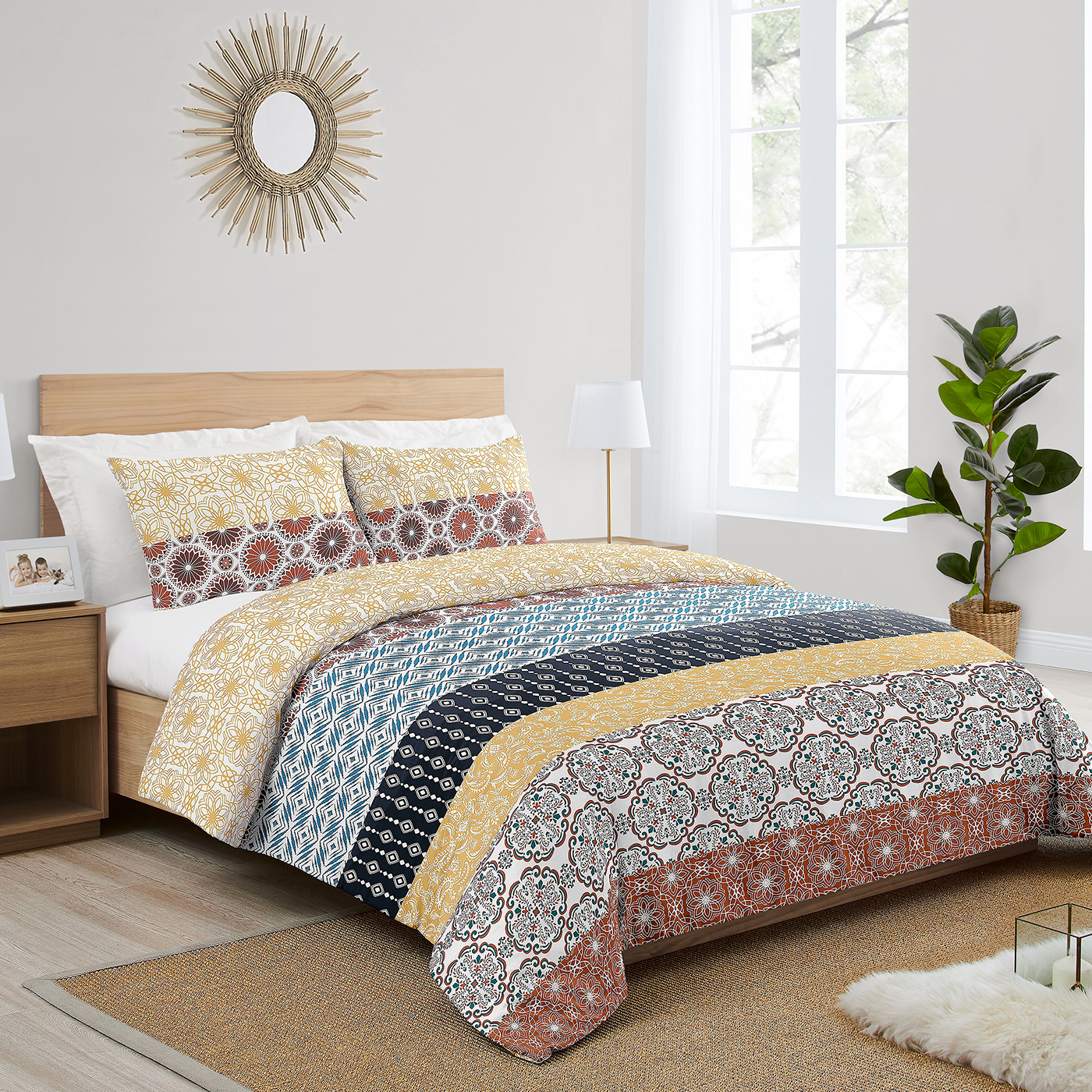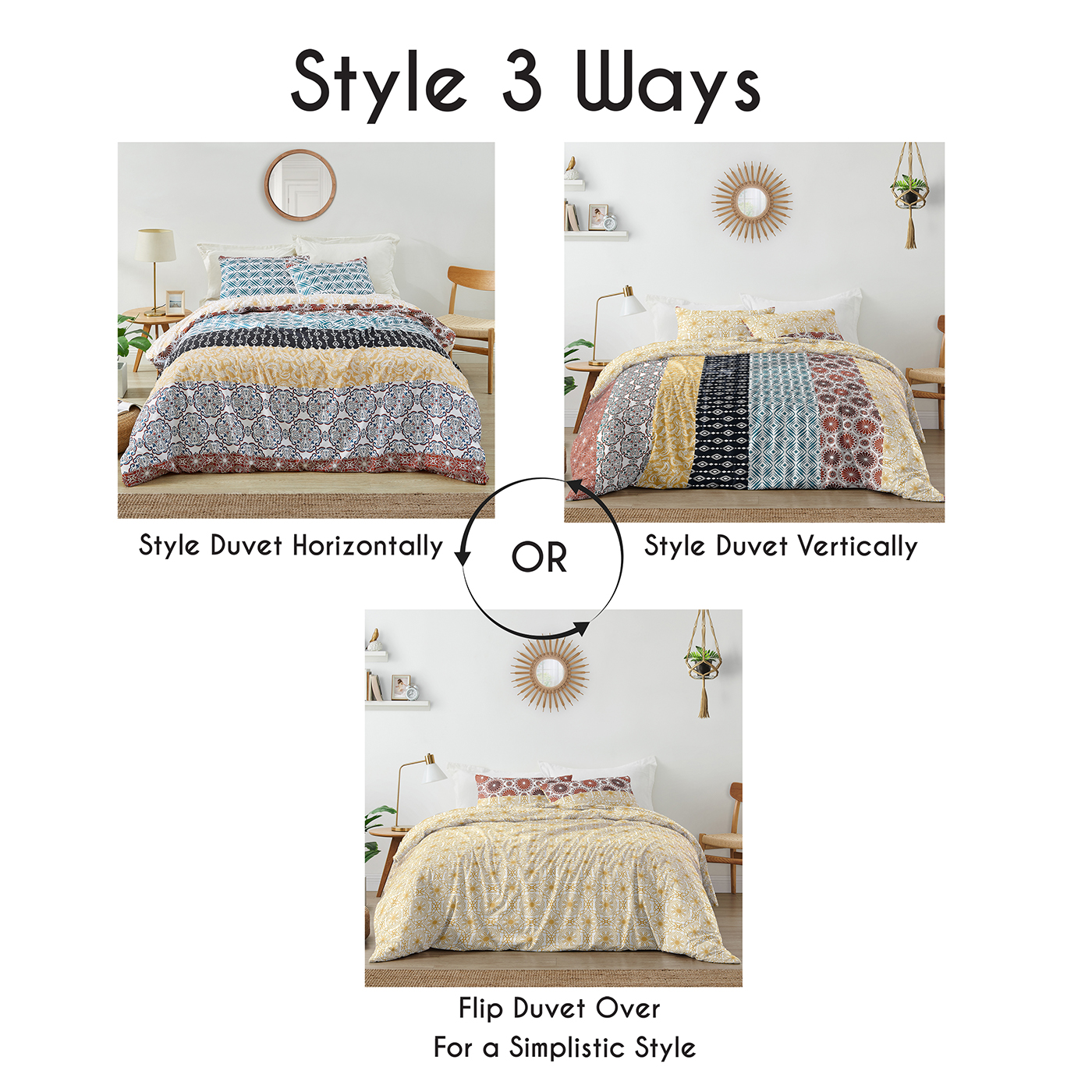 Design: This design has an intricate boho mandala pattern with each section featuring a distinct and unique design. It uses the gorgeous color palette of teal, rust, mustard yellow, and black. OR you can flip this bedding over to the back for a completely new look. The back side of this duvet features a Yellow and White geometric pattern for a simplier look.Set and Dimensions: 1 Full / Queen Duvet Cover (90 in x 90in) and 2 Standard Shams (20in x 26in). (Does not include comforter insert)Materials and Care: Brushed Microfiber- extremely soft and wrinkle resistant. Machine washable. Tumble dry low. Features: Hidden zipper closures on both duvet cover and sham make inserting and removing your comforter and pillow quick and easy. Matching Accessories: We offer coordinating bedding sets, decorative throw pillows, shower curtains, window panels, pouf covers, bed skirts, body pillows and more. Please check our store for these accessories.Item# Medallion-Duvet-Q