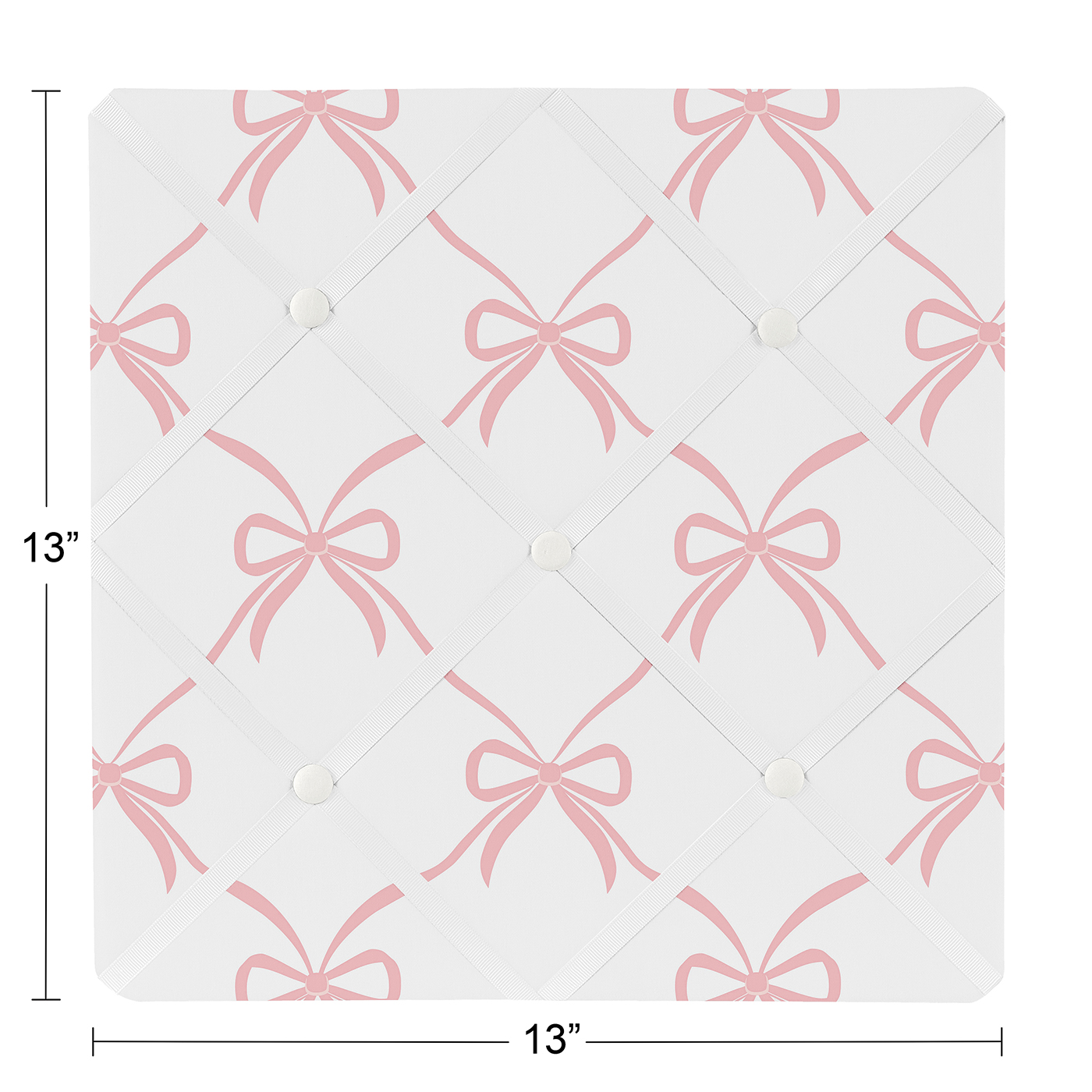 WALL HANGING DECOR MUST HAVE INCLUDES: Memory Board (13in. x 13in.). This fabric covered bulletin board was designed in the USA with a sturdy brushed microfiber fabric. Spot clean only. This shabby chic baby girl picture board would pair perfectly with coordinating bedding sets & match with the Blush Pink and White Bow, Dancer, Princess, Ballet Collection accessories to complete any room in your home, including your newborn/infants nursery, bedroom, kitchen, office or living room themed look.ELEGANT BOWS THEME: This girls blush pink and white elegant, classic, delicate & feminine ballet, dancer, princess, bows print tied with a simple knot is adorned with solid white coordinating button detail and decorative ribbon that effortlessly blend style and sophistication, making them a standout addition to any wall decor bedroom and create a glam and coquette aesthetic. Note: Pushpins cannot be used with this memo board. The decorative ribbon is designed to slip your mementos behind them.DESIGNED IN USA TO BE SAFE & DURABLE: This small bulletin board is designed with metal hangers on the back for easy hanging on your wall. With these hangers, there is no assembly needed! Use the decorative ribbon on this photo board so that you can insert photos, notes, and memos to serve as a decorative piece to any room. Our products are crafted with premium materials and details to have your nursery theme or room theme come alive & help design the perfect space for you and your little one.PERFECT GIFT: Add a baby girl picture board for photos to your list of must haves! Include this decorative bulletin board along with a coordinating crib bedding set or toddler bedding set on your gift registry, in a baby shower gift basket or as a gender reveal present is an easy way to prepare for a baby's arrival. These small bulletin board for wall works with any chic room in your home & the perfect gift for women! This elegant bow design makes it the perfect addition to any generation.MATCHING DECOR & ACCESORIES: Match your favorite Sweet Jojo Designs home decor with our fabric bulletin boards to coordinate perfectly and create a cohesive look to add a personalized touch to your space! Complete any room in your home with our coordinating room decor such as crib bedding sets, toddler bedding sets, twin bedding sets, queen bedding sets, window treatment panels, valances, throw pillows, hampers, wall decor, sheet sets, shower curtains and more. Item# Memo-Ballet-BOW