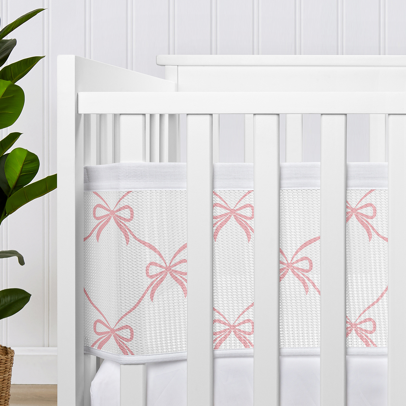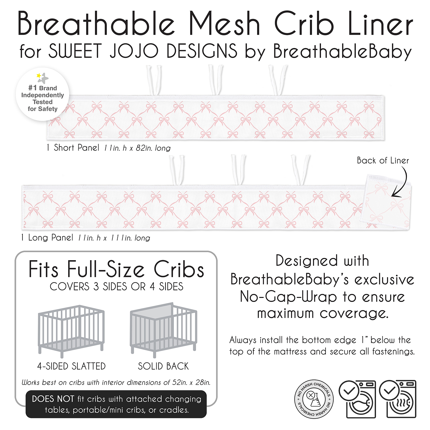 Sweet Jojo Designs + BreathableBaby Mesh Crib Liner Includes: (1) Long Panel Mesh Liner: 11in. x 111in. and (1) Short Panel Mesh Liner: 11in. x 82in. specifically designed for standard crib styles (such as solid back and 4-sided slatted style) sold in North America and incorporates BreathableBaby patented technology with our most popular designs. DOES NOT FIT and should never be used in cribs with attached changing tables, cradles, toddler beds, bassinets, portable/mini cribs or solid end cribs.Made of a single-layer of 100% polyester Classic Mesh with A.C.T. Air Channel Technology (3 mm thick) to better stay taut to sides and feature a light blocking rating of >85%. It’s finished with reinforced fabric ties and a 1” (2.54 cm) polyester trim on top and bottom. Always install the bottom edge 1” below the top of the mattress and secure all fastenings. Wash separately. Machine wash cold, tumble dry low.This mesh crib liner features a shabby chic, dancer, princess coquette bows with complimentary color palette from the matching Sweet Jojo Designs Ballerina and Ballet Bow bedding collection of blush pink and white.Mesh crib liners are essential for providing the ideal solution to a painful and disruptive problem: helps keep arms and legs safely inside the crib without the risk of restricted airflow. And, as an added bonus, besides perfectly matching your Sweet Jojo Designs baby bedding set, mesh liners also provide a visual shield to help provide a more peaceful night's sleep. Not to mention, they keep pacifiers inside and within reach!Please note: Keep liner tight against side of crib and do not use if liner is loose or sags down toward sleeping surface. Never place any other soft items in a crib with baby. Only use in a crib without broken parts or missing slats. Always position ties outside of crib and secure tightly to prevent entanglement and remove liner when baby can pull to a stand.Item# Mesh-Ballet-BOW