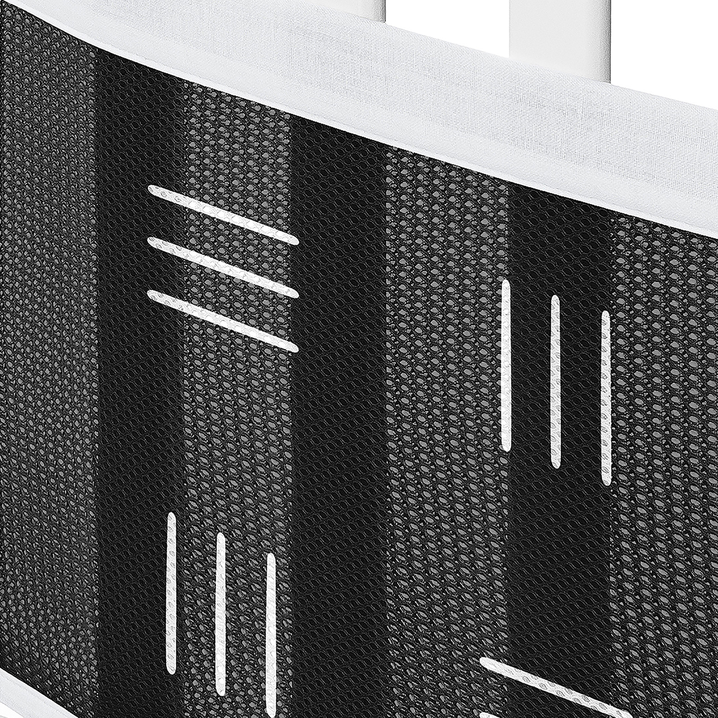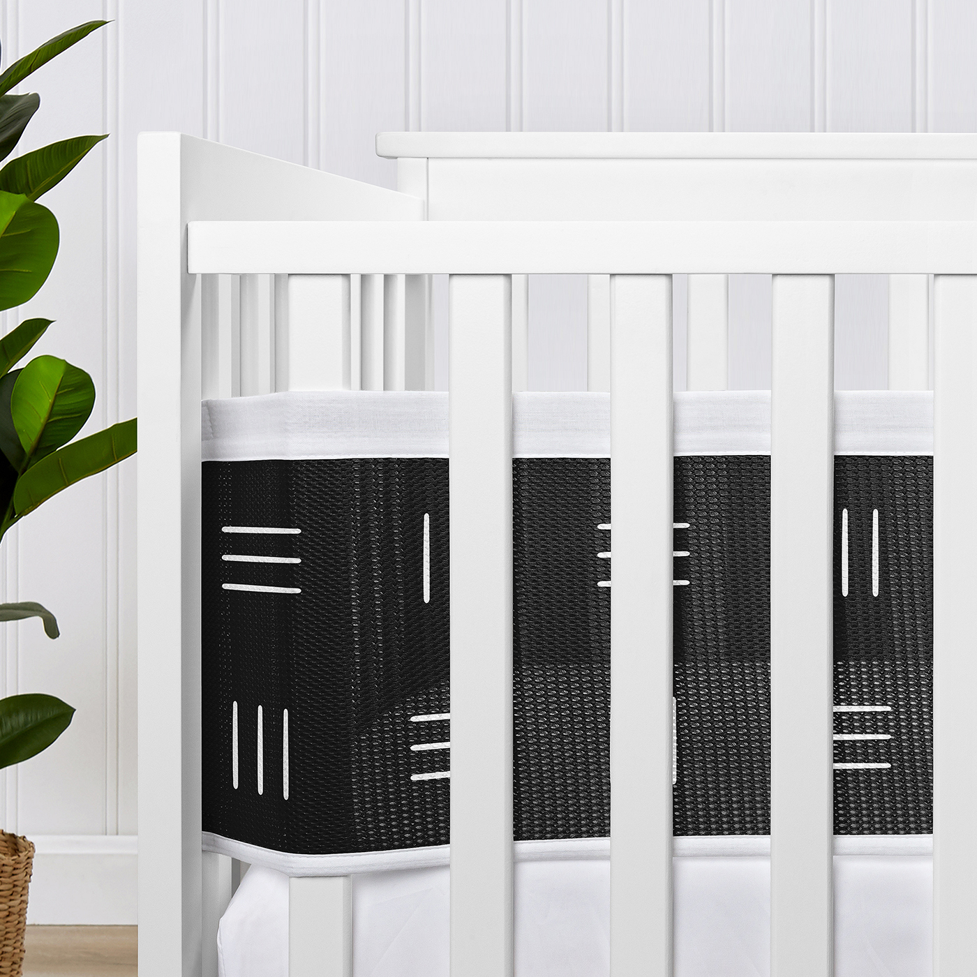 Sweet Jojo Designs + BreathableBaby Mesh Crib Liner Includes: (1) Long Panel Mesh Liner: 11in. x 111in. and (1) Short Panel Mesh Liner: 11in. x 82in. specifically designed for standard crib styles (such as solid back and 4-sided slatted style) sold in North America and incorporates BreathableBaby patented technology with our most popular designs. DOES NOT FIT and should never be used in cribs with attached changing tables, cradles, toddler beds, bassinets, portable/mini cribs or solid end cribs.Made of a single-layer of 100% polyester Classic Mesh with A.C.T. Air Channel Technology (3 mm thick) to better stay taut to sides and feature a light blocking rating of >85%. It’s finished with reinforced fabric ties and a 1” (2.54 cm) polyester trim on top and bottom. Always install the bottom edge 1” below the top of the mattress and secure all fastenings. Wash separately. Machine wash cold, tumble dry low.This mesh crib liner features a boho mudcloth hatch print with complimentary color palette from the matching Sweet Jojo Designs Boho Hatch bedding collection of black and white.Mesh crib liners are essential for providing the ideal solution to a painful and disruptive problem: helps keep arms and legs safely inside the crib without the risk of restricted airflow. And, as an added bonus, besides perfectly matching your Sweet Jojo Designs baby bedding set, mesh liners also provide a visual shield to help provide a more peaceful night's sleep. Not to mention, they keep pacifiers inside and within reach!Please note: Keep liner tight against side of crib and do not use if liner is loose or sags down toward sleeping surface. Never place any other soft items in a crib with baby. Only use in a crib without broken parts or missing slats. Always position ties outside of crib and secure tightly to prevent entanglement and remove liner when baby can pull to a stand.Item# Mesh-Hatch-BK-WH