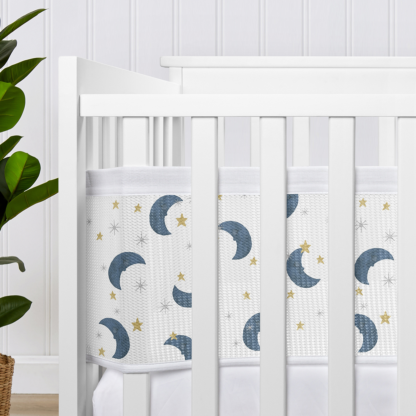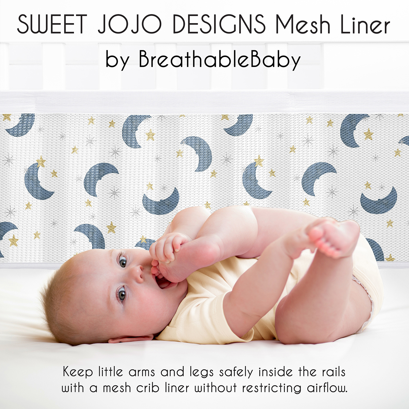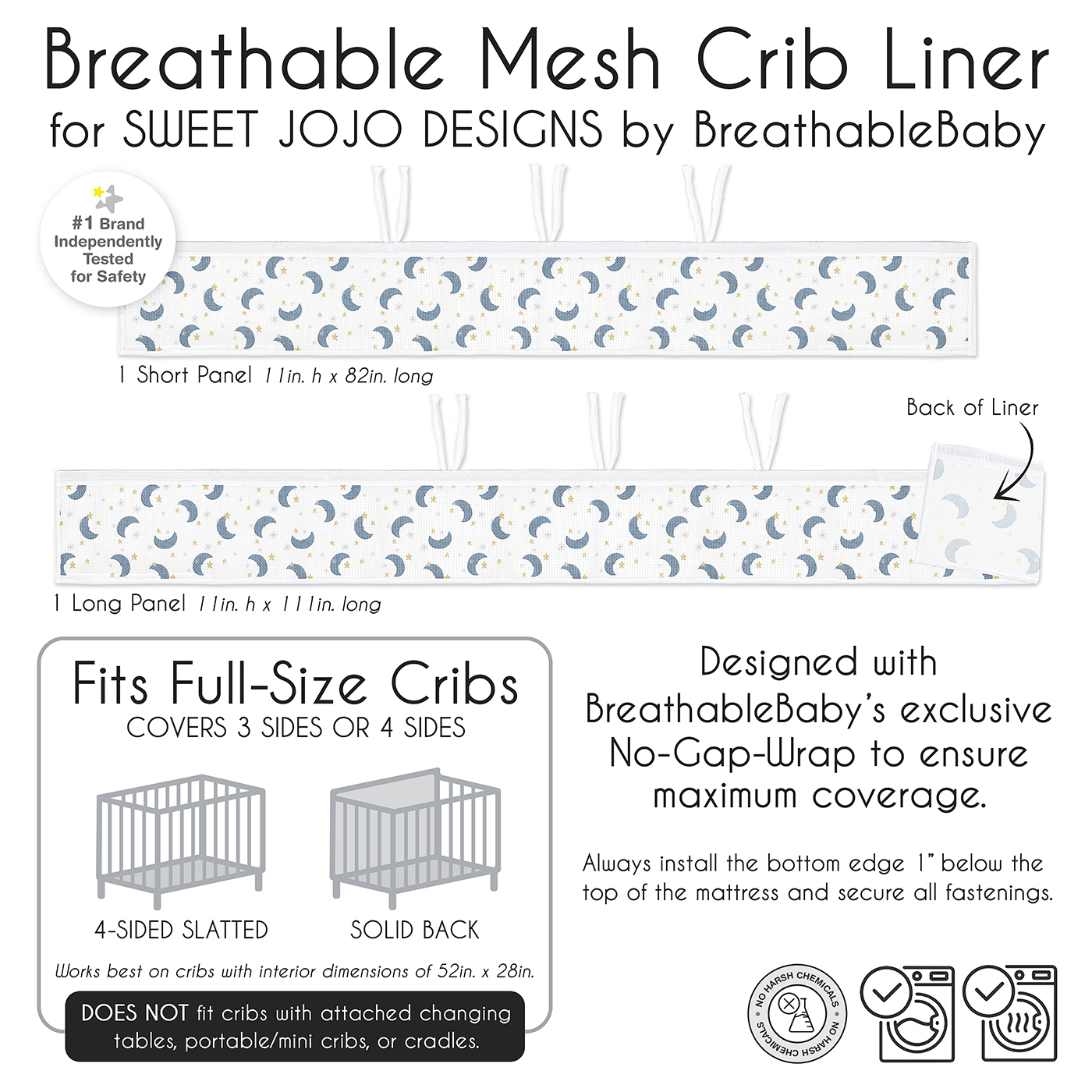 Sweet Jojo Designs + BreathableBaby Mesh Crib Liner Includes: (1) Long Panel Mesh Liner: 11in. x 111in. and (1) Short Panel Mesh Liner: 11in. x 82in. specifically designed for standard crib styles (such as solid back and 4-sided slatted style) sold in North America and incorporates BreathableBaby patented technology with our most popular designs. DOES NOT FIT and should never be used in cribs with attached changing tables, cradles, toddler beds, bassinets, portable/mini cribs or solid end cribs.Made of a single-layer of 100% polyester Classic Mesh with A.C.T. Air Channel Technology (3 mm thick) to better stay taut to sides and feature a light blocking rating of >85%. It’s finished with reinforced fabric ties and a 1” (2.54 cm) polyester trim on top and bottom. Always install the bottom edge 1” below the top of the mattress and secure all fastenings. Wash separately. Machine wash cold, tumble dry low.This mesh crib liner features a celestial sky watercolor moon and star print with complimentary color palette from the matching Sweet Jojo Designs Bear Moon bedding collection of navy blue, gold, and white.Mesh crib liners are essential for providing the ideal solution to a painful and disruptive problem: helps keep arms and legs safely inside the crib without the risk of restricted airflow. And, as an added bonus, besides perfectly matching your Sweet Jojo Designs baby bedding set, mesh liners also provide a visual shield to help provide a more peaceful night's sleep. Not to mention, they keep pacifiers inside and within reach!Please note: Keep liner tight against side of crib and do not use if liner is loose or sags down toward sleeping surface. Never place any other soft items in a crib with baby. Only use in a crib without broken parts or missing slats. Always position ties outside of crib and secure tightly to prevent entanglement and remove liner when baby can pull to a stand.Item# Mesh-MoonBear-PRT