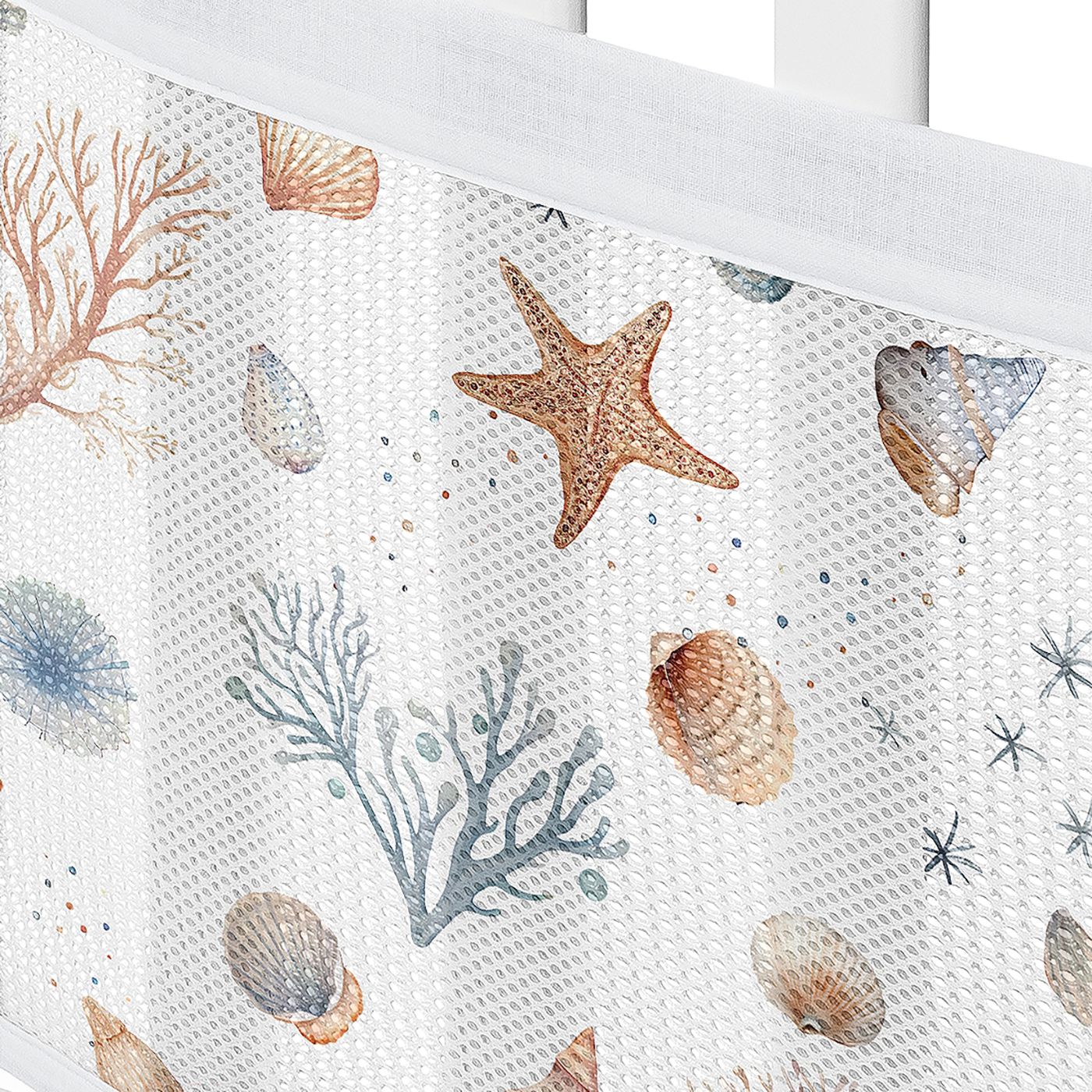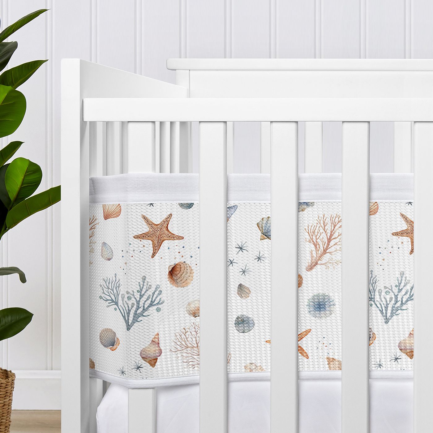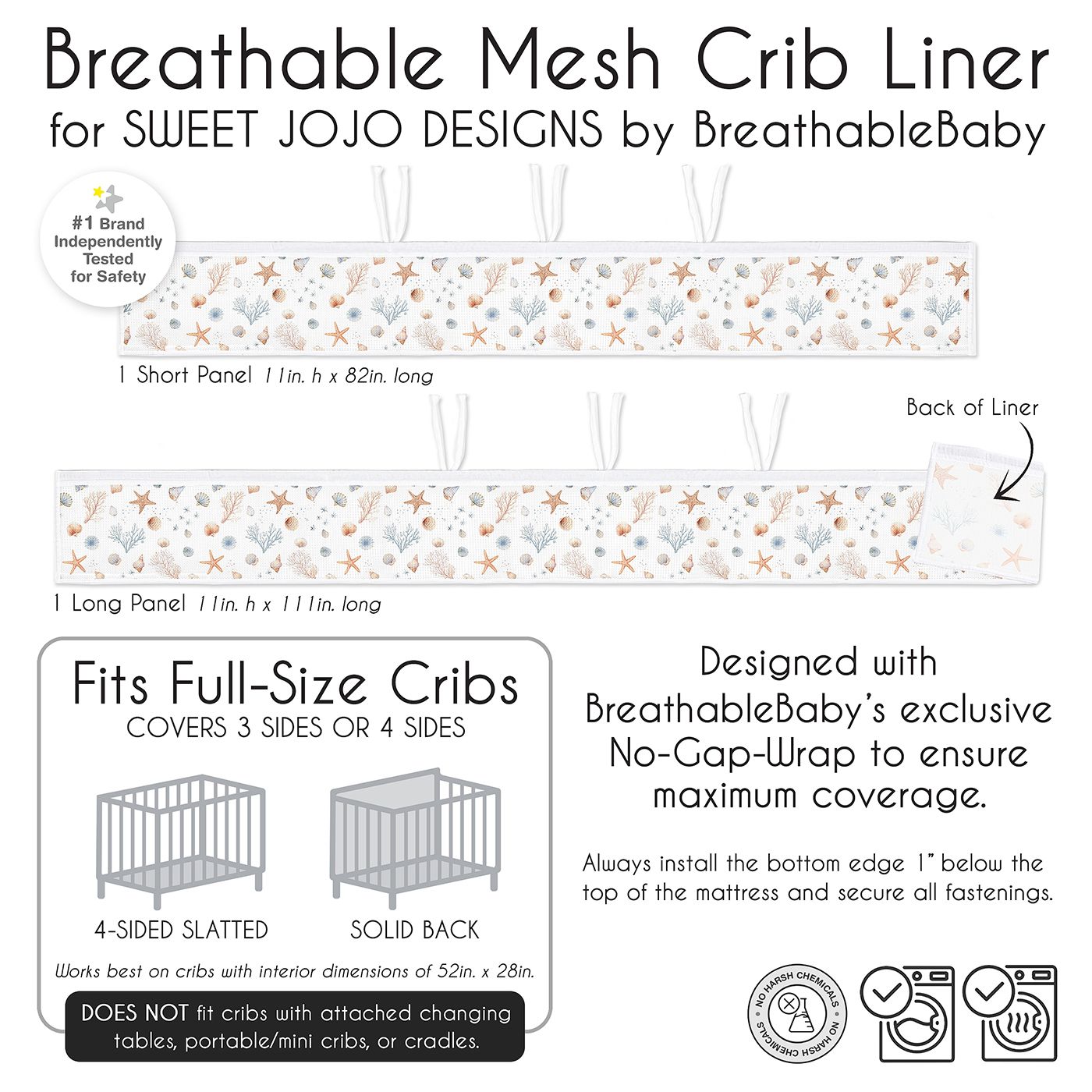 Sweet Jojo Designs + BreathableBaby Mesh Crib Liner Includes: (1) Long Panel Mesh Liner: 11in. x 111in. and (1) Short Panel Mesh Liner: 11in. x 82in. specifically designed for standard crib styles (such as solid back and 4-sided slatted style) sold in North America and incorporates BreathableBaby patented technology with our most popular designs. DOES NOT FIT and should never be used in cribs with attached changing tables, cradles, toddler beds, bassinets, portable/mini cribs or solid end cribs.Made of a single-layer of 100% polyester Classic Mesh with A.C.T. Air Channel Technology (3 mm thick) to better stay taut to sides and feature a light blocking rating of >85%. It’s finished with reinforced fabric ties and a 1” (2.54 cm) polyester trim on top and bottom. Always install the bottom edge 1” below the top of the mattress and secure all fastenings. Wash separately. Machine wash cold, tumble dry low.This mesh crib liner features a nautical, beach theme, coastal, cottage, watercolor, starfish, coastal, sea shell, aquatic, nature, ocean seashells print with complimentary color palette from the matching Sweet Jojo Designs Ocean Seashell bedding collection of rust orange, blue, taupe and beige.Mesh crib liners are essential for providing the ideal solution to a painful and disruptive problem: helps keep arms and legs safely inside the crib without the risk of restricted airflow. And, as an added bonus, besides perfectly matching your Sweet Jojo Designs baby bedding set, mesh liners also provide a visual shield to help provide a more peaceful night's sleep. Not to mention, they keep pacifiers inside and within reach!Please note: Keep liner tight against side of crib and do not use if liner is loose or sags down toward sleeping surface. Never place any other soft items in a crib with baby. Only use in a crib without broken parts or missing slats. Always position ties outside of crib and secure tightly to prevent entanglement and remove liner when baby can pull to a stand.Item# Mesh-SeaShell-RU-BU