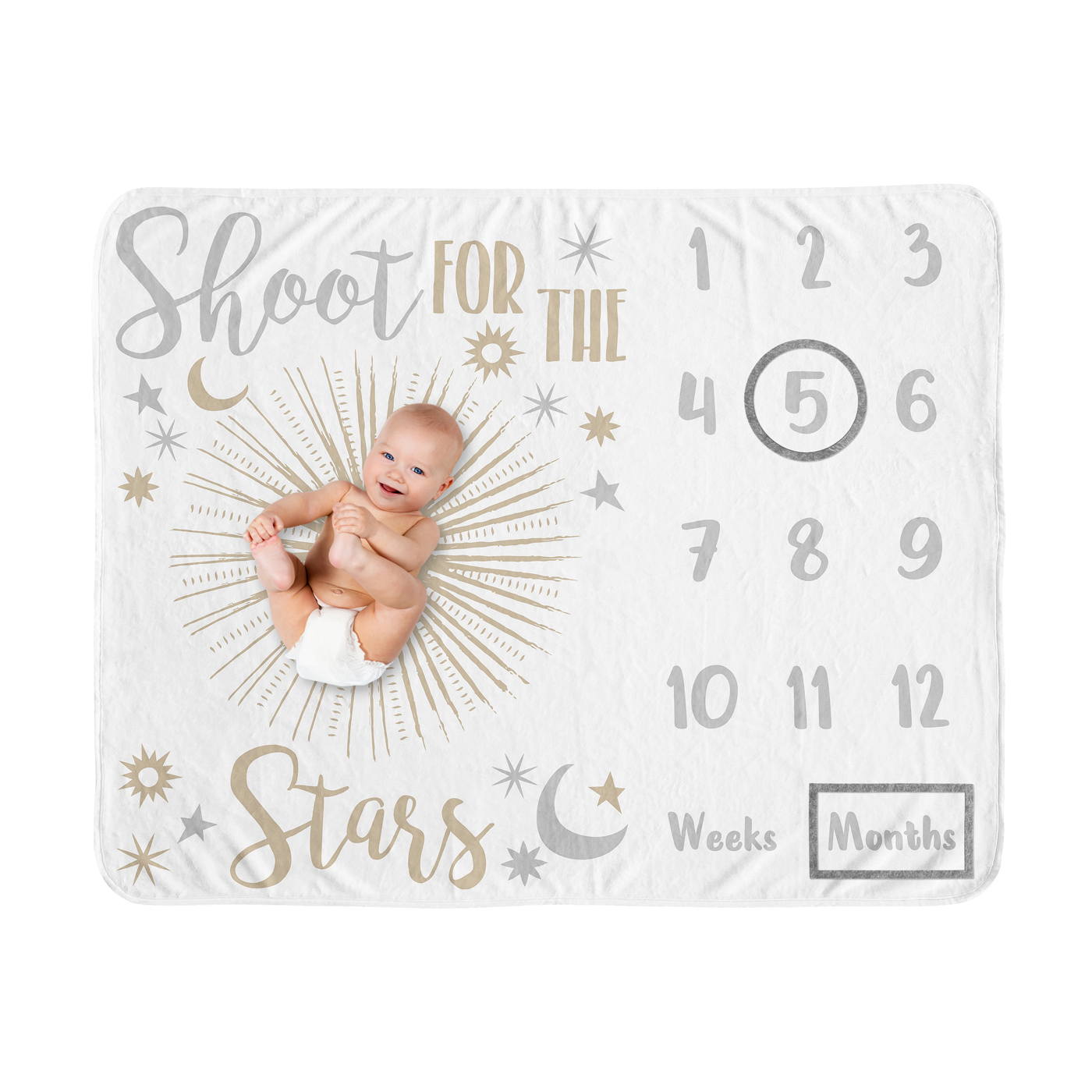 100% plush minky fleece featuring grey and gold stars and moons with an inspirational "Shoot For The Stars" quote