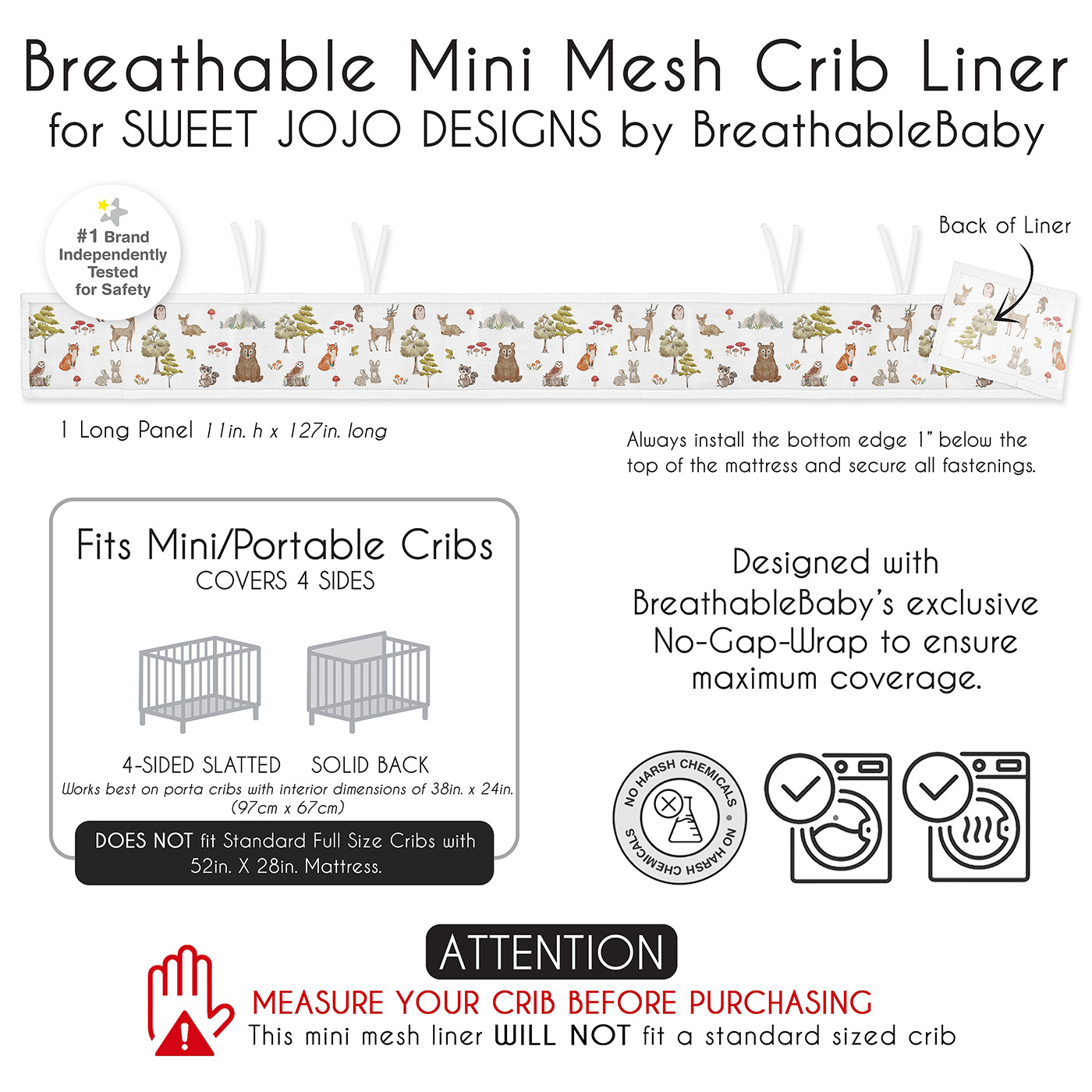 INCLUDES: (1) Long Panel Mini Mesh Liner: 11in. x 127in. This mesh liner for mini crib is specifically designed for 4 sided small cribs for small spaces, porta cribs, & portable cribs with interior dimensions of 38in. X 24in. sold in North America. DOES NOT FIT & should never be used in cribs with attached changing tables, cradles, toddler beds, bassinets, or solid end cribs. DOES NOT FIT standard full size cribs with 52in. X 28in. mattress. Wash separately. Machine wash cold, tumble dry low.SAFE & DURABLE: Made of a single-layer of 100% polyester Classic Mesh with A.C.T. Air Channel Technology (3 mm thick) to better stay taut to sides and feature a light blocking rating of >85%. It’s finished with reinforced fabric ties & a 1in. polyester trim on top & bottom. Always install the bottom edge 1in. below the top of the mini portable crib mattress and secure all fastenings. Sweet Jojo Designs is a proud member of the Baby Safety Alliance & tests products to meet CPSC safety standards.DESIGNED IN THE USA: By real parents who understand the need for comfort, practicality, and style. Sweet Jojo Designs is a small, women owned business. This gender neutral mini mesh crib liner features a woodland forest animals including hedgehog, deer & squirrel friend print in a farmhouse color palette of sage green, red, grey & brown. It coordinates with the Watercolor Woodland Forest Animals Collection making decorating your nursery easy with matching crib sheets, changing pad covers & more.MUST HAVE MINI CRIB ACCESSORIES: Mini crib breathable mesh liner are essential for providing the ideal solution to a painful and disruptive problem: helps keep arms and legs safely inside the mini small crib without the risk of restricted airflow. And, as an added bonus, besides perfectly matching your Sweet Jojo Designs baby crib bedding set, mini mesh liners also provide a visual shield to help provide a more peaceful night's sleep. Not to mention, they keep pacifiers inside and within reach!PRACTICE SAFE SLEEP: Please note: Keep mini liner tight against side of porta crib and do not use if mini liner is loose or sags down toward sleeping surface. Never place any other soft items in a crib with baby. Only use in mini cribs without broken parts or missing slats. Always position ties outside of portable crib for baby and secure tightly to prevent entanglement and remove mini liner when baby can pull to a stand. Item# MiniMesh-ForestAnimals