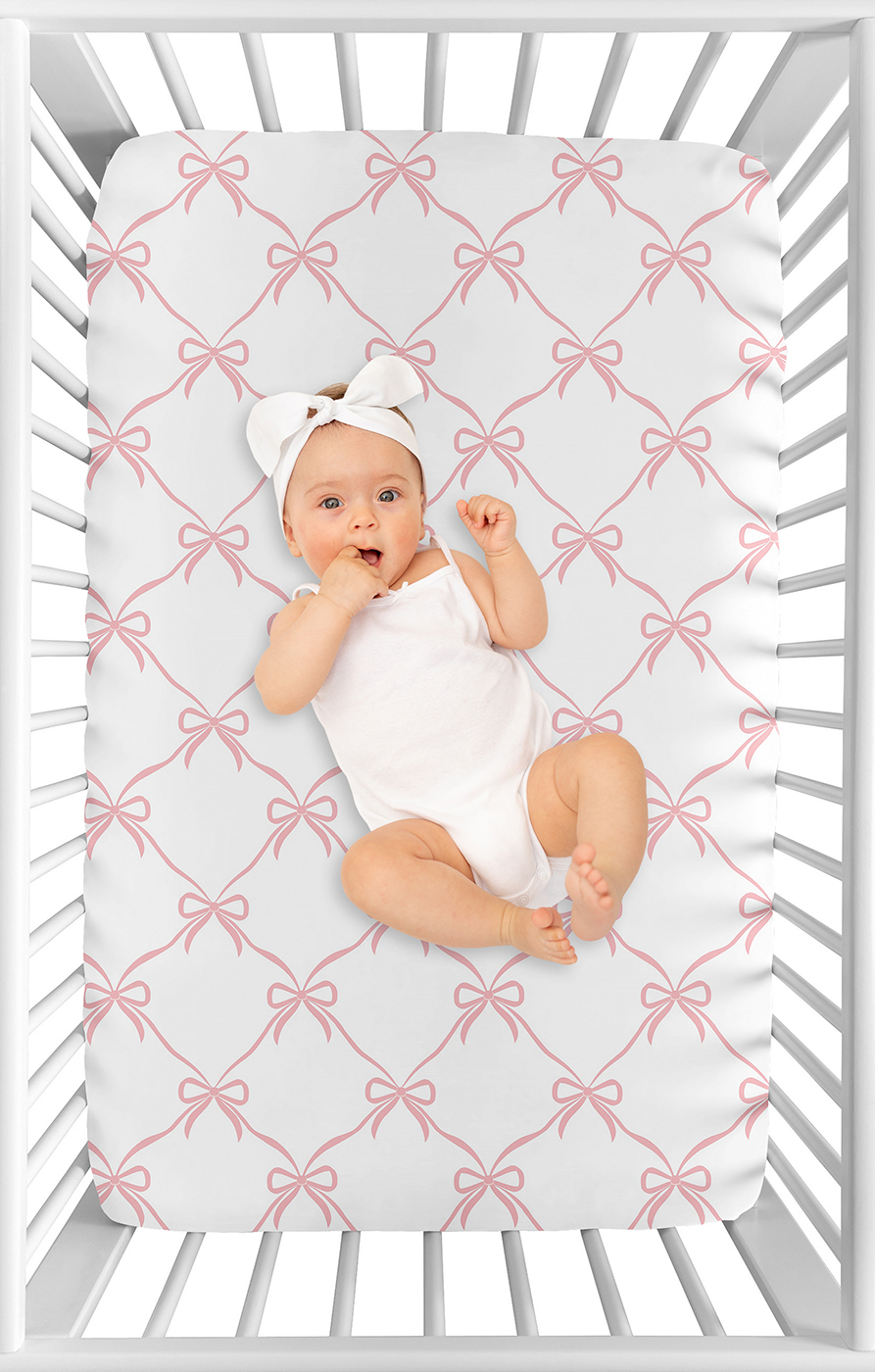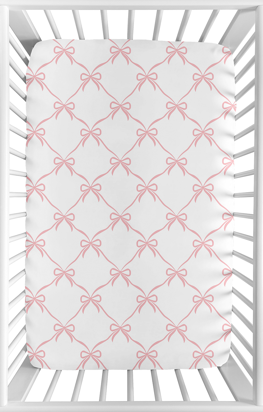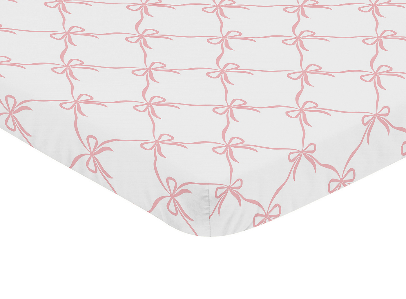 Includes: (1) Baby Mini Crib Sheet: 24in. x 38in. x 5in. pocket. WILL NOT FIT STANDARD SIZE CRIBS. Easy machine washable, tumble dry low.This brushed microfiber fitted mini crib sheet features an exclusive design of a shabby chic blush pink and white dancer princess bows print.Add a portable mini crib sheet to your list of must haves for your new bundle of joy! This soft mini sheet is the perfect combination of stretchy and comfortable fabric. Use the fully elastic bottom for a secure fit on most standard smaller crib sizes, mini cribs, pack and plays, and playards. Keep a mini mattress sheet in your newborn room and make sure you have extras to use in between washes. It's always important to be prepared if an accident happens in the crib.These baby sheets are also great to take with you when traveling. Most hotels provide pack n plays (double check sizing with your accommodations before you pack) when you request a bed for your tot. Rather than take your chances with unfamiliar or scratchy sheets provided where you're staying, bring a little piece of familiarity and comfort from home by bringing your own mini sheets on vacation. Add a play yard sheet to your new list of infant must haves to give them a restful night’s sleep. Grandparents who have grandbabies over for sleepovers will love to have a porta crib and adorable sheets to go with it. Makes the perfect gift to coordinate with Sweet Jojo Designs minicrib nursery bedding, changing pad covers, nursing pillow covers, nursery room decoration accessories and layette sets. Include It in your baby shower gift basket or gender reveal presents or add to your baby gift registry to ensure you have all you need to complete your Sweet Jojo Designs baby bed room look.Item# MiniSheet-Ballet-BOW
